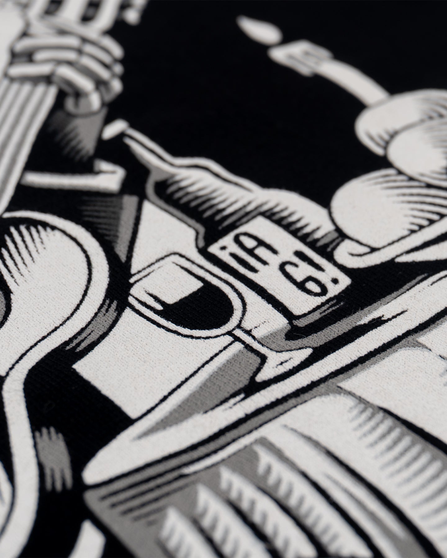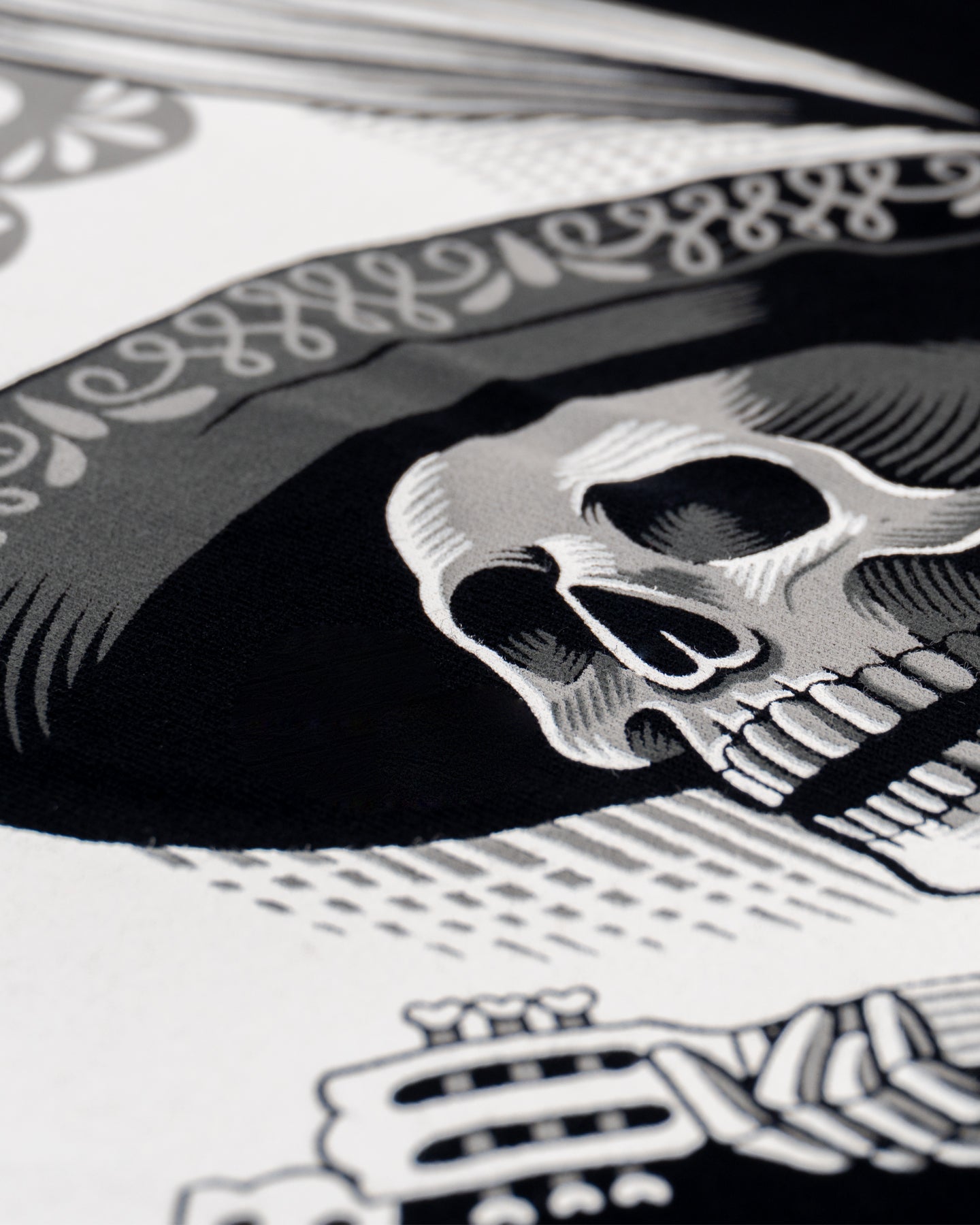 La playera Los Compadres es una obra que celebra la camaradería con un guiño al legado del artista mexicano José Guadalupe Posada y sus famosas Catrinas. Este diseño no es solo una imagen, es una ingeniosa ilusión óptica.