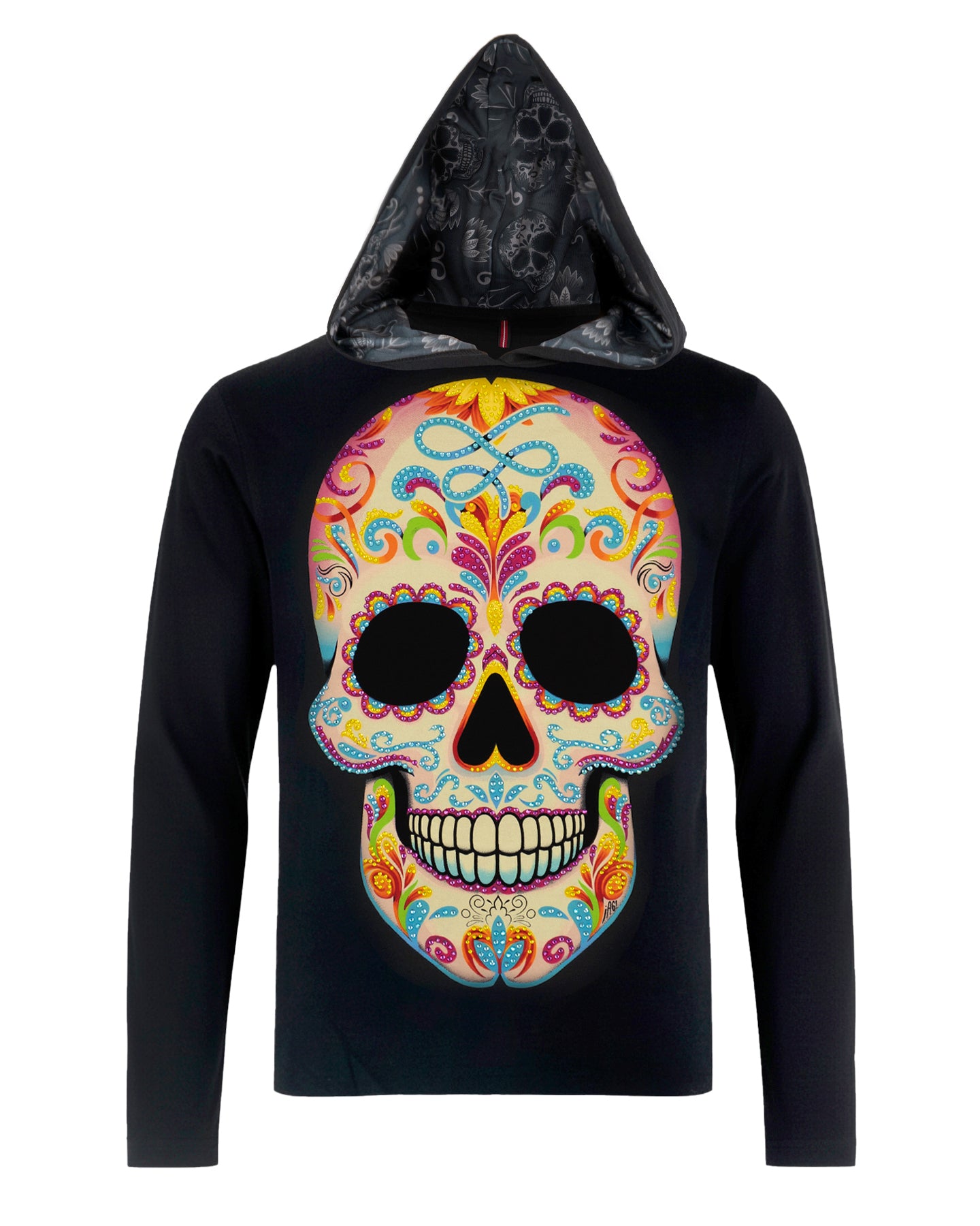 Esta playera con capucha fusiona la tradición vibrante del Día de Muertos con un toque moderno y audaz. Perfecta para quienes llevan la cultura mexicana con orgullo y un espíritu irreverente.