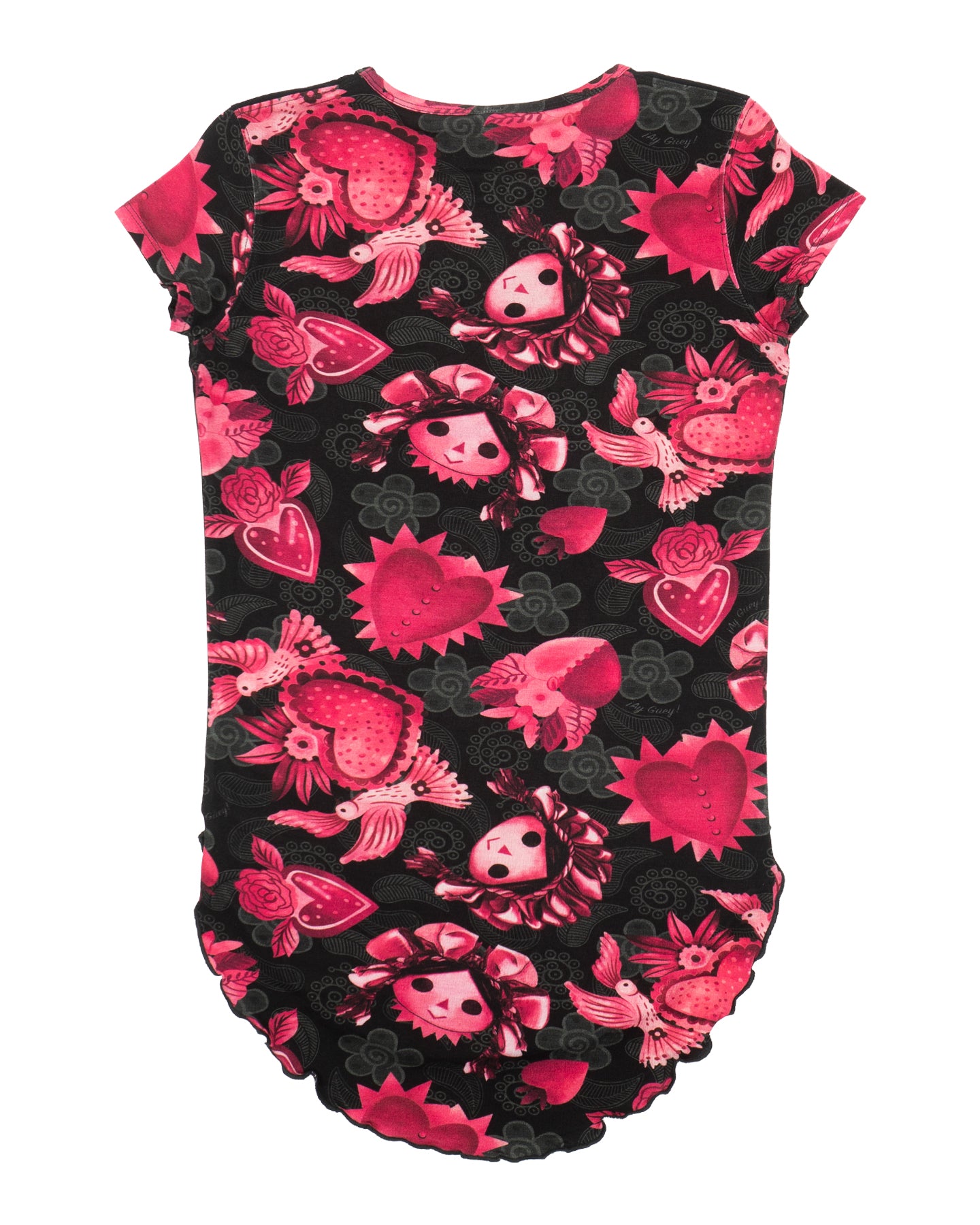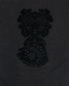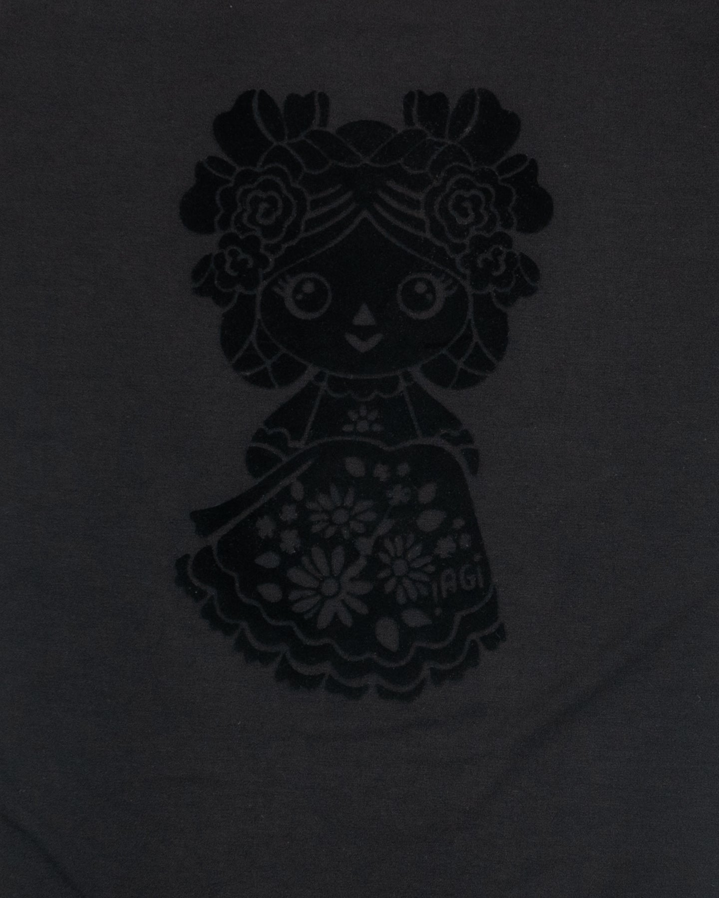 La playera "Petra Rosas" celebra a las icónicas muñecas artesanales mexicanas en un diseño elegante y con una aplicación flock (efecto aterciopelado) que es irresistible al tacto. Una prenda clave que fusiona la inocencia cultural con la moda contemporánea.