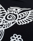 El icónico colibrí, símbolo de la alegría ancestral, se plasma en un potente trazo blanco.