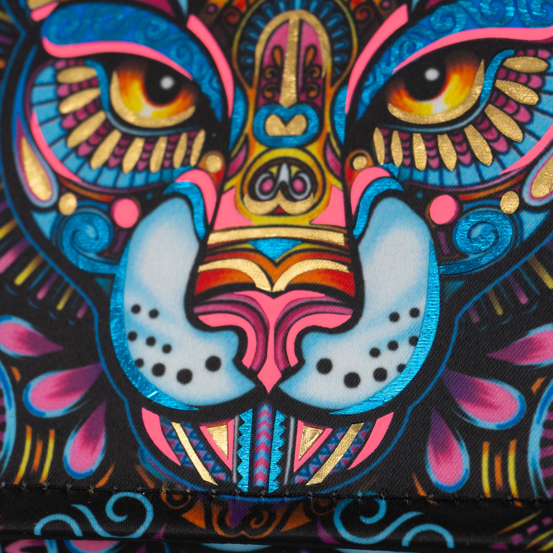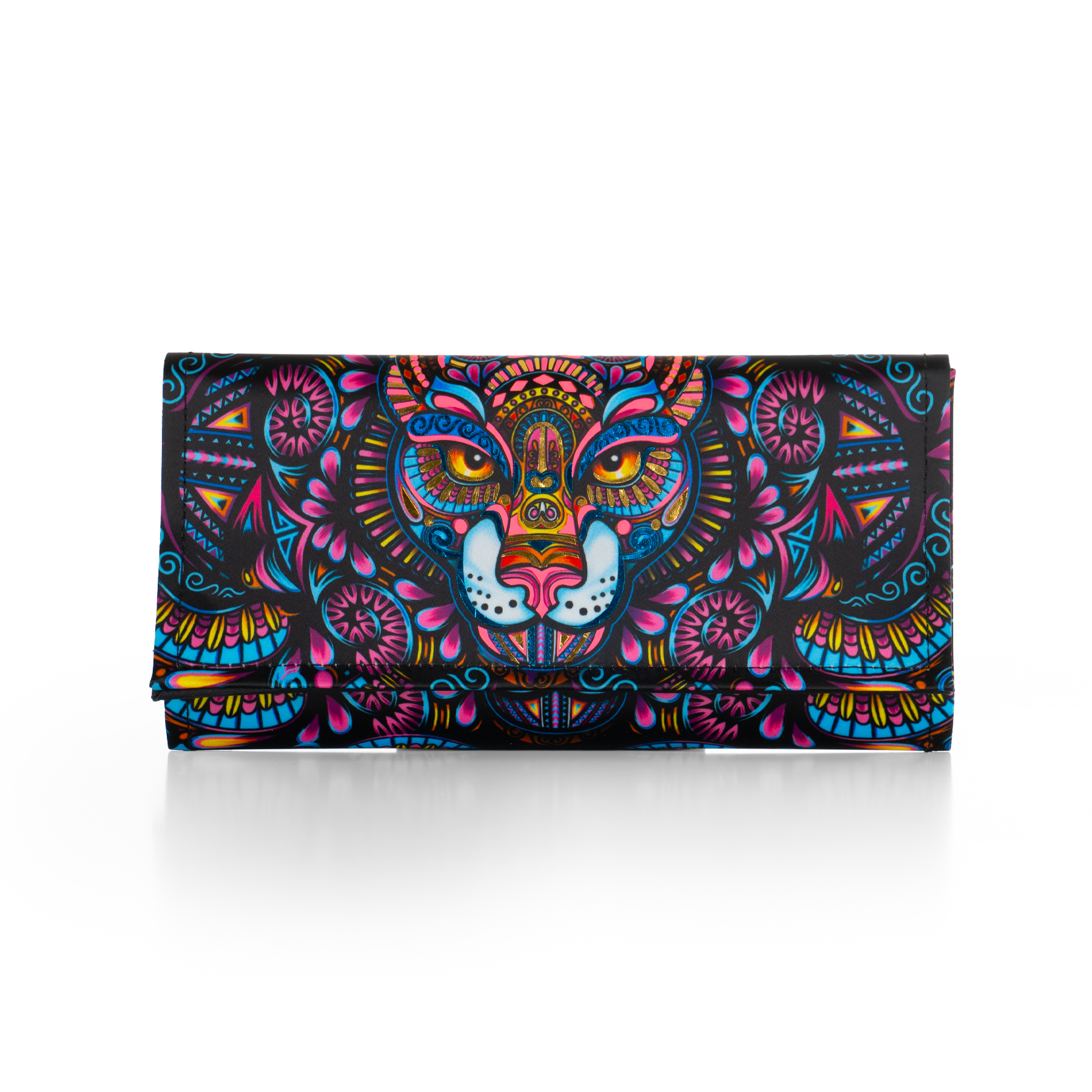 Cartera de dama inspirada en el jaguar y los ornamentos característicos de los alebrijes. Cuenta con aplicaciones en vinil neón.