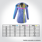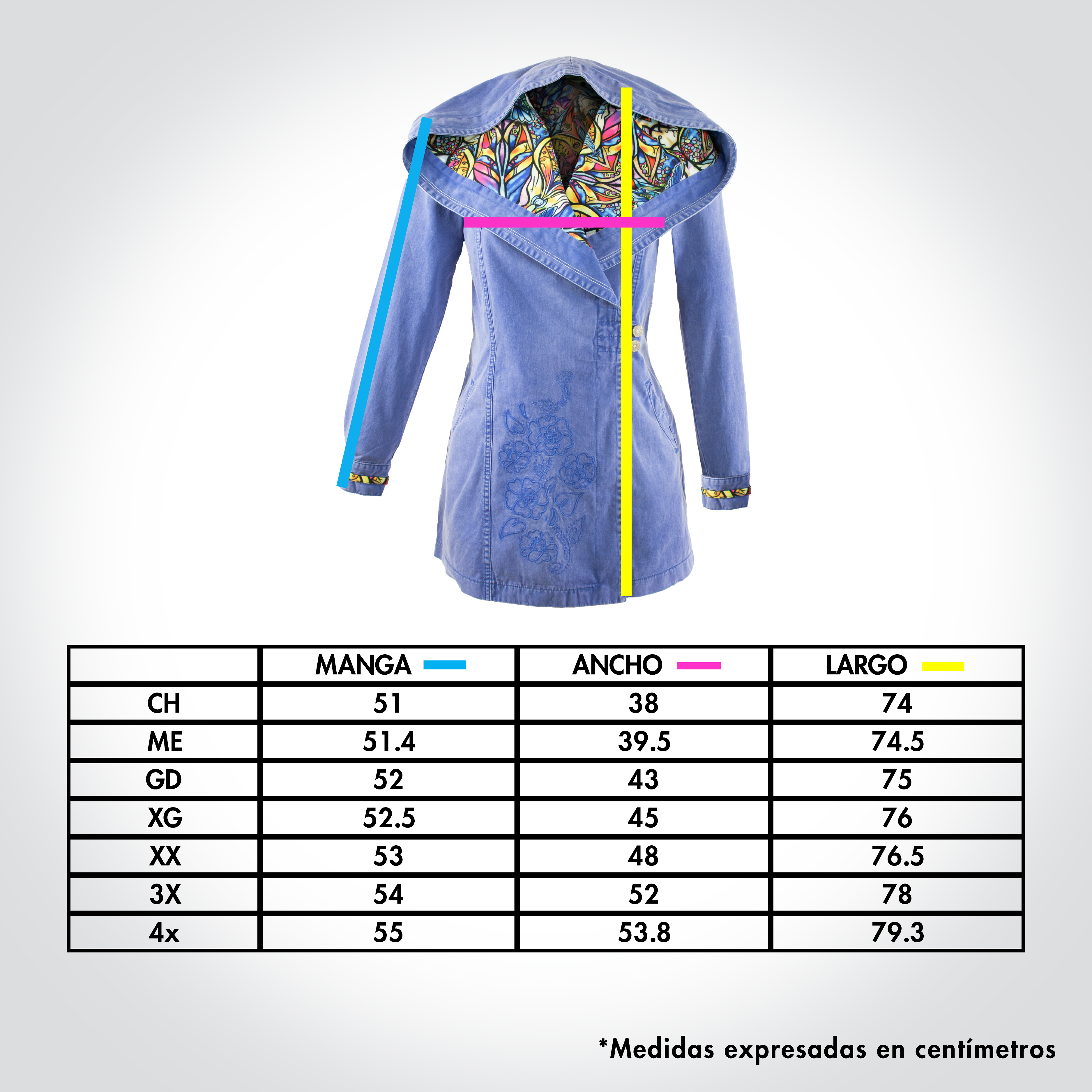 Cierre broches cruzado en contra, capucha con Terminado en solapa, forro con sublimado. Cuenta con un bordado de flores en el frente