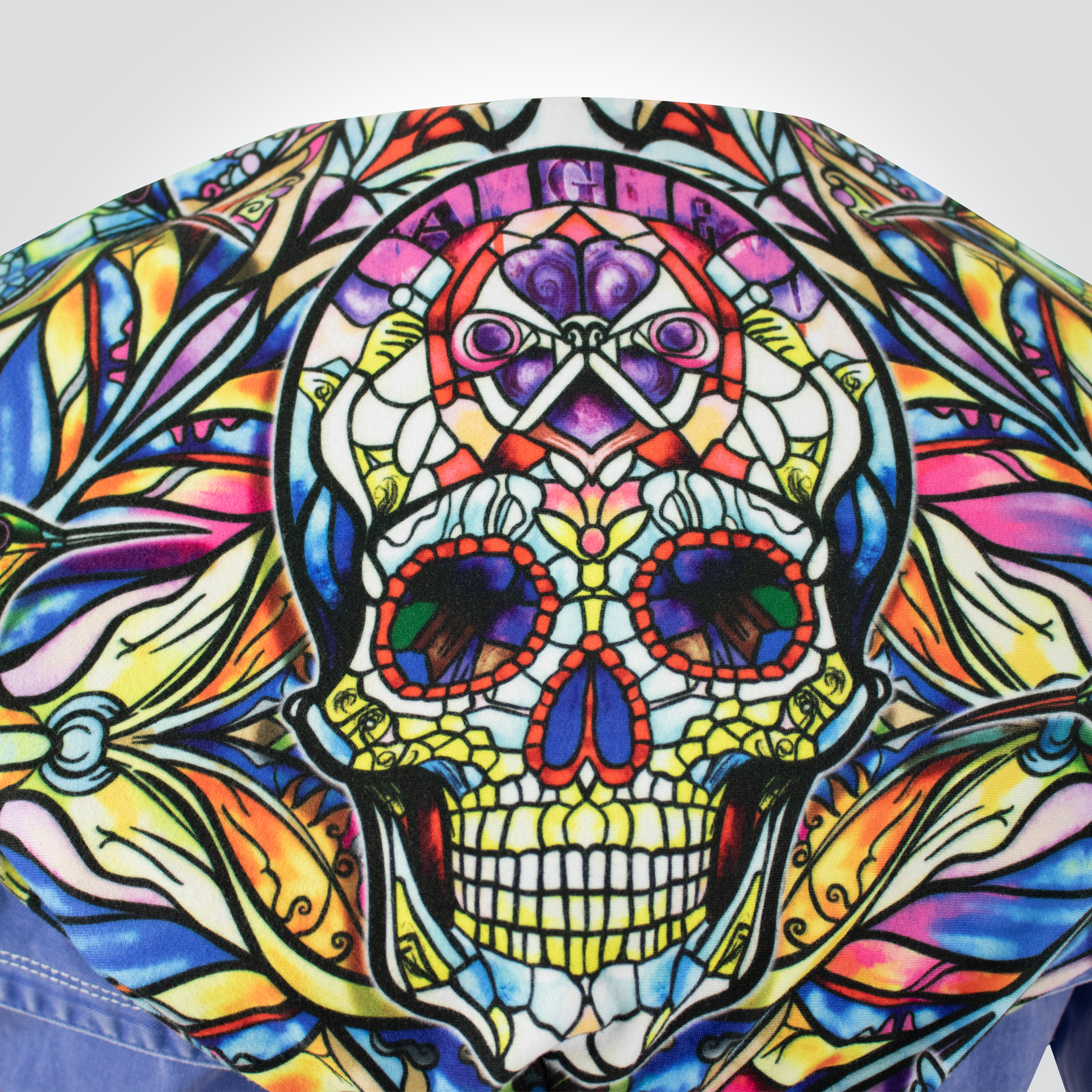 Diseño inspirado en los vitrales virreinales y las calaveras de azúcar.