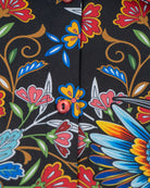 El diseño se inspira en los bordados huicholes y tenangos, fusionando patrones florales simétricos con un vibrante colibrí que parece cobrar vida entre las flores.