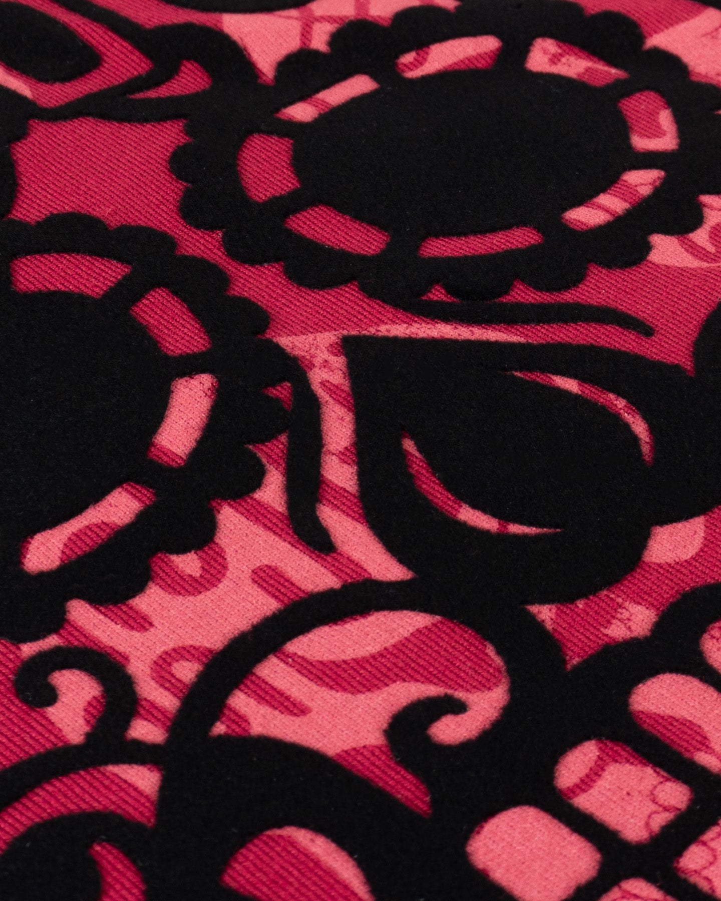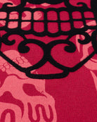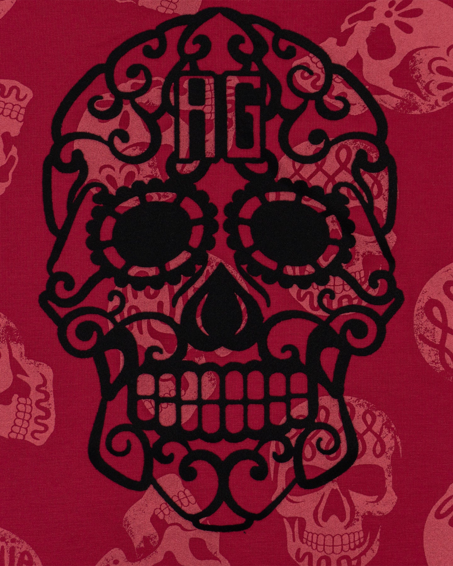 Esta playera roja presenta un patrón integral de cráneos en contraste, destacando un calavera central en color negro con calados detallados. Su diseño de corte estándar combina iconografía tradicional con un estilo urbano audaz, ideal para un look casual con personalidad.