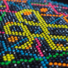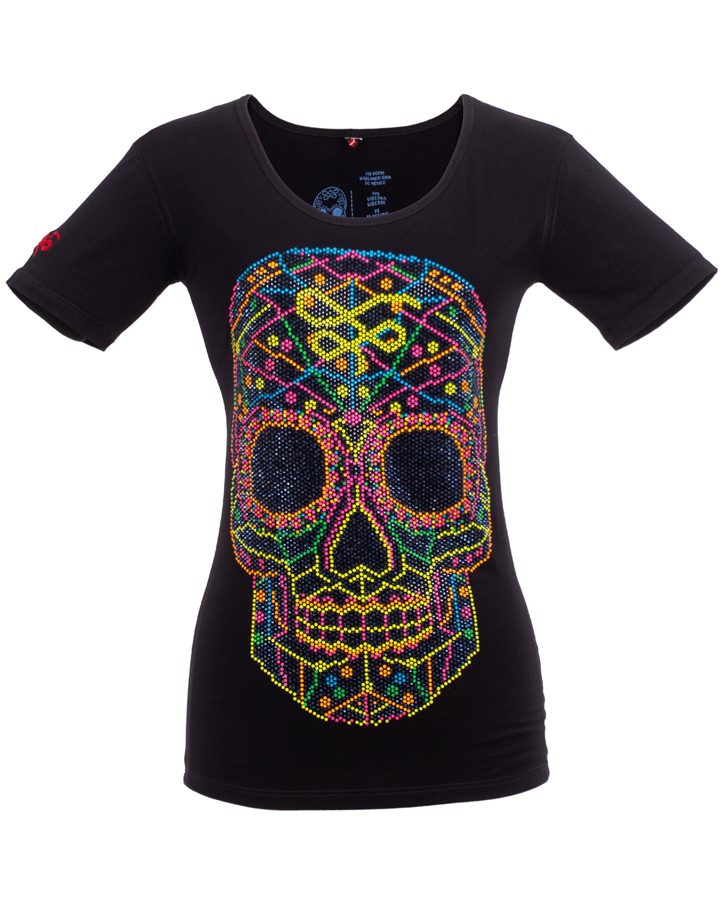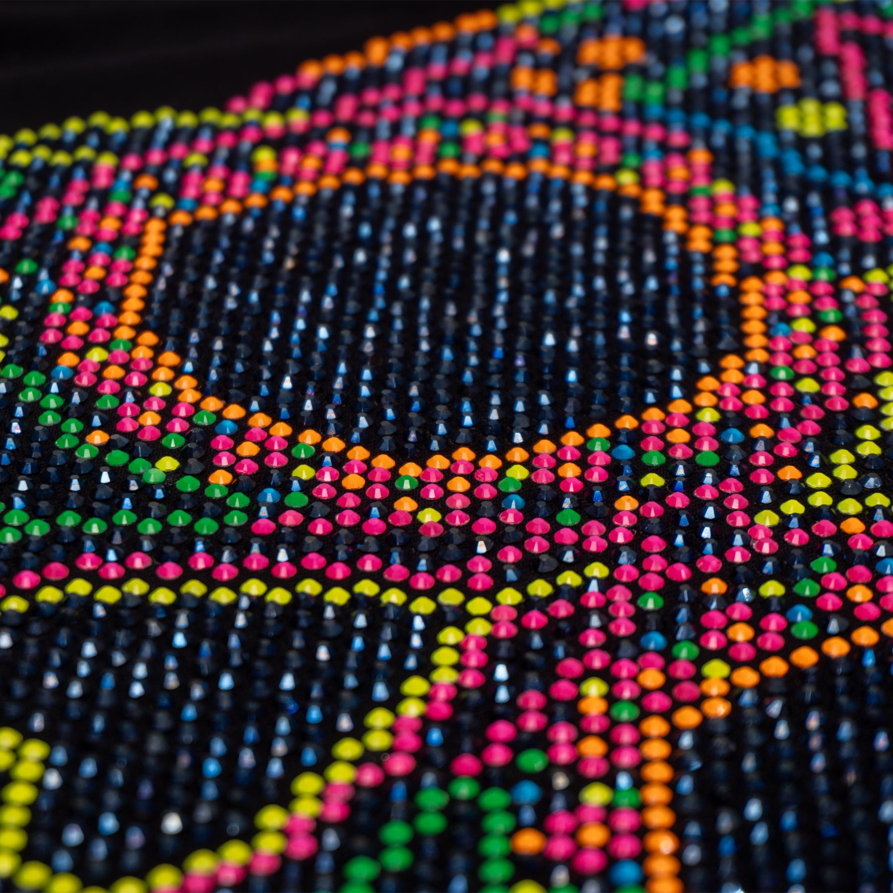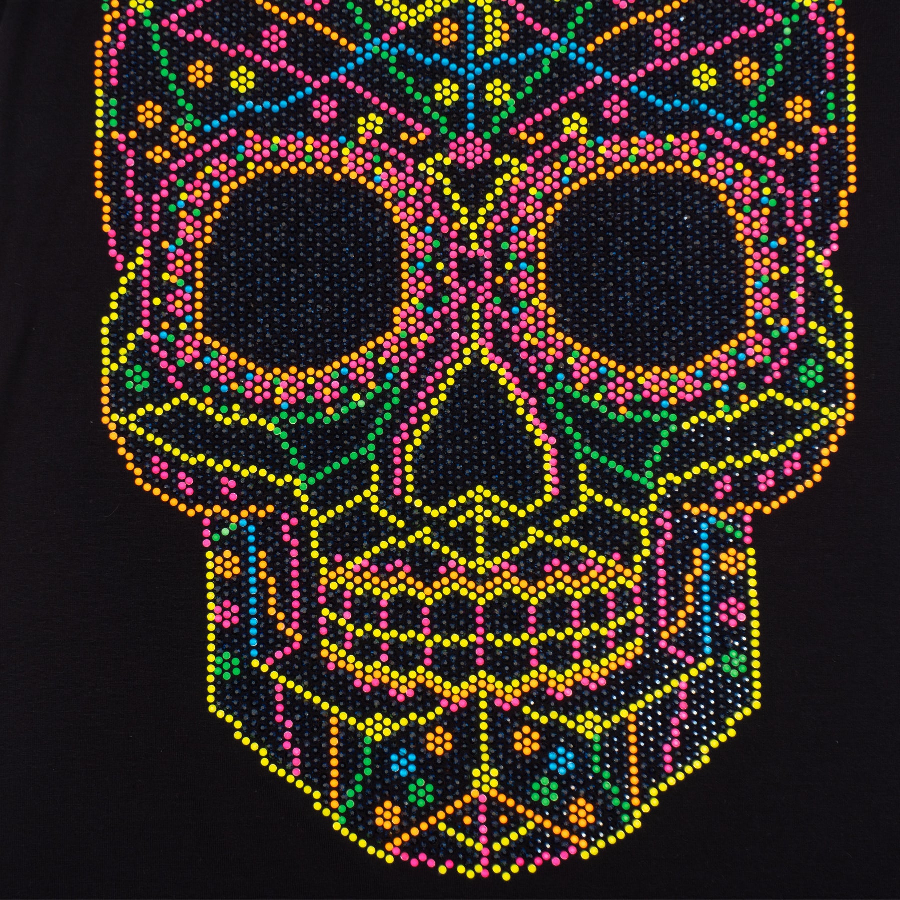 Este diseño está armado con piedras de colores neón , por lo que al reaccionar con luz UV, es perfecto para las noches de fiesta. Es una versión nueva y contemporánea de la calavera de azúcar.