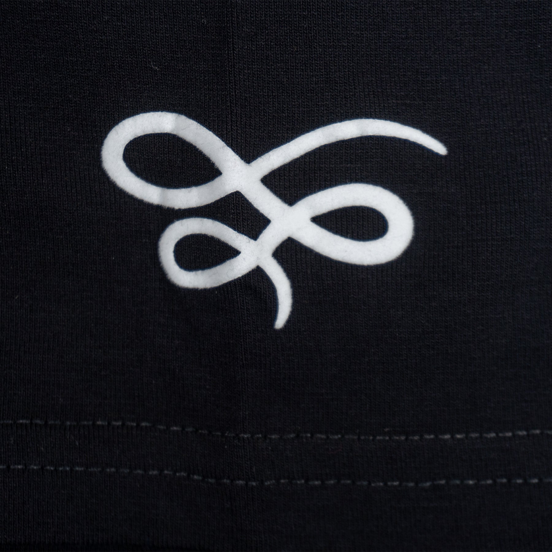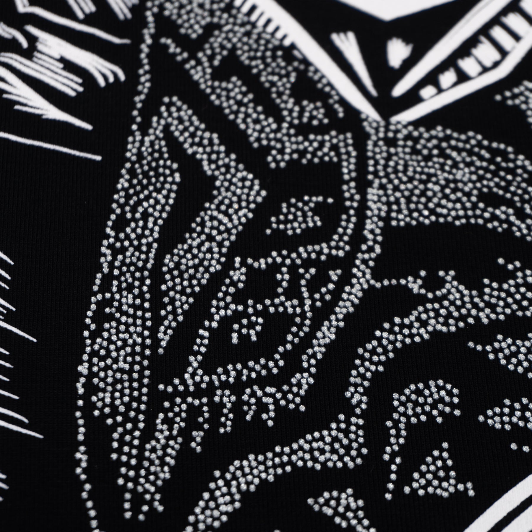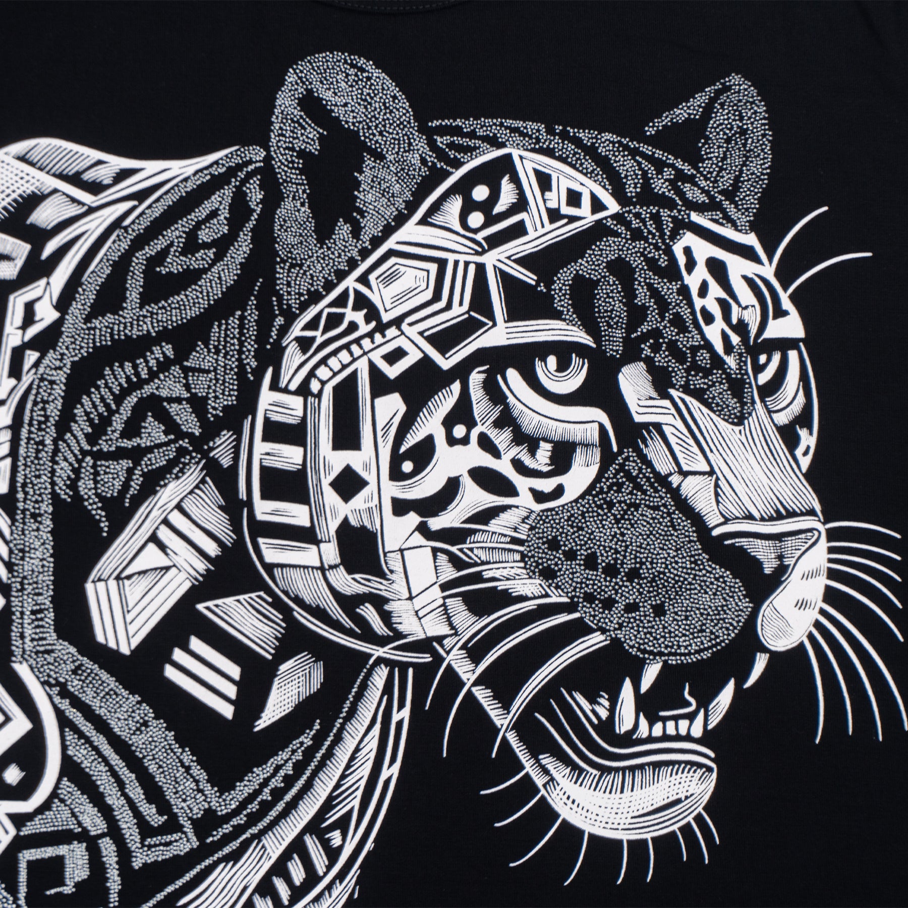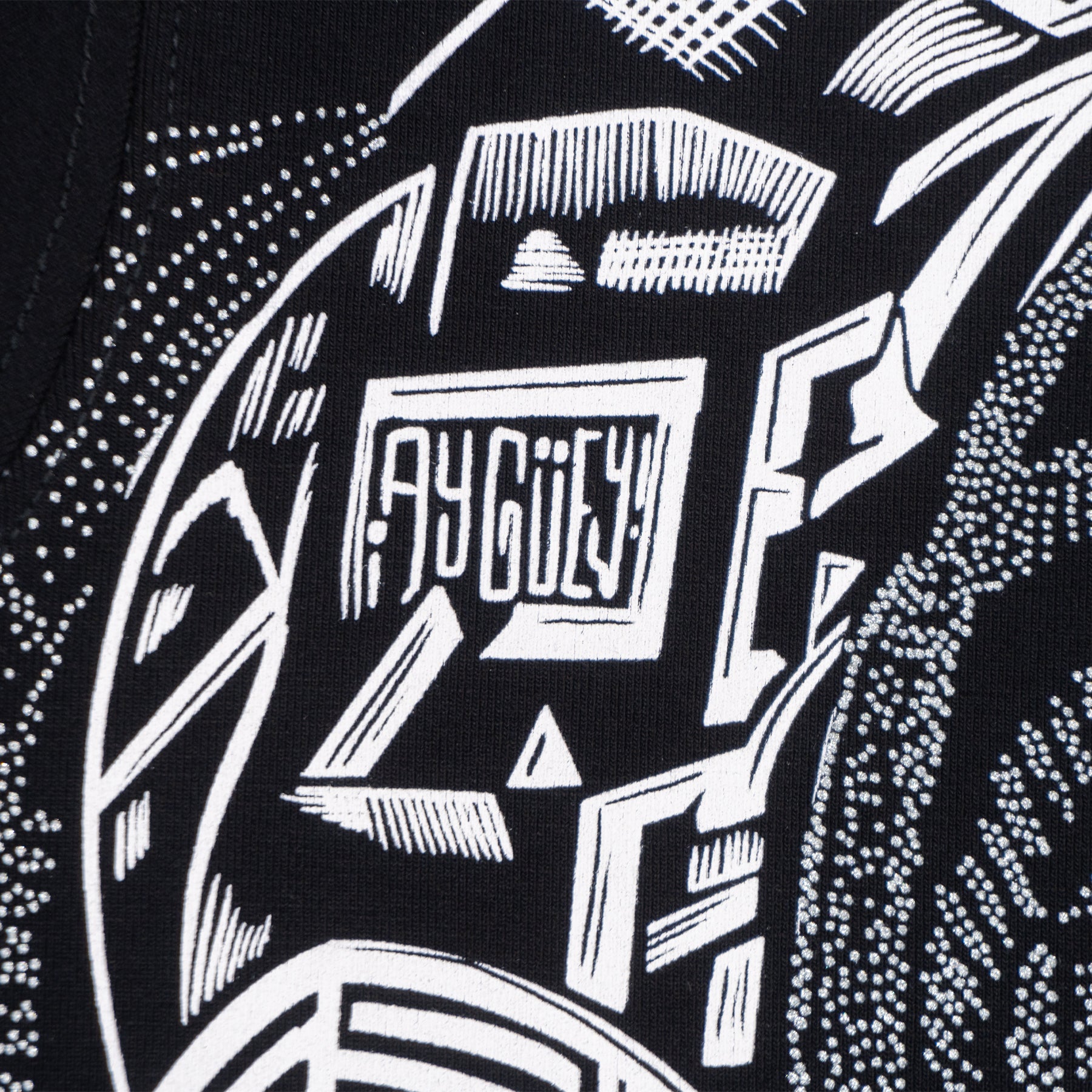 Con estampado en full print y aplicación de una tinta metalizada plateada.
