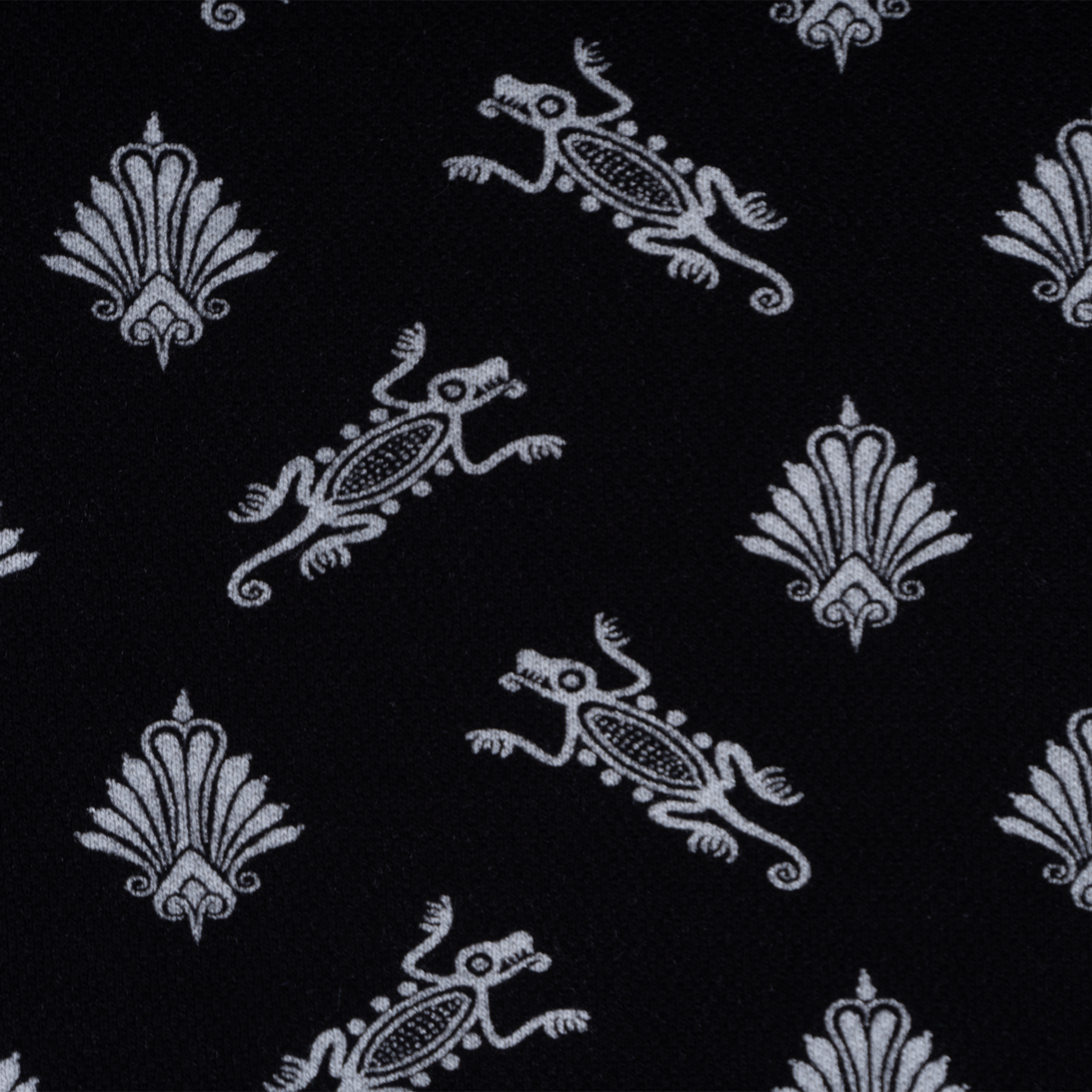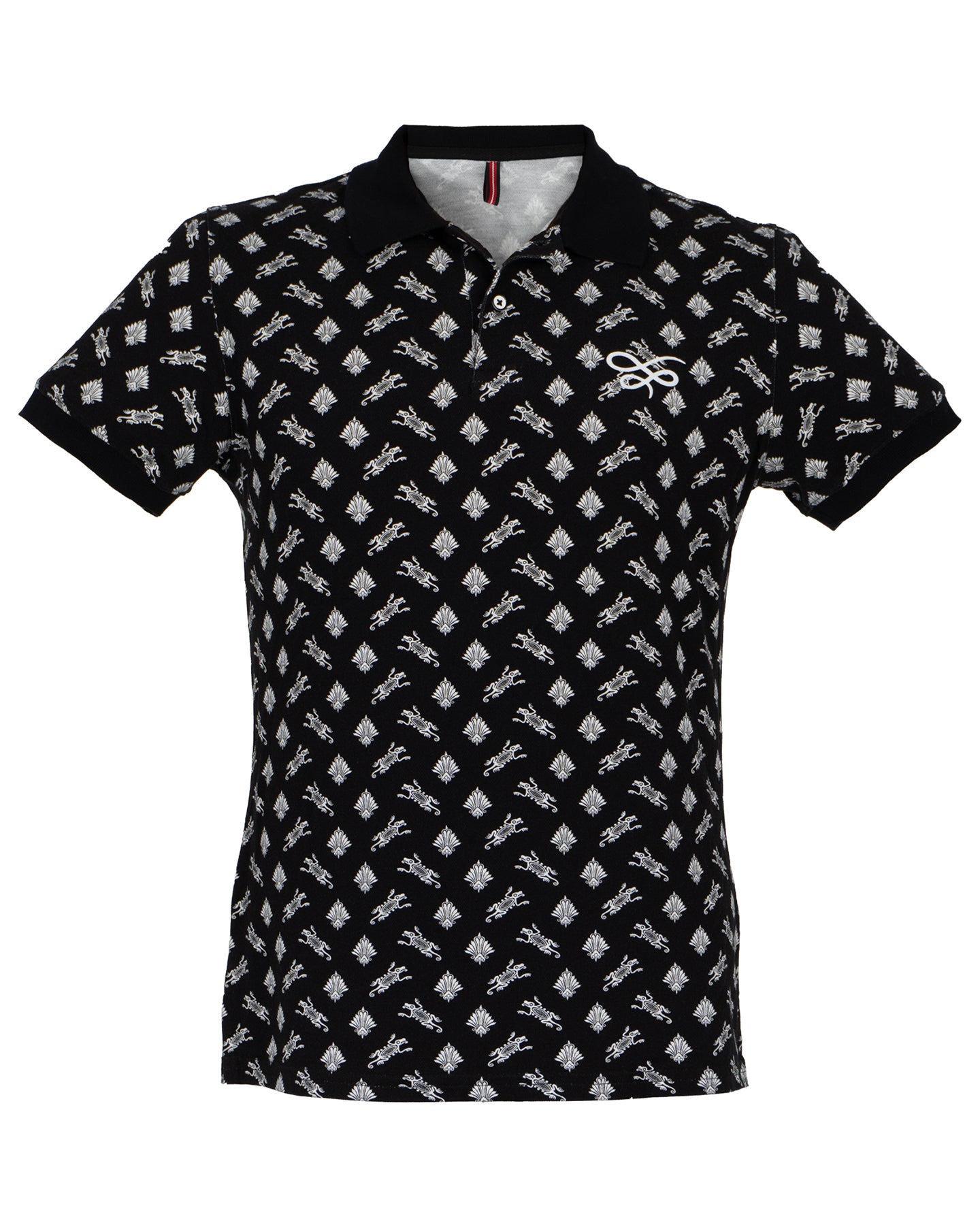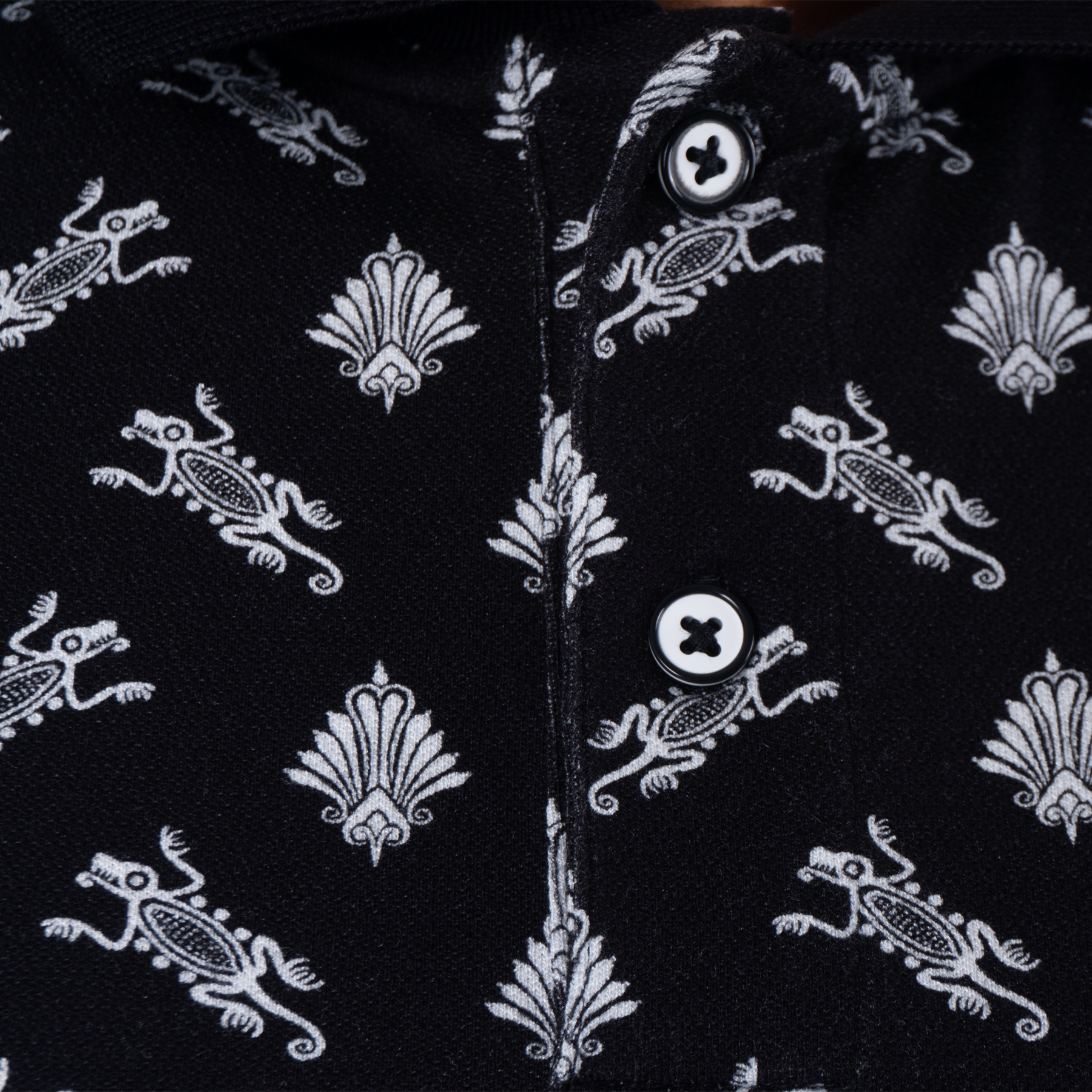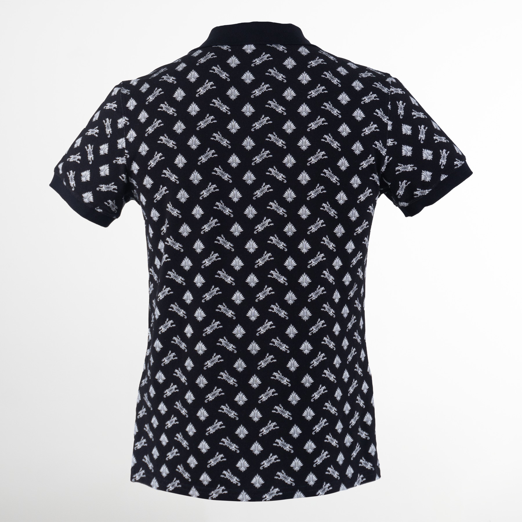 Nuevo corte de caballero tipo polo, adornada con un patrón de figuras prehispánicas inspirados en la cultura azteca, una civilización que floreció en el centro de México.