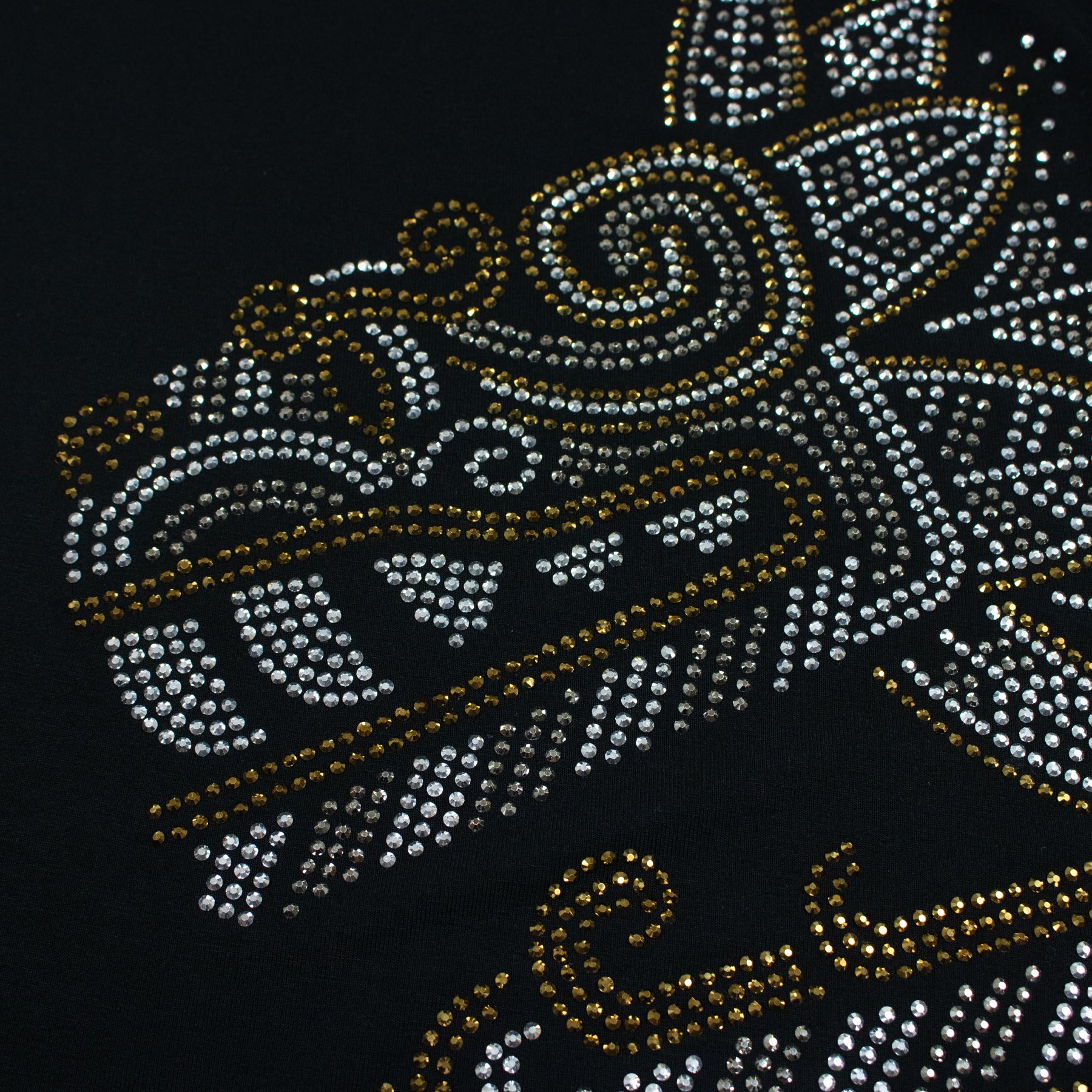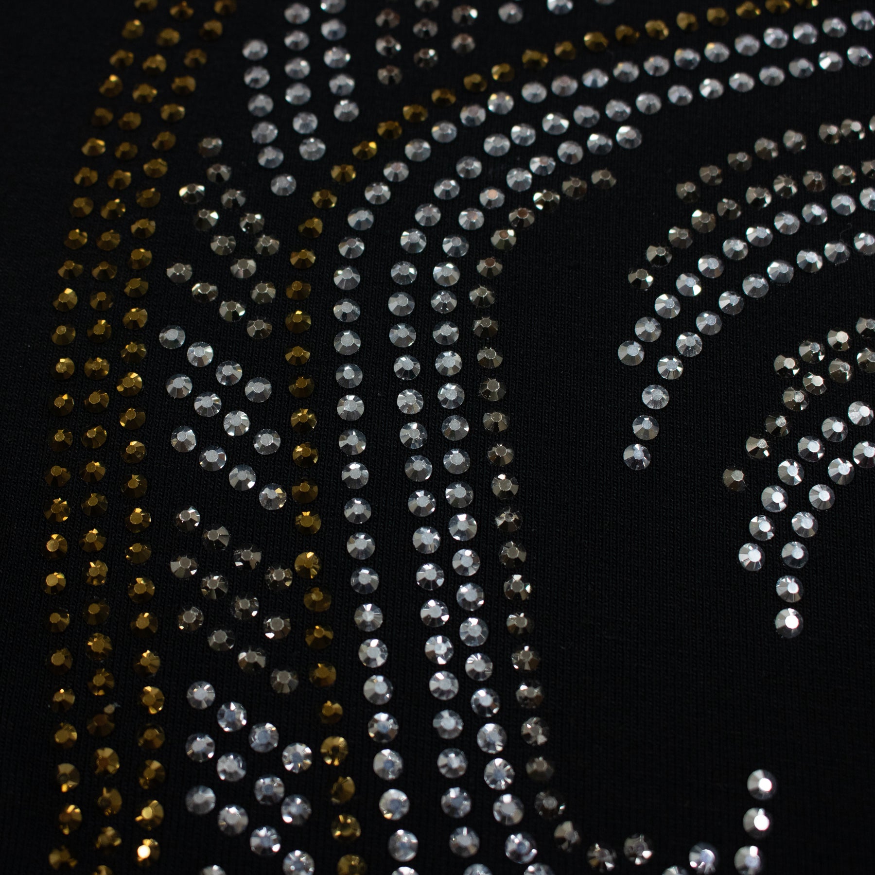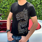 Playera negra de cuello redondo con aplicación en pedrería el diseño esta inspirando en el mítico Quetzalcóatl usa la pedrería como una metáfora de la luz y su relación con el sol.