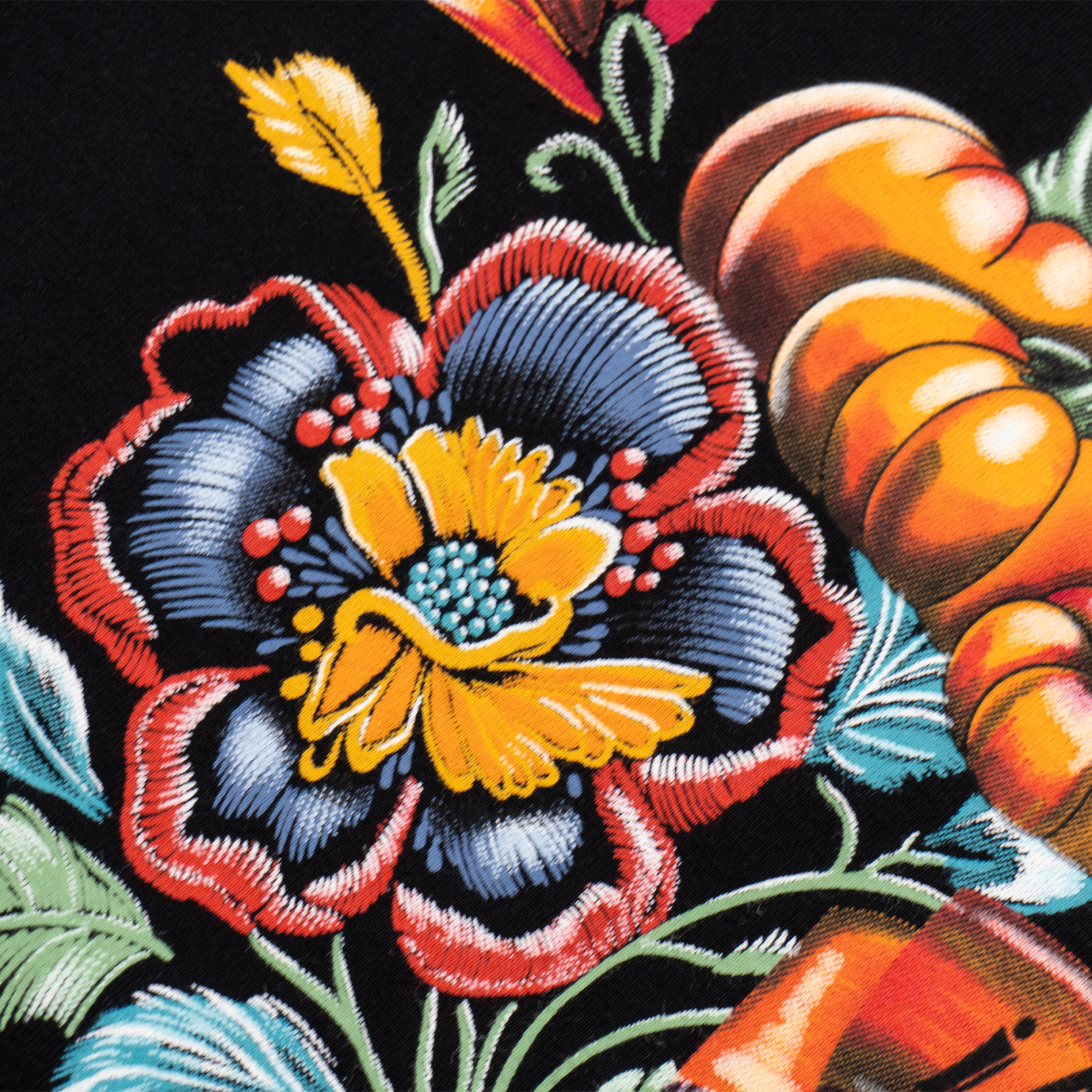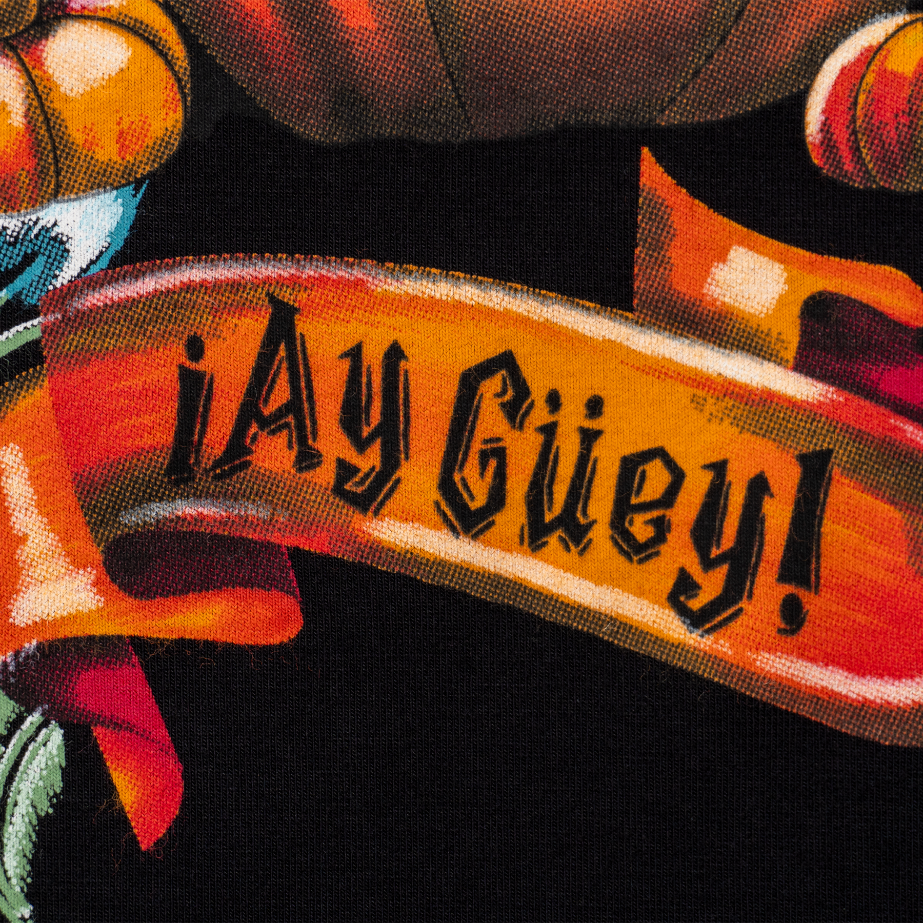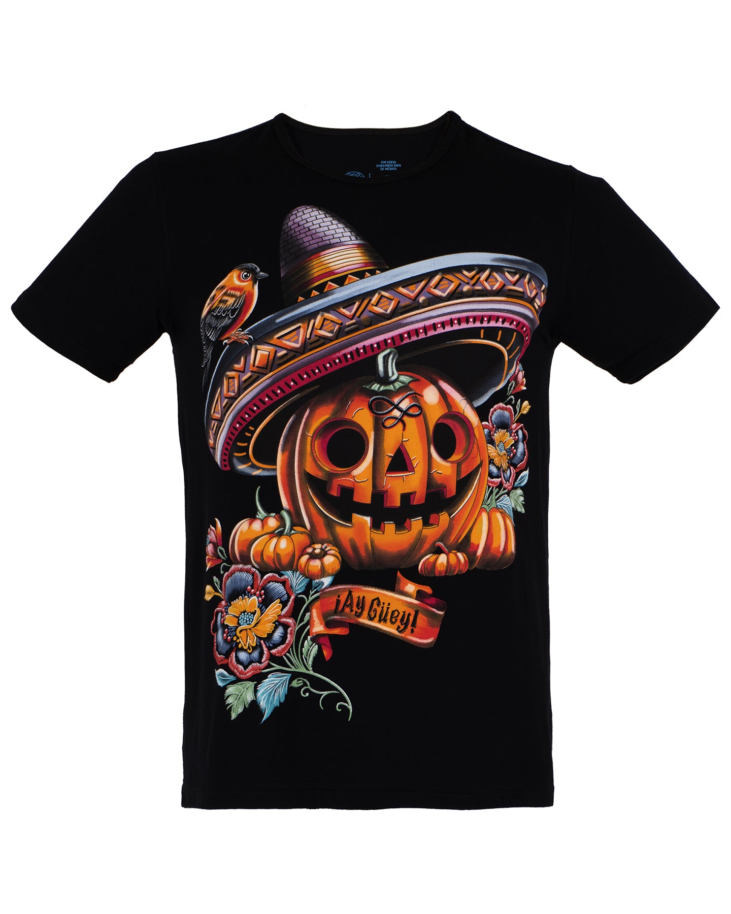 ¡Celebra dos tradiciones en una! Esta playera de caballero de manga corta combina el Día de Muertos en México y Halloween en el vecino país del norte. ¡Únete a la celebración con Calabaceando!