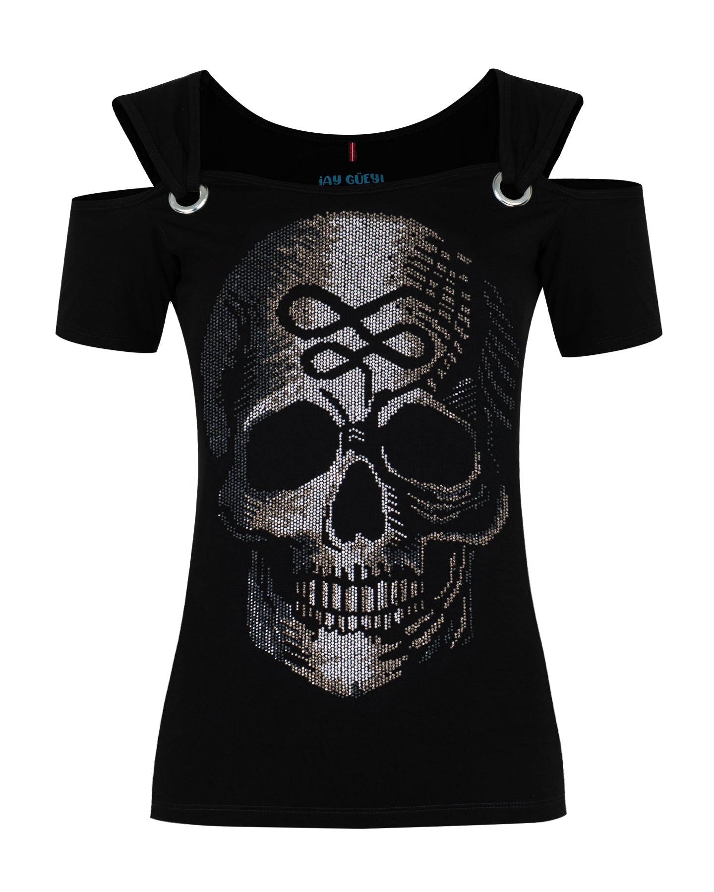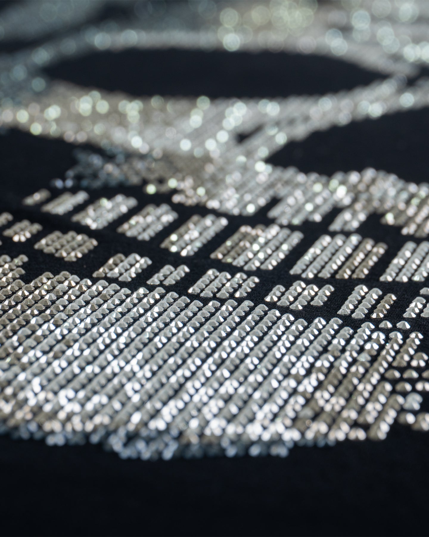 Calavera de brillo que desafía. El espíritu rebelde se borda en pedrería. Noche y actitud en un solo negro esencial.