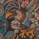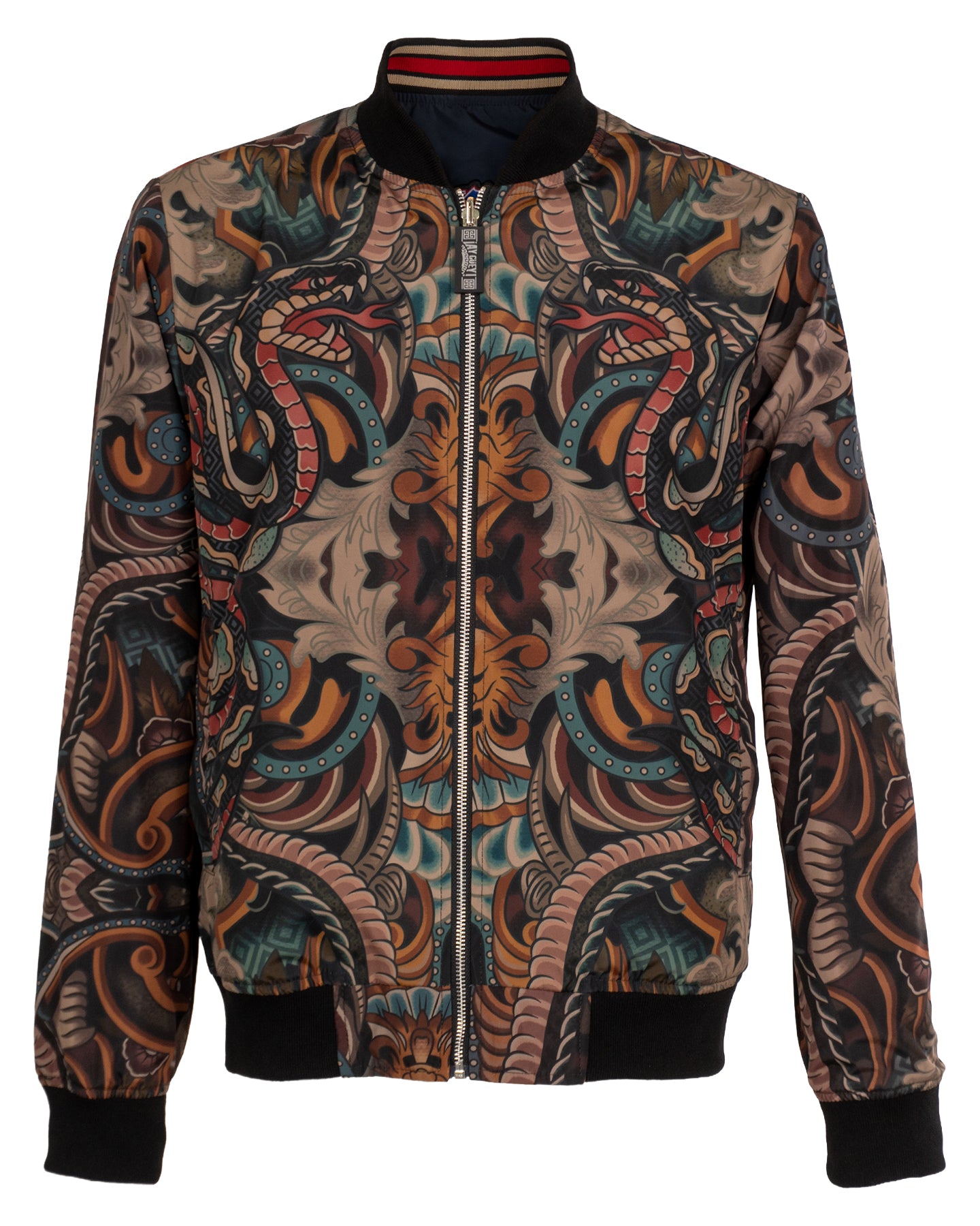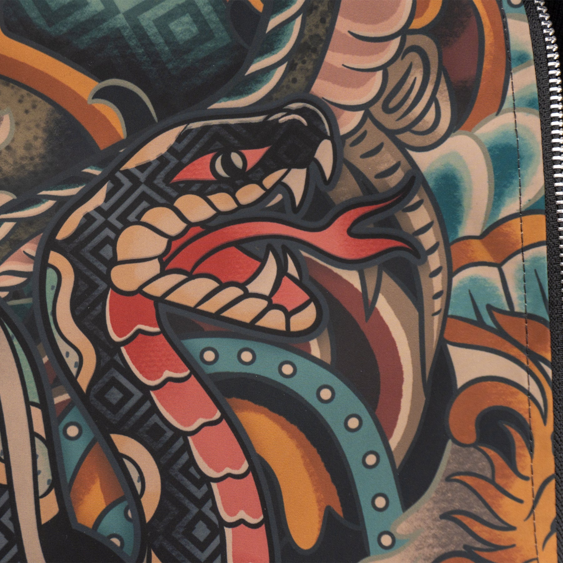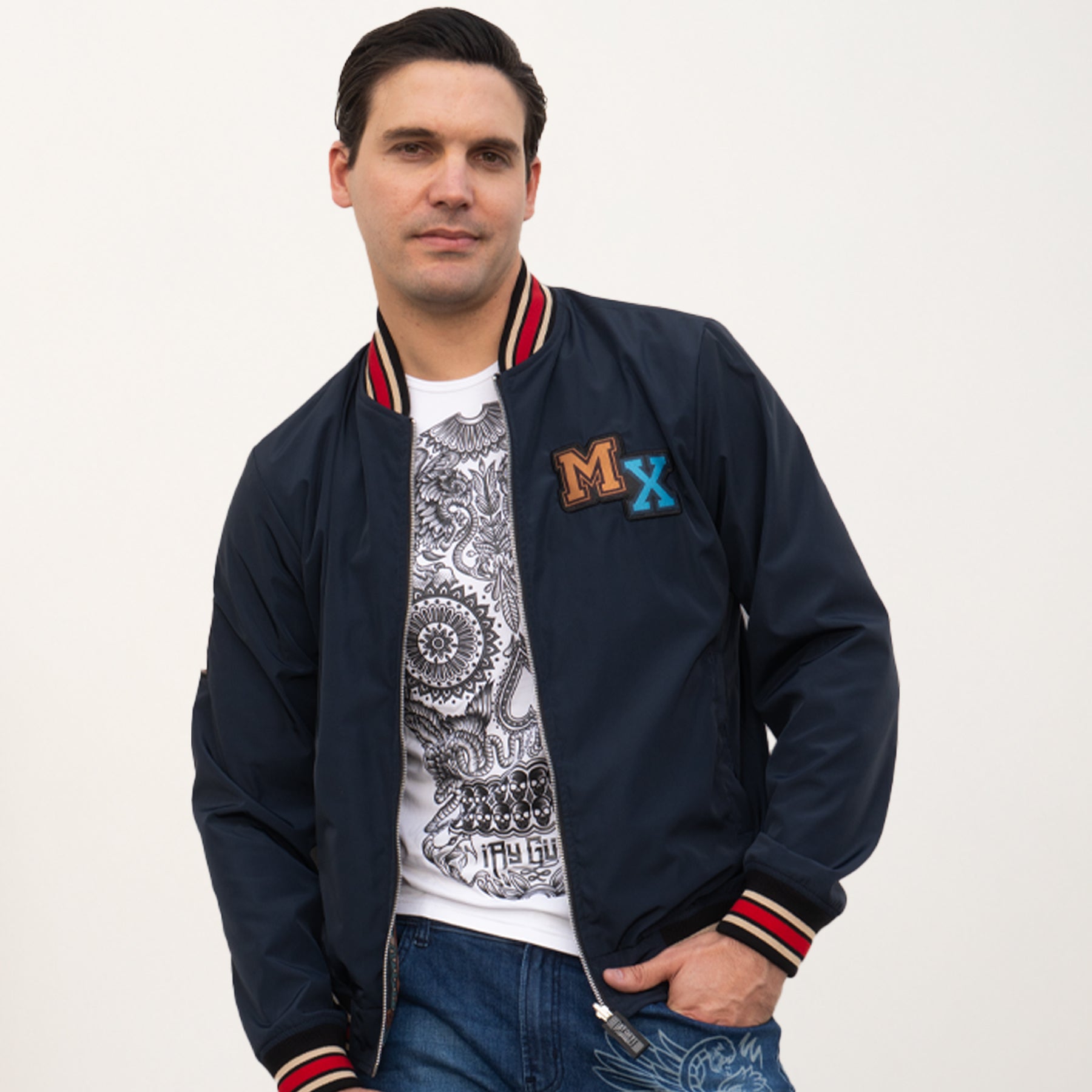 Diseñada para quienes buscan expresarse sin límites, esta pieza fusiona dos mundos en un solo diseño. Inspirado en los tatuajes antiguos, un lado de la chamarra lleva gráficos audaces y detallados que rinden homenaje a la tradición del tatuaje clásico fusionado con elementos de la historia de México. El otro lado de la chamarra, tiene un diseño a temporal con aplicaciones en contraste, detalles en tipografías deportivas, este lado transmite el estilo icónico de la cultura universitaria, fusionando nostalgia y modernidad.