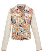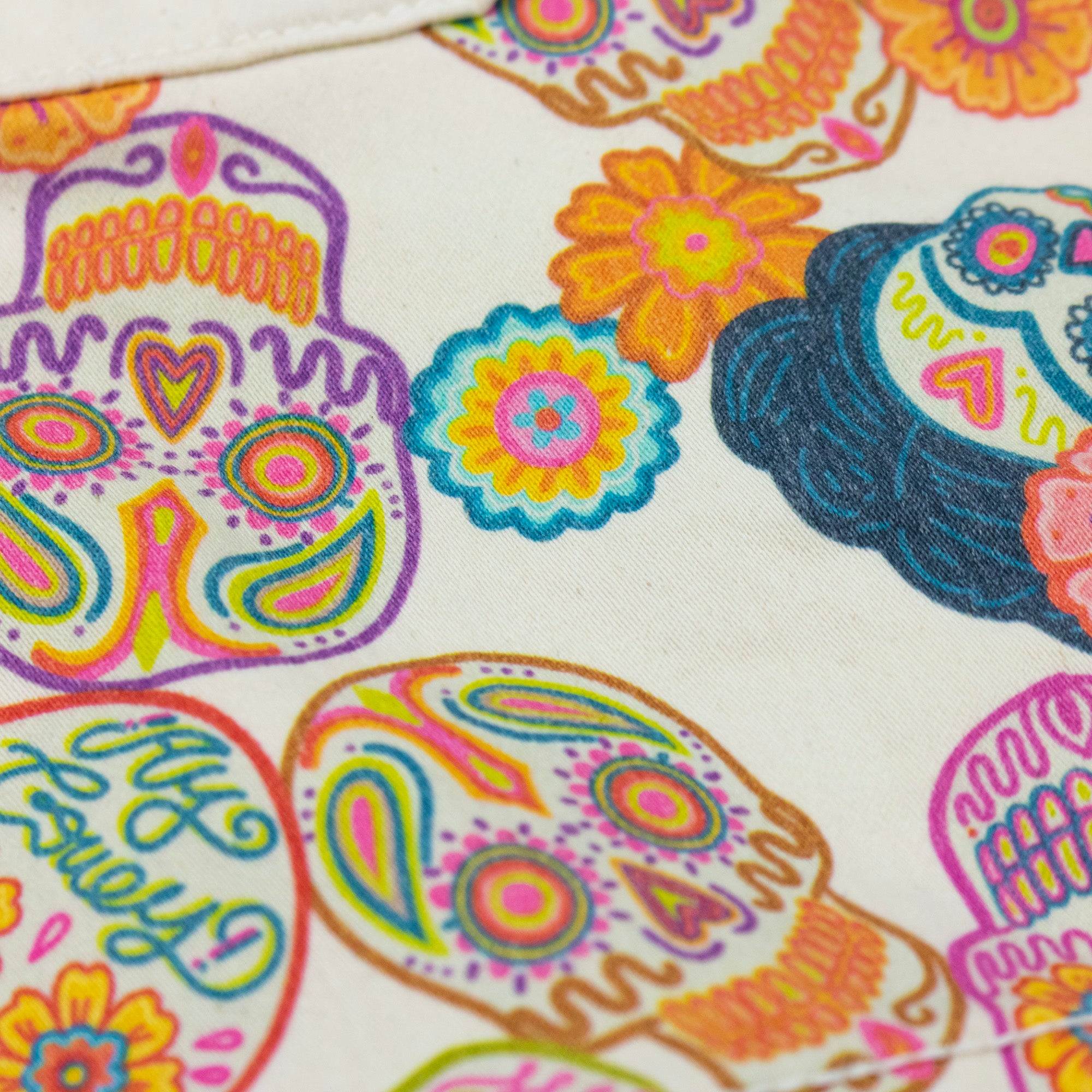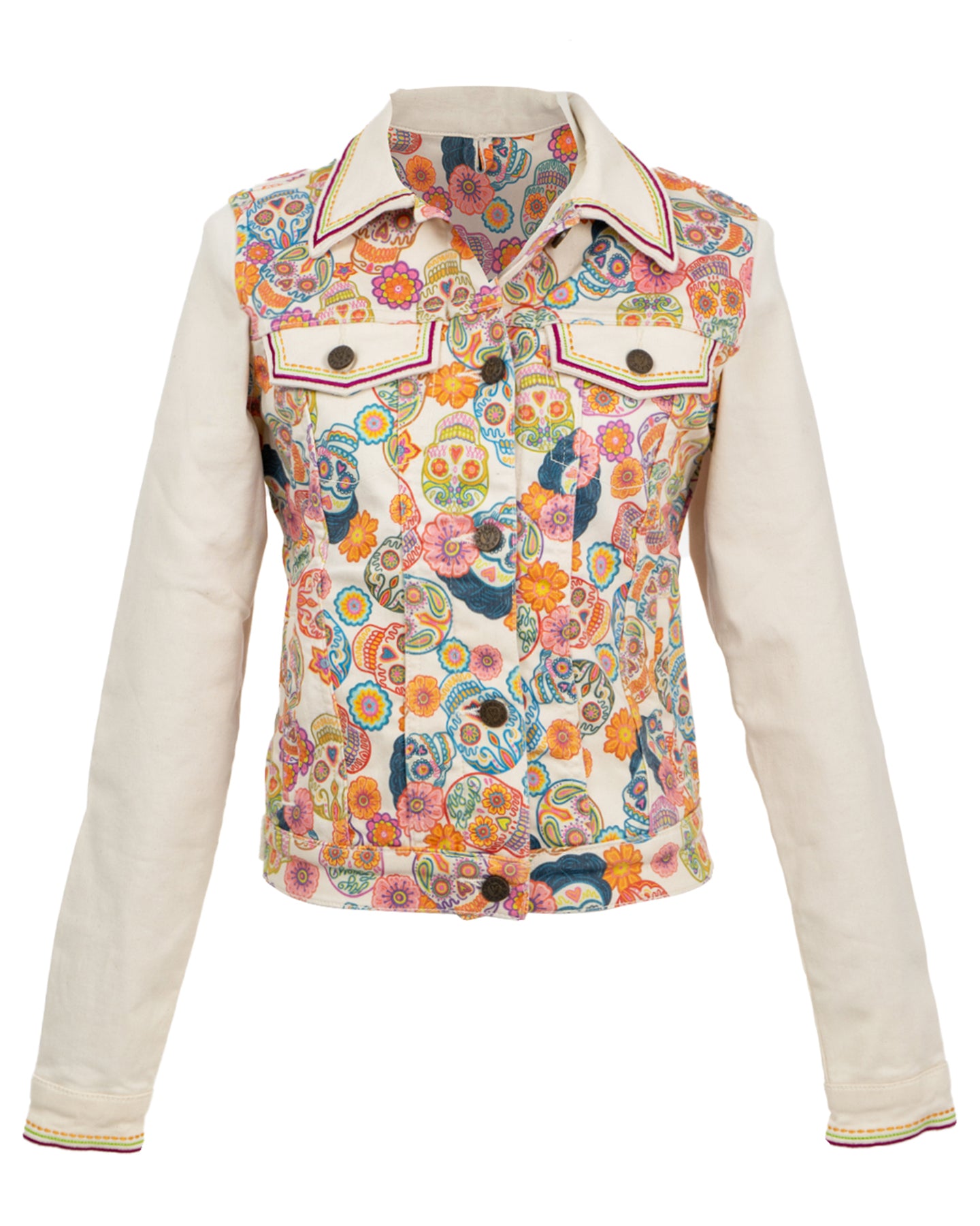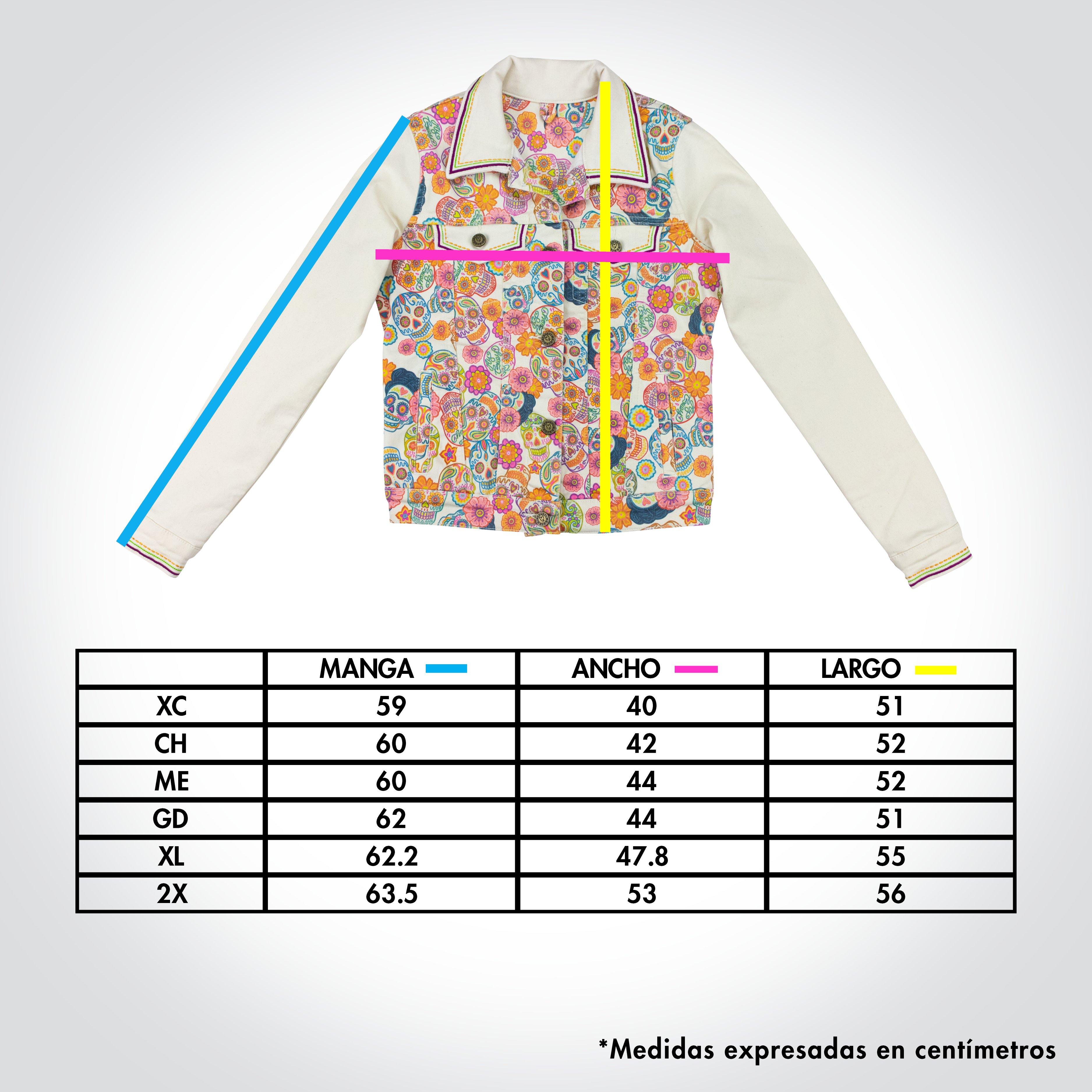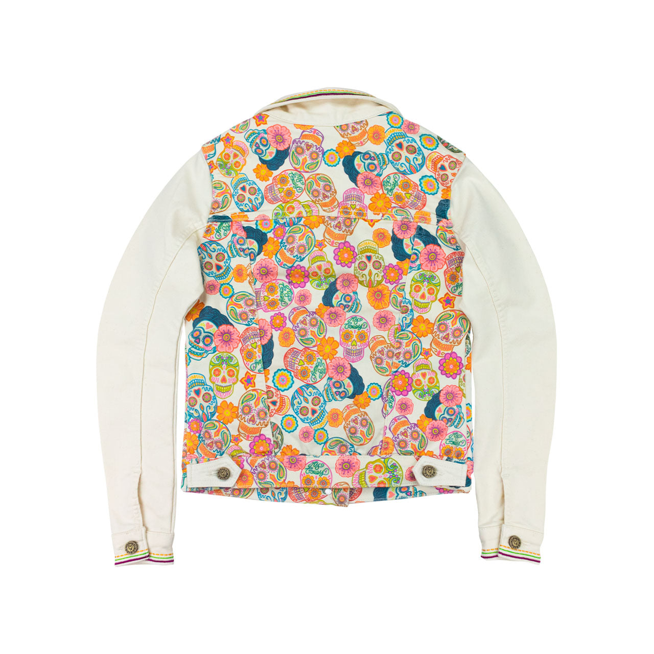 Chamarra de mezclilla estampada, con detalles en tonos pasteles y ocres, inspirados en las tradiciones de Dia de Muertos.