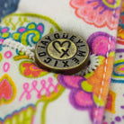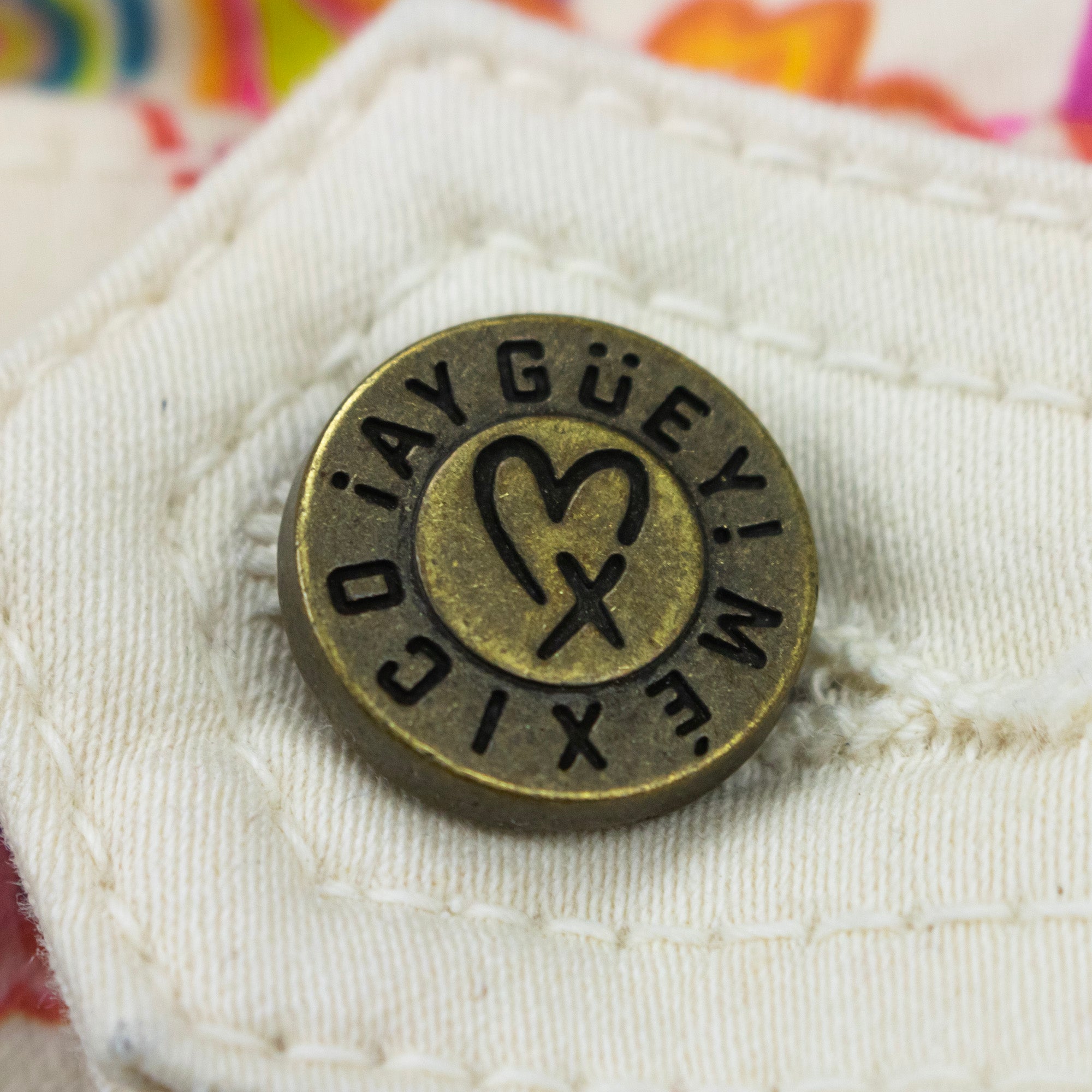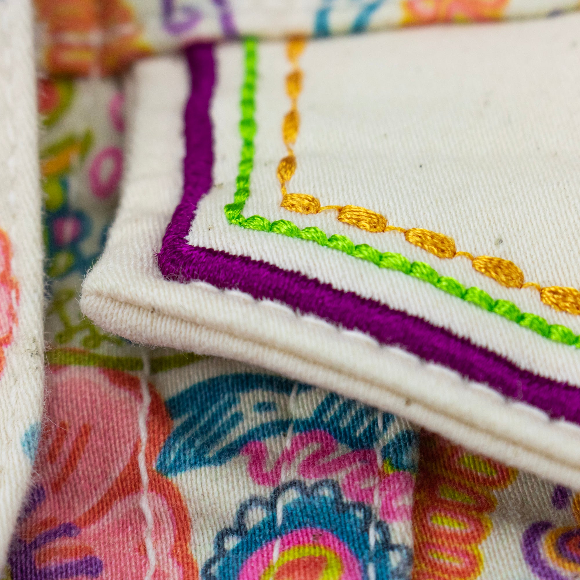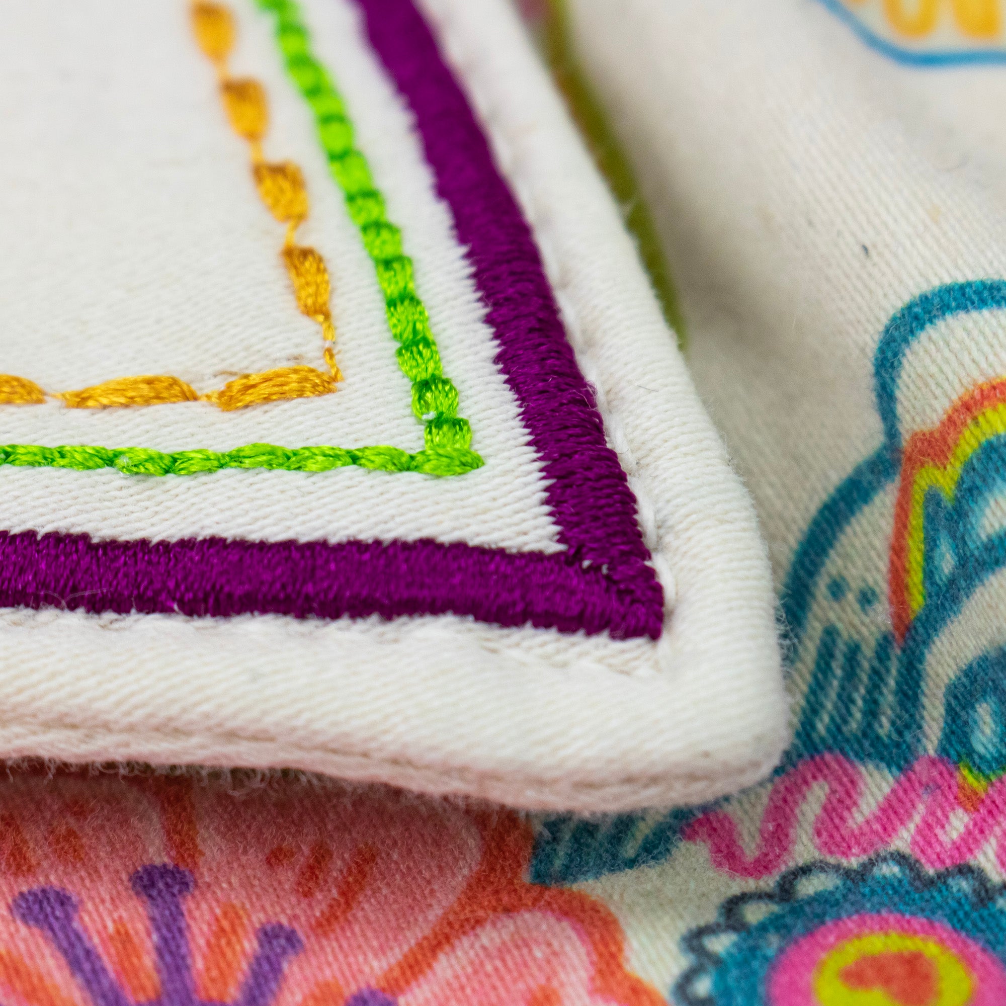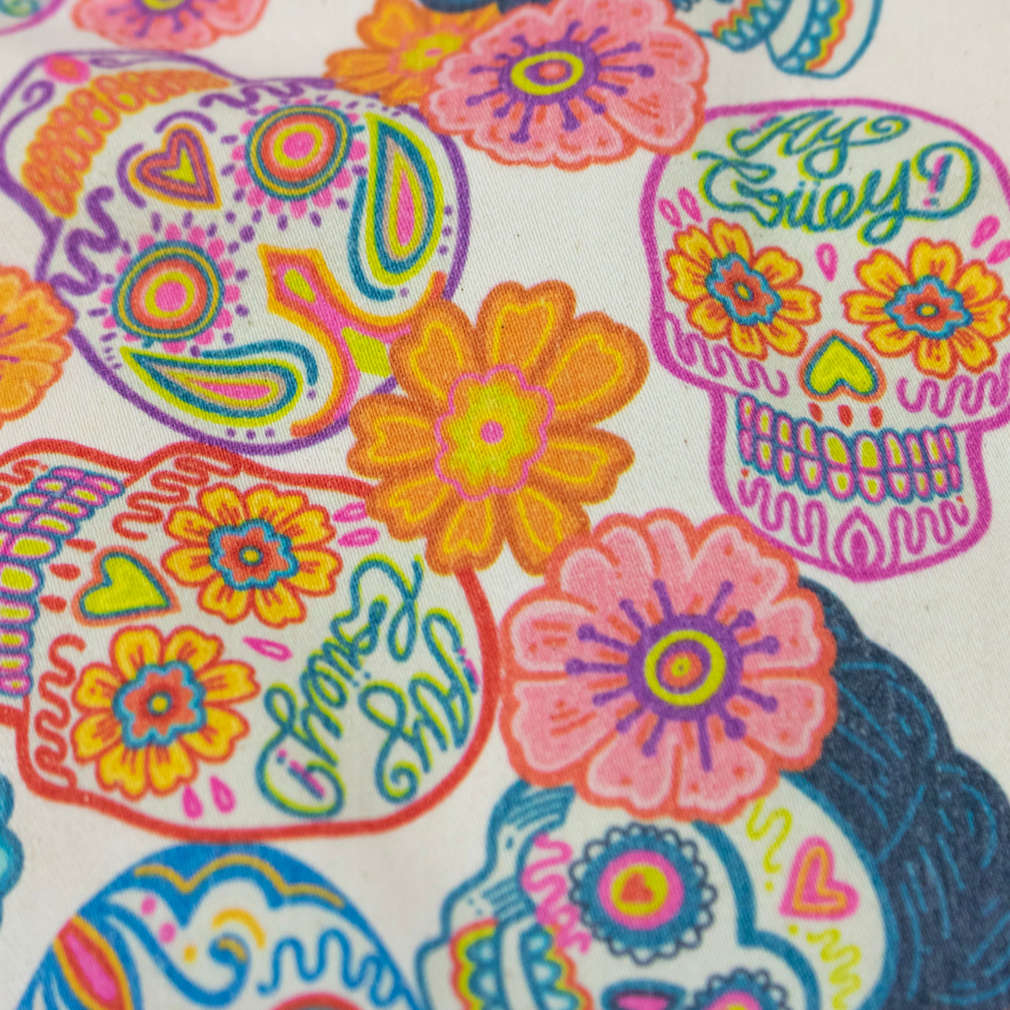 Chamarra de mezclilla estampada, con detalles en tonos pasteles y ocres, inspirados en las tradiciones de Dia de Muertos.