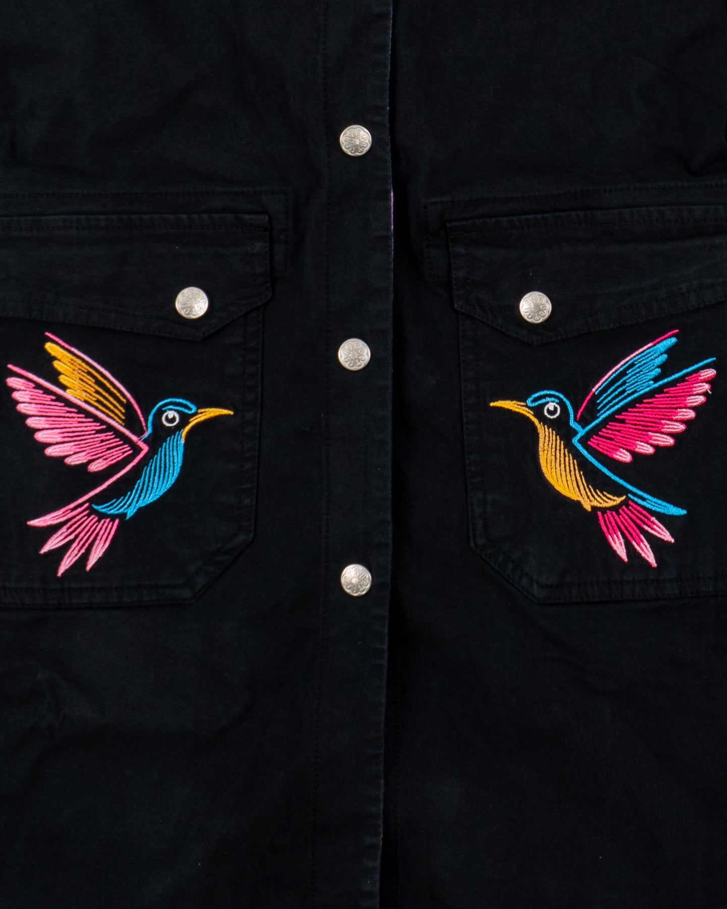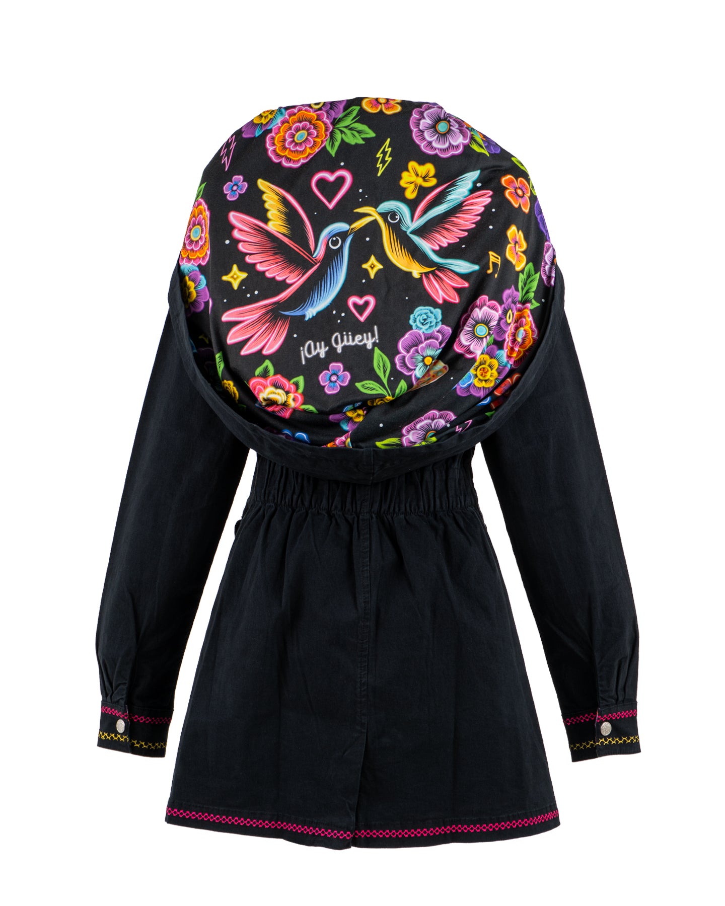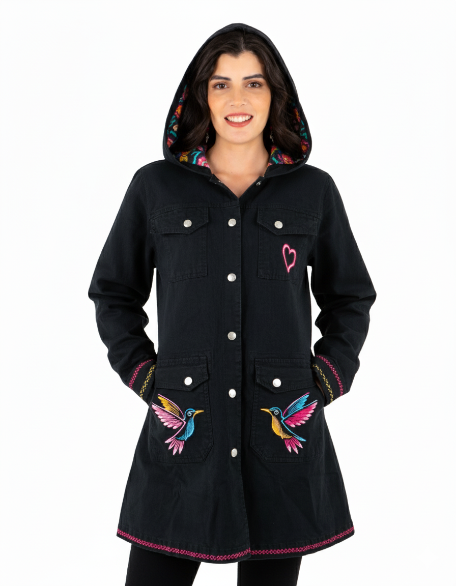 La prenda brilla con detalles neón, como el corazón, el colibrí y la franja inferior. En los puños, bordados multicolores reflejan la riqueza artesanal. En la espalda, dos colibríes de neón vuelan entre las flores.