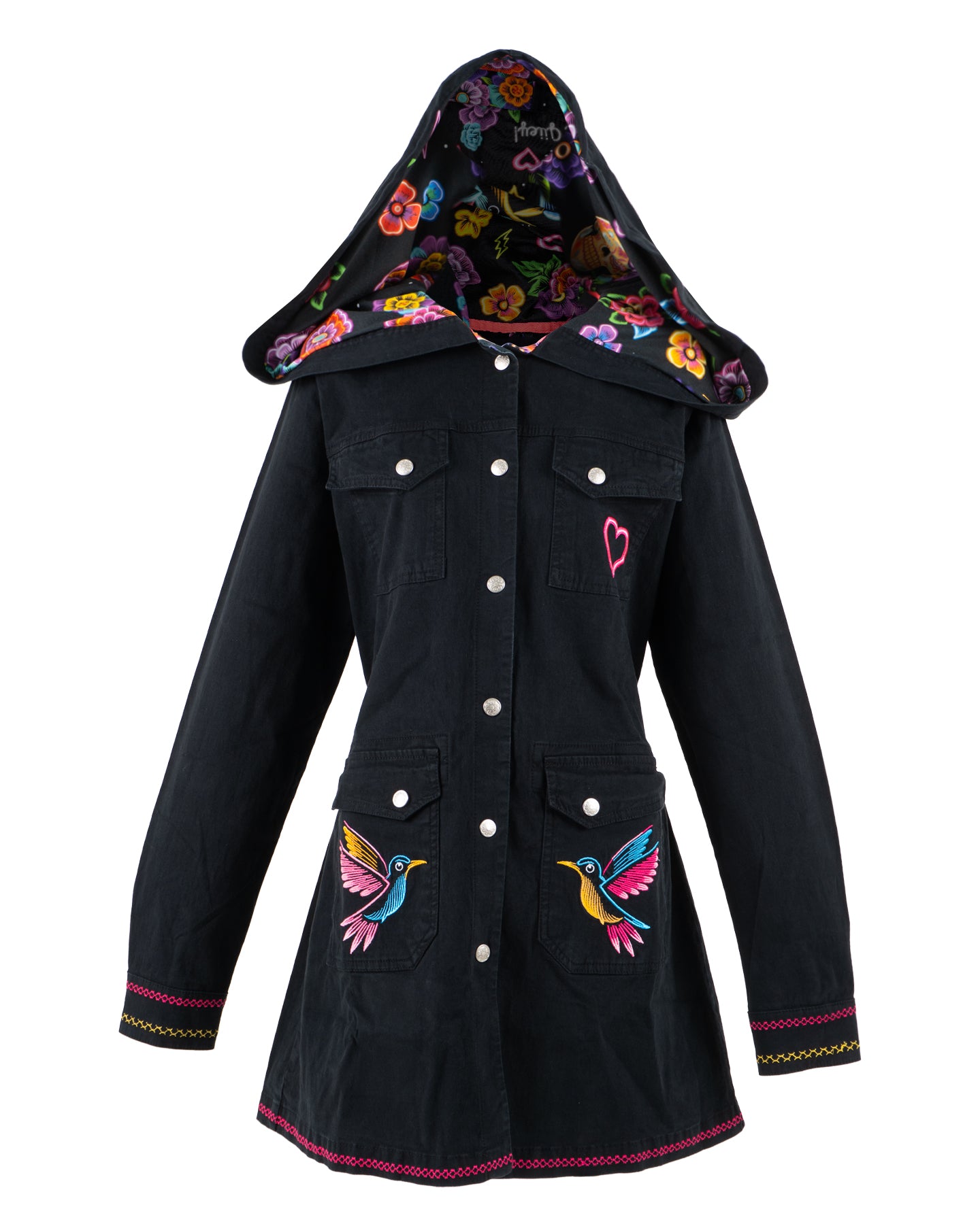 El exterior, en un elegante negro, contrasta con su interior: un vibrante estampado de flores y calaveras de azúcar que evoca el Día de Muertos. Este diseño se extiende a la capucha, añadiendo un toque de color a tu look.
