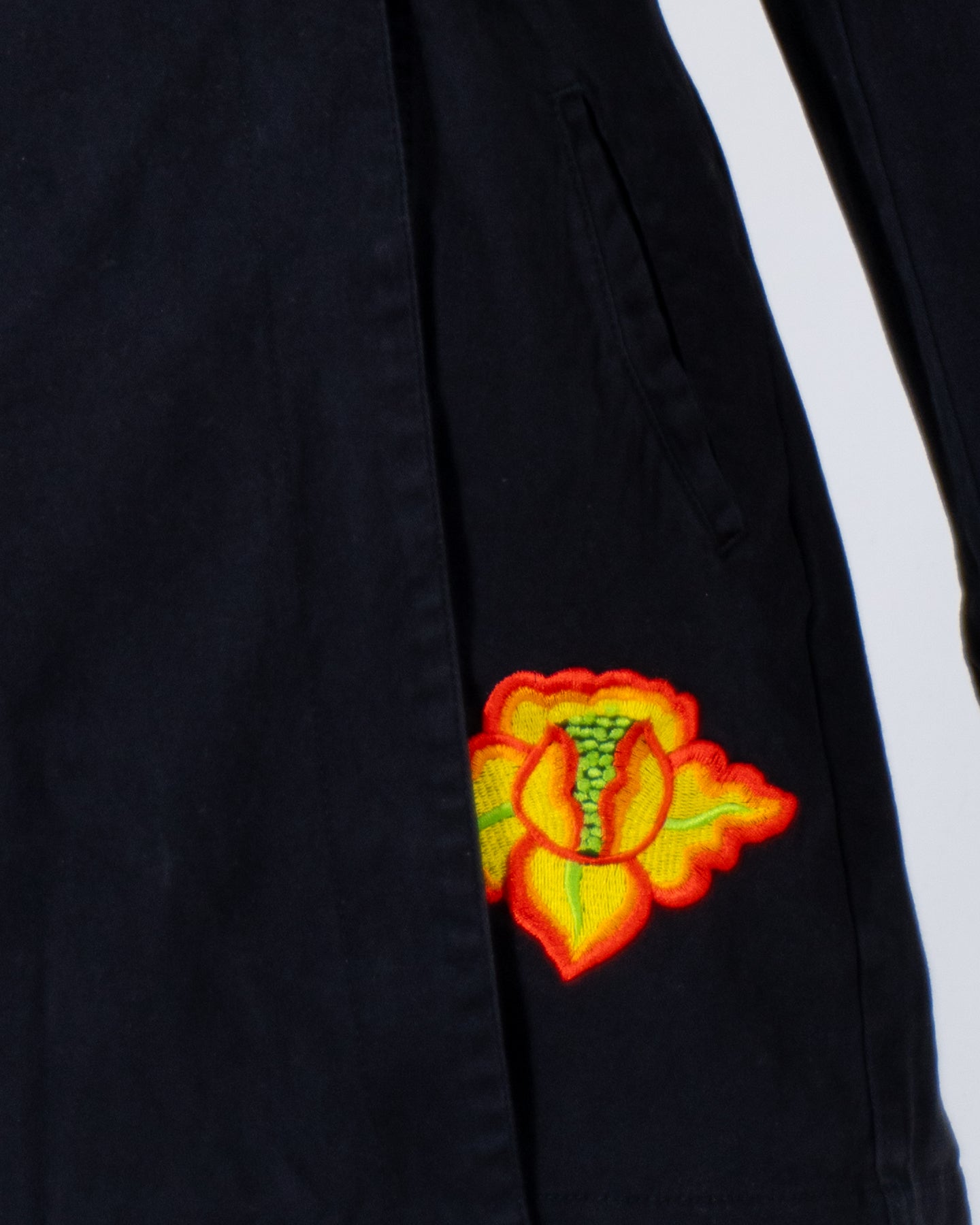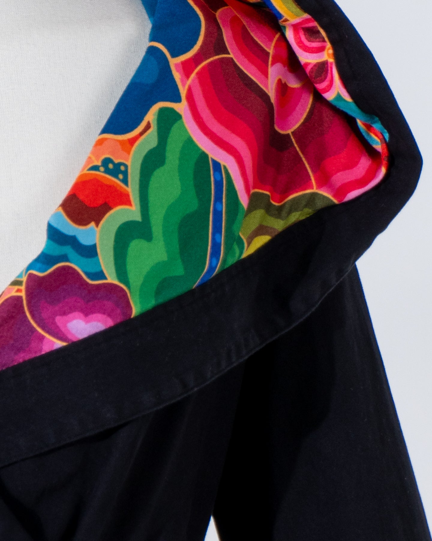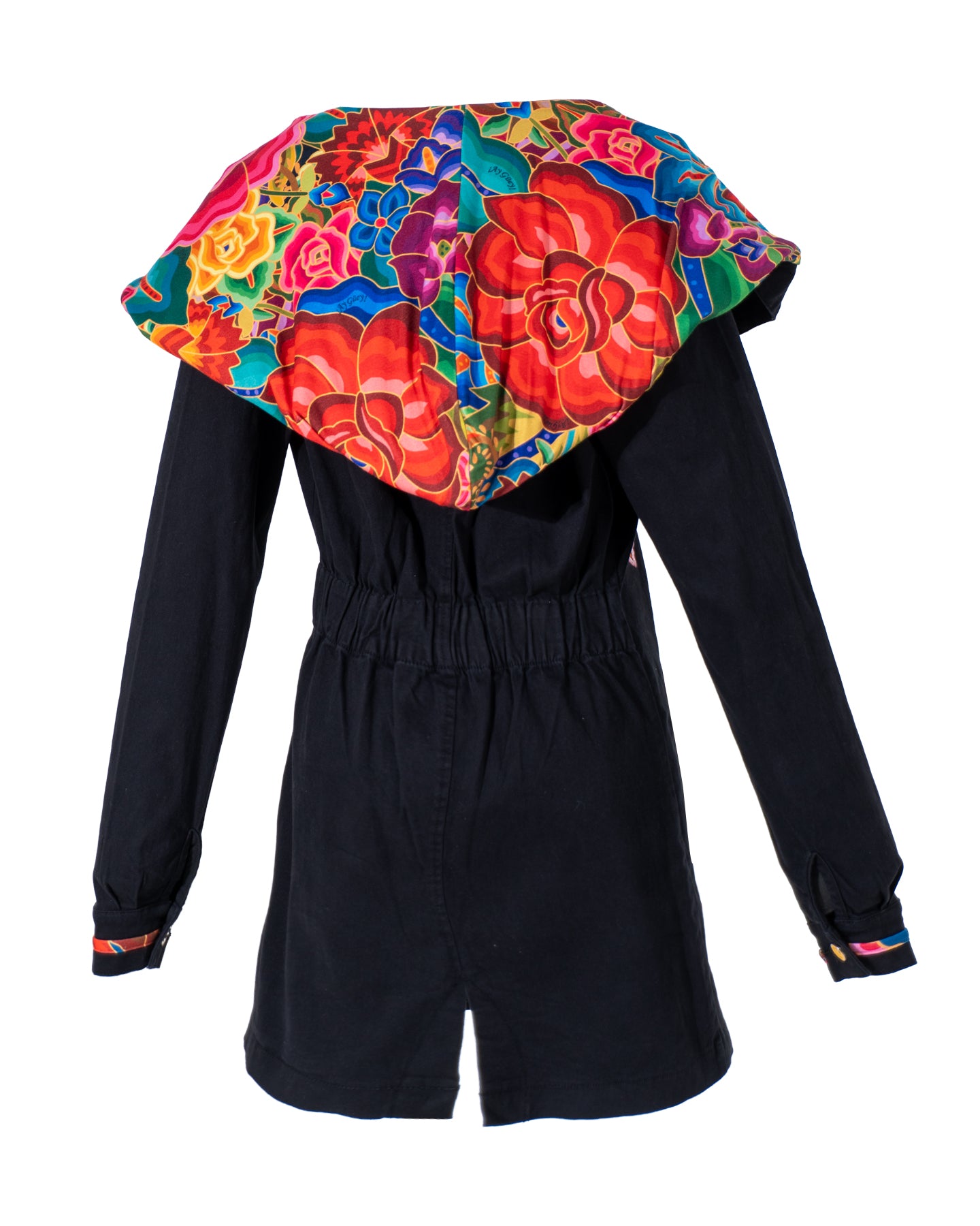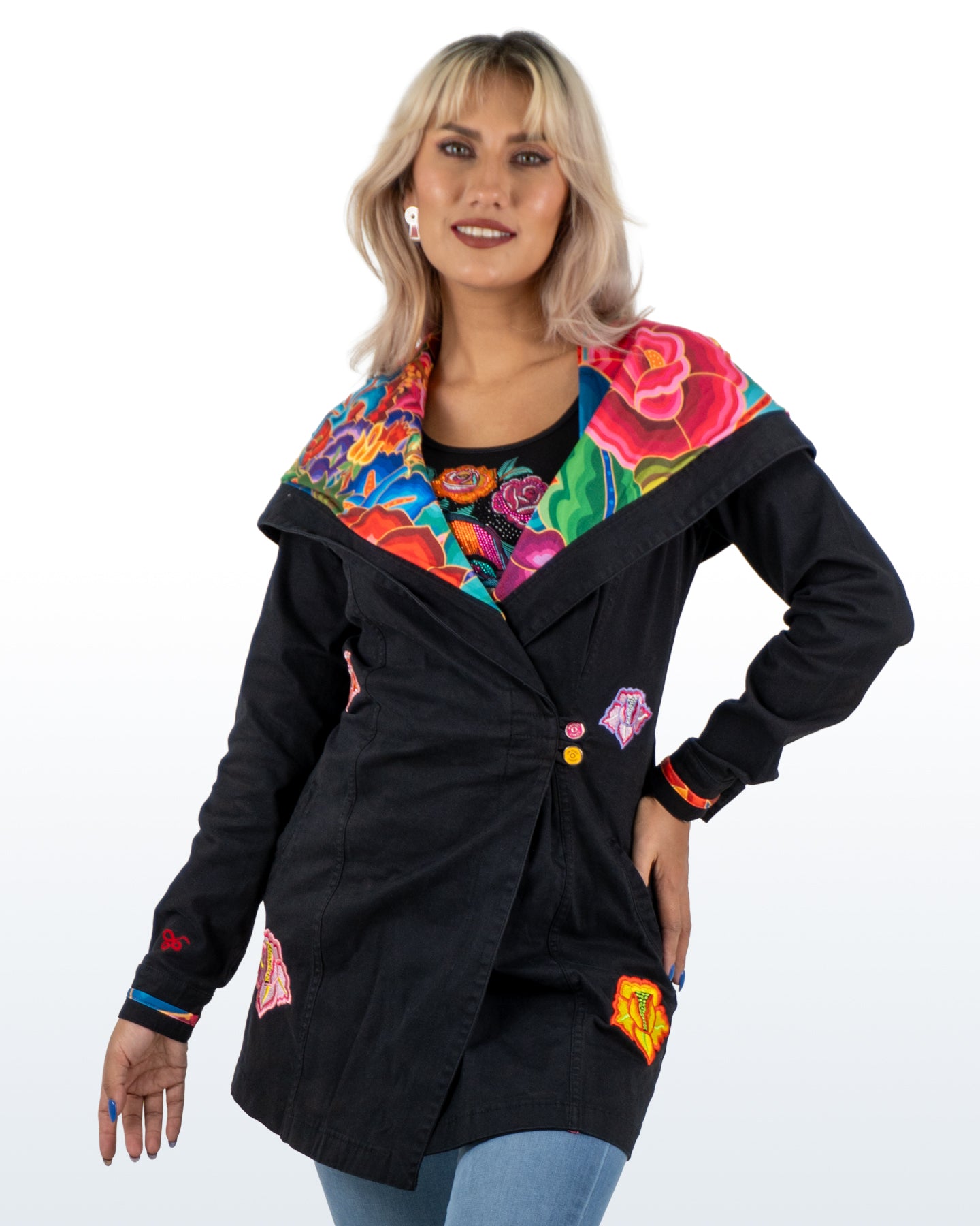Chamarra tipo abrigo. La Lola es mucho más que una simple prenda de abrigo. Con su colorido estampado floral y detalles bordados, esta chaqueta es elegante, versátil y única, destacando en cualquier espacio.