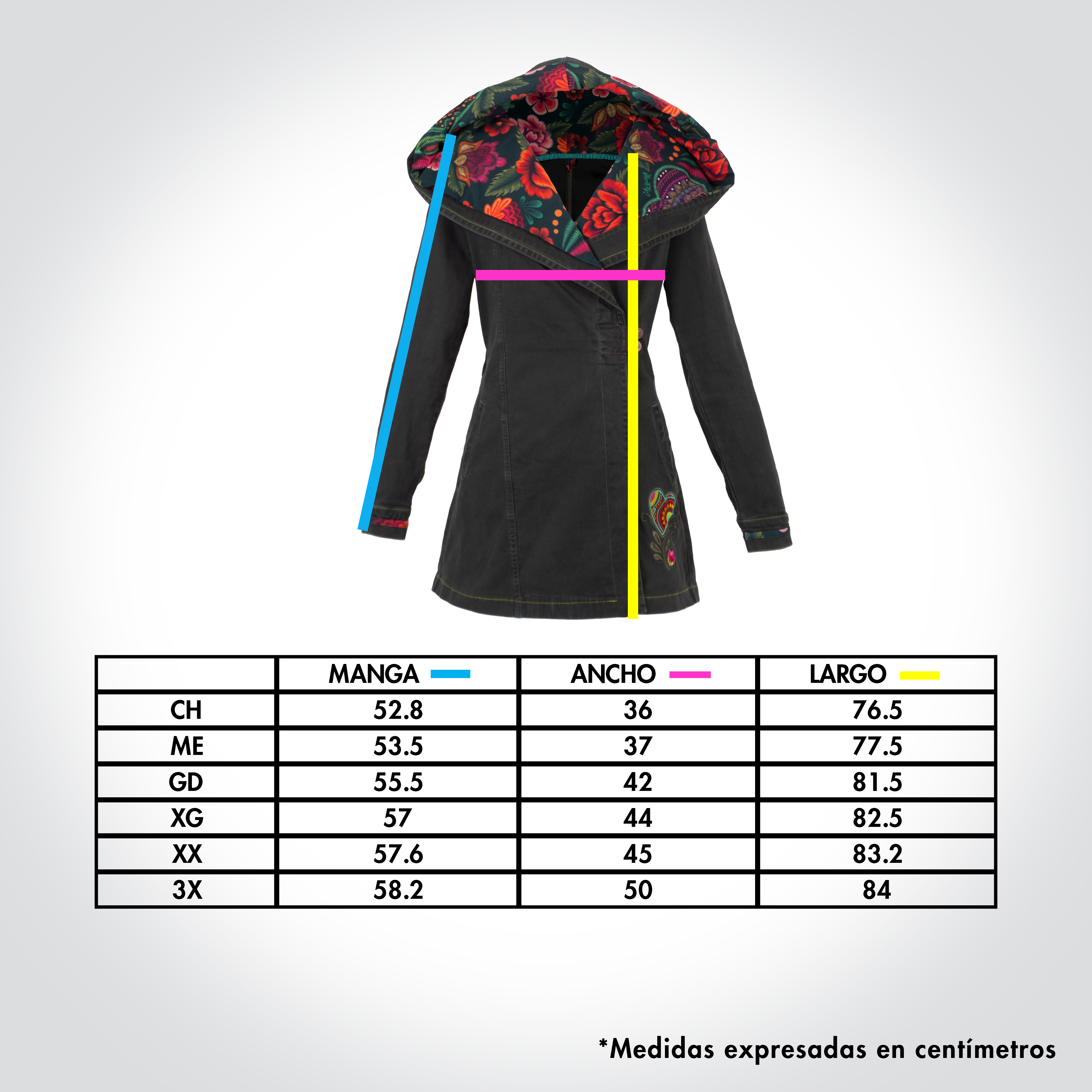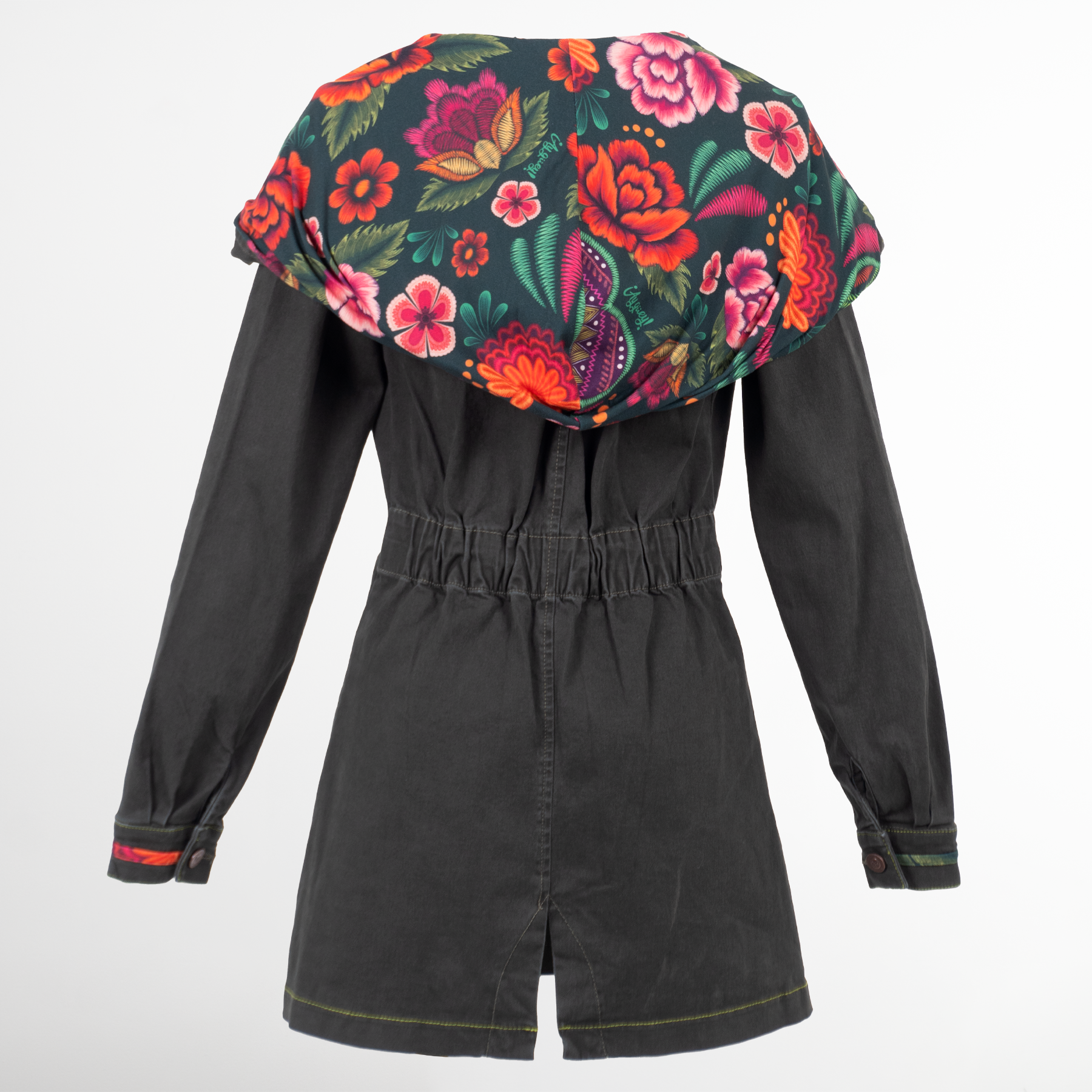 Chamarra tipo abrigo. La Lola es mucho más que una simple prenda de abrigo. Con su colorido estampado floral y detalles bordados, esta chaqueta es elegante, versátil y única, destacando en cualquier espacio.