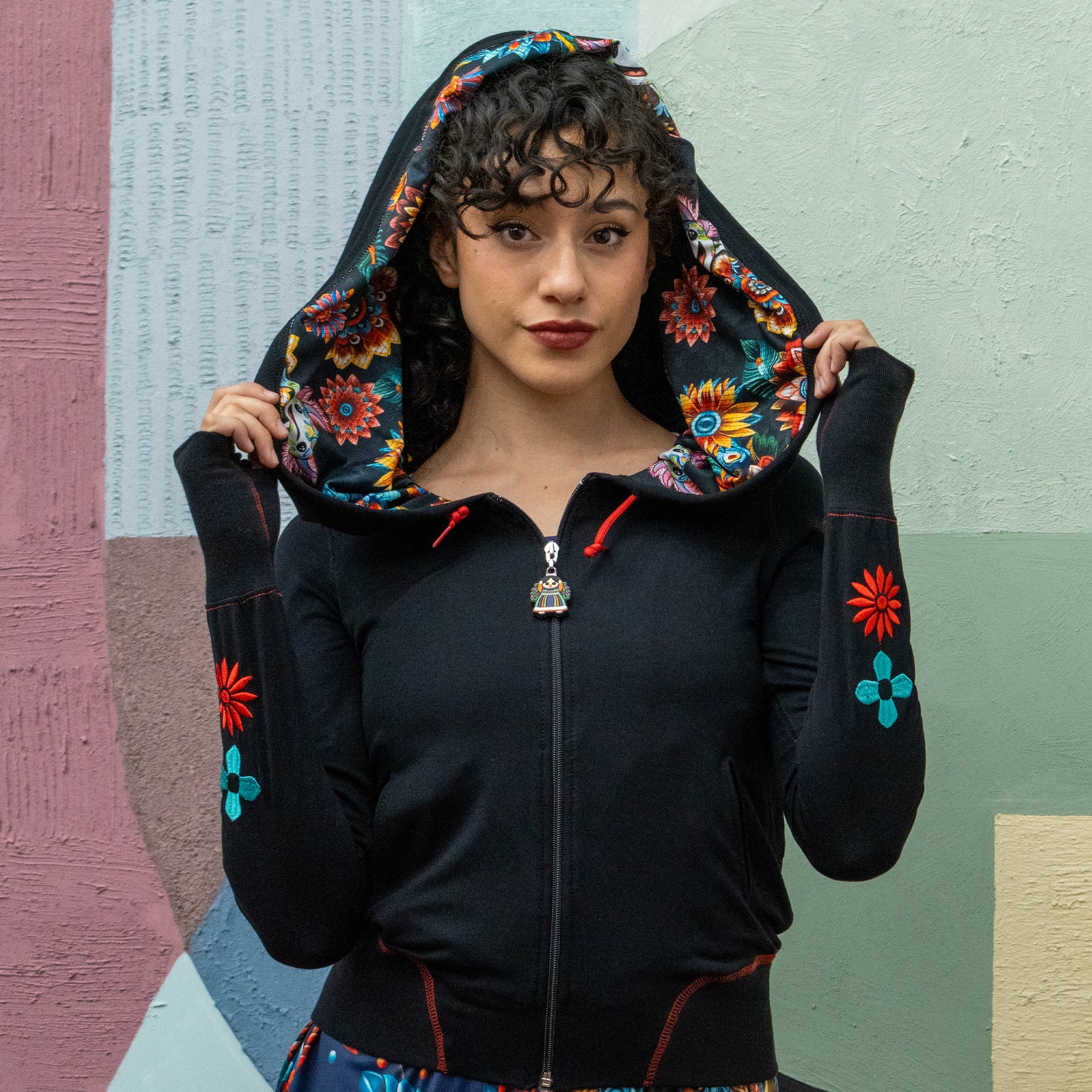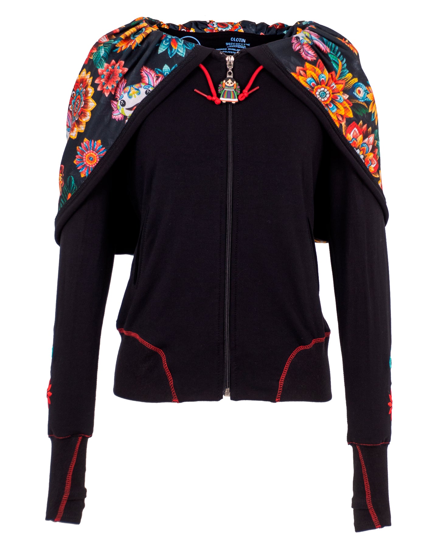 El gorro de esta prenda puede usarse como bufanda, estilo "tehuana" o convertirse en bolsa.