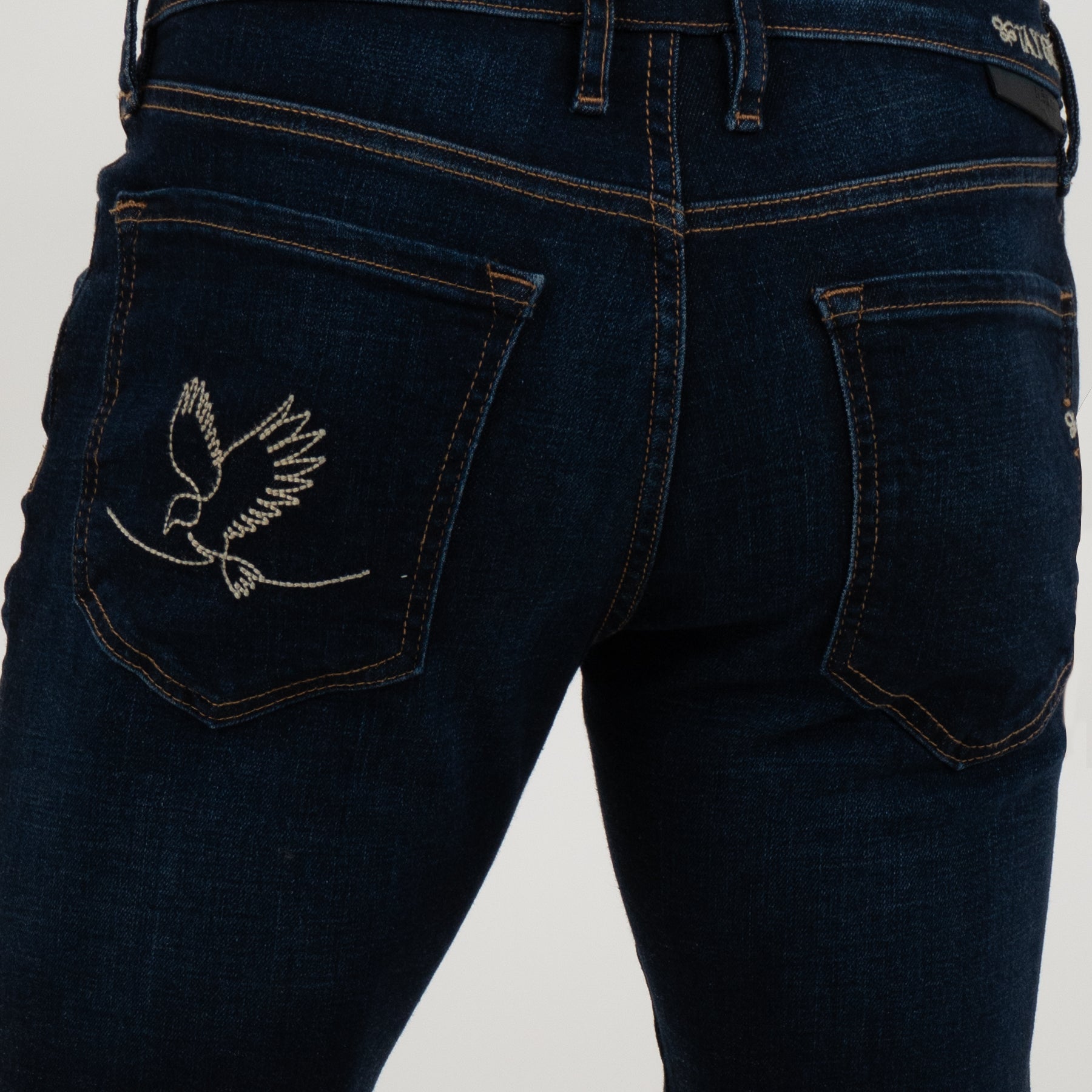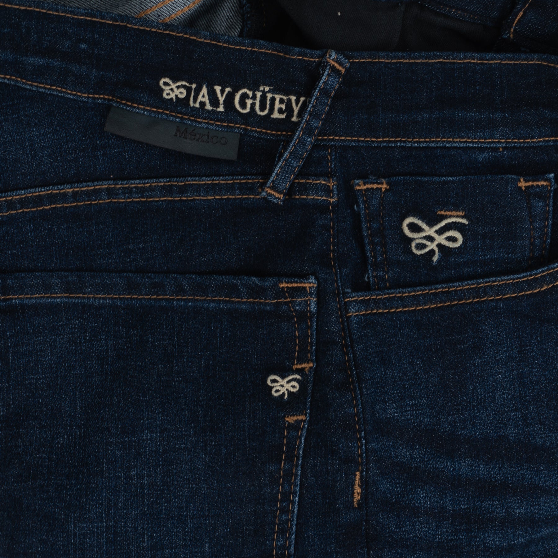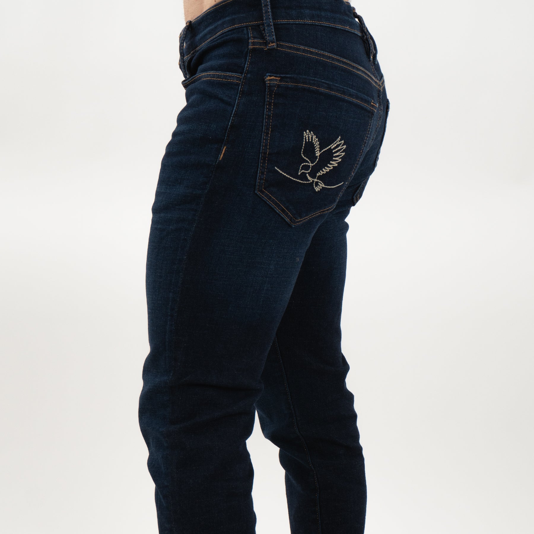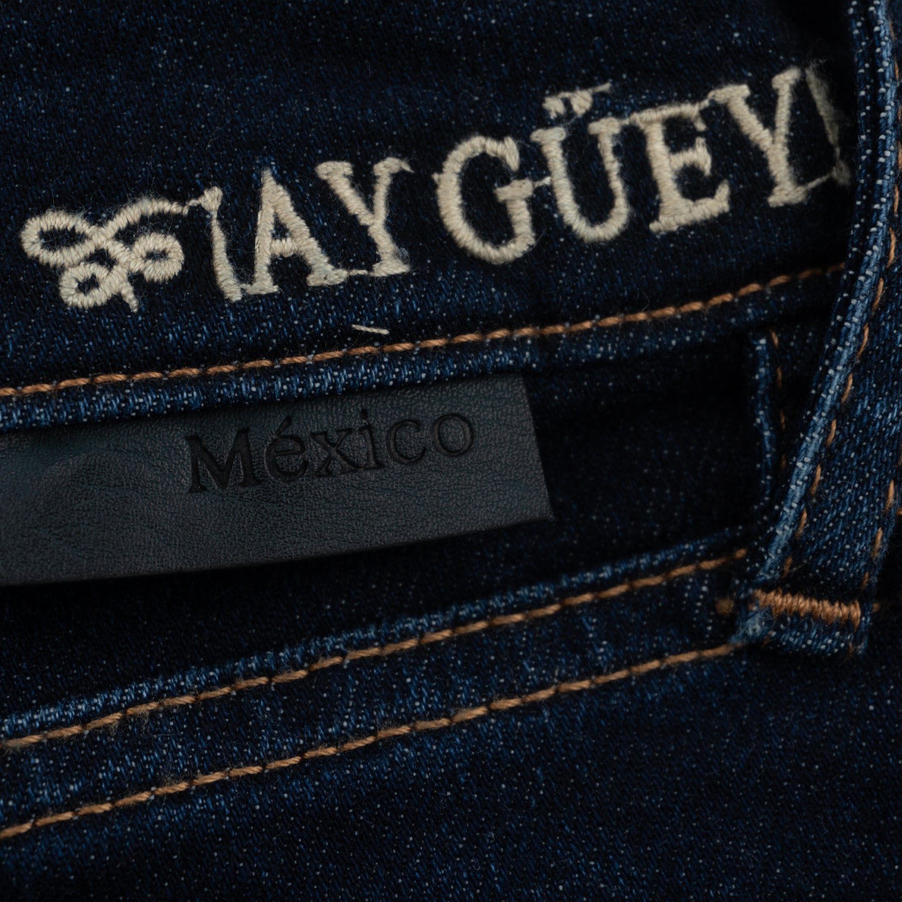 Jeans mezclilla stretch. Diseño inspirado en el aguila, especie representativa para los mexicanos, ya que forma parte del escudo nacional originado a partir de la fundación de México-Tenochtitlán, el águila sagrada posada sobre un nopal representaba a Huitzilopochtli: Dios de la guerra. Este diseño lleva consigo un significado cultural, celebrando la identidad y el patrimonio de México.