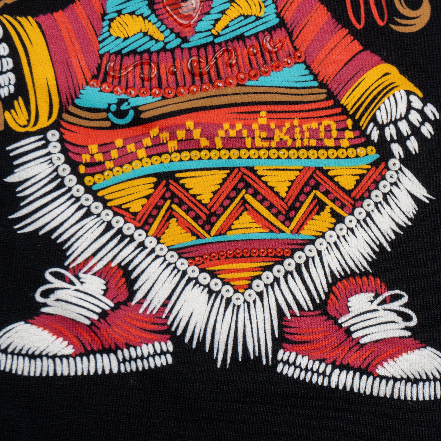 Luce con orgullo a esta calaverita de azúcar bien mexicana, con su joronguito pa'l frío y un elote en la mano, ¡pa' que no falte el sustento! Porque aquí, hasta la huesuda le entra al elote, ¡somos hijos del maíz!