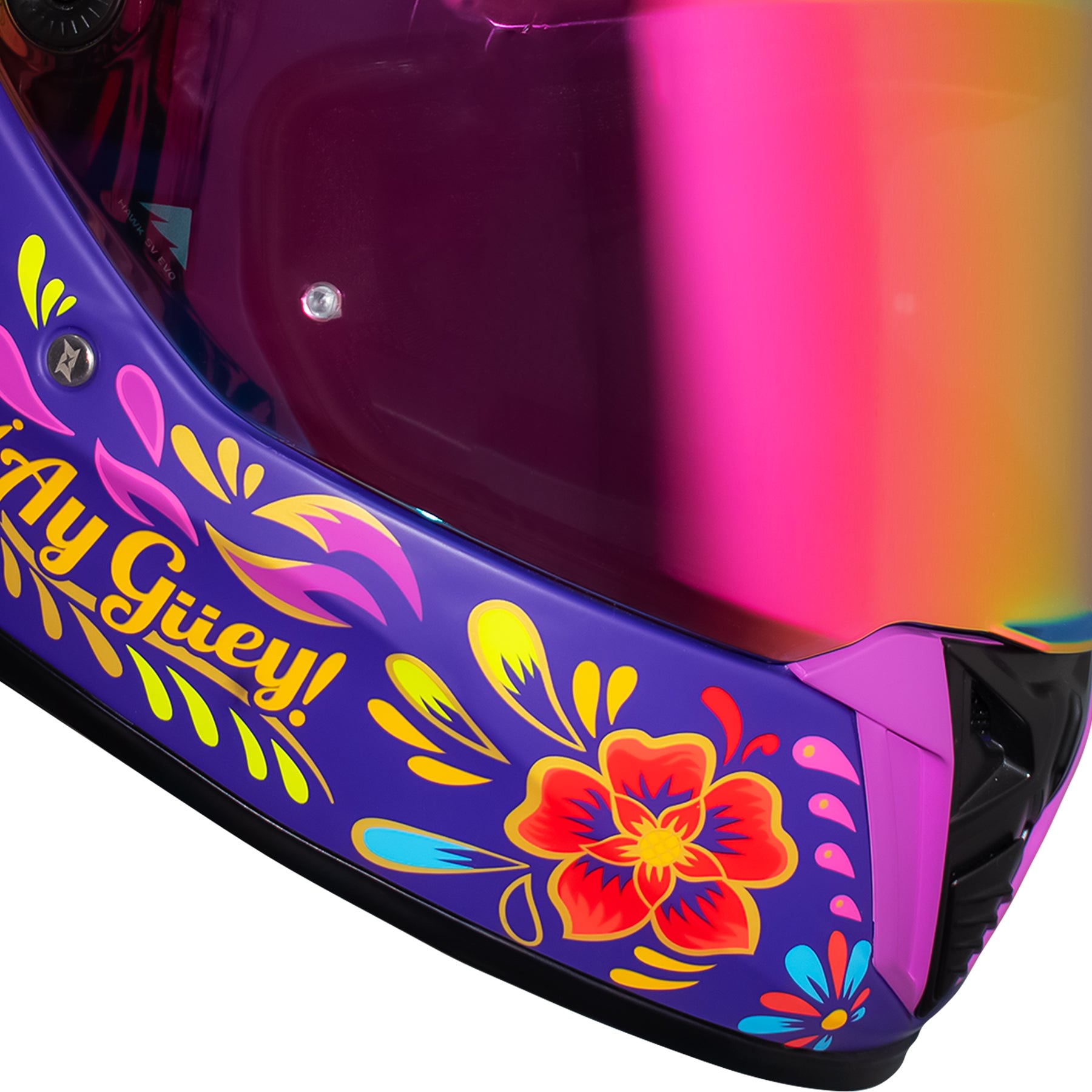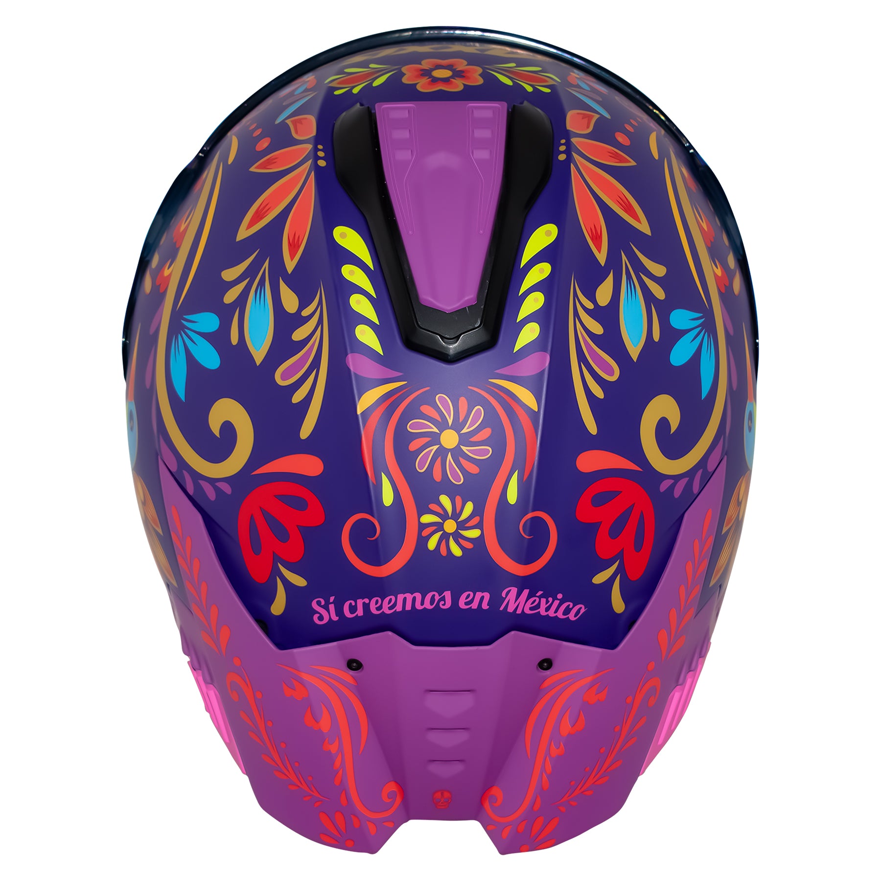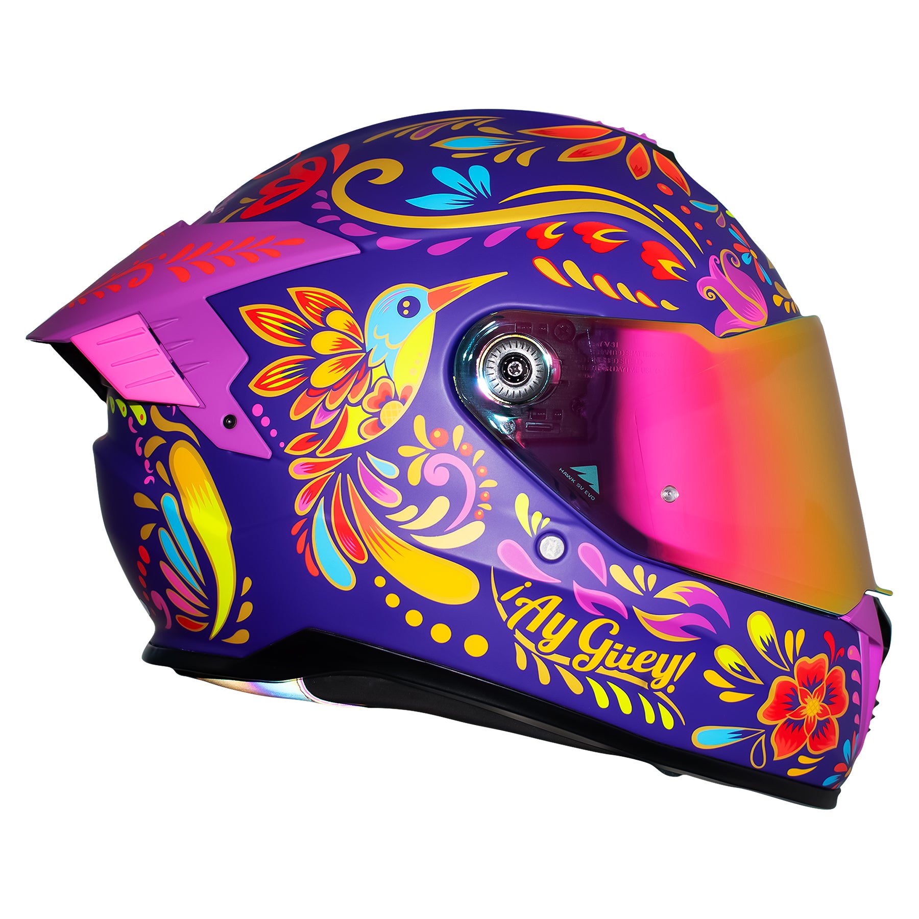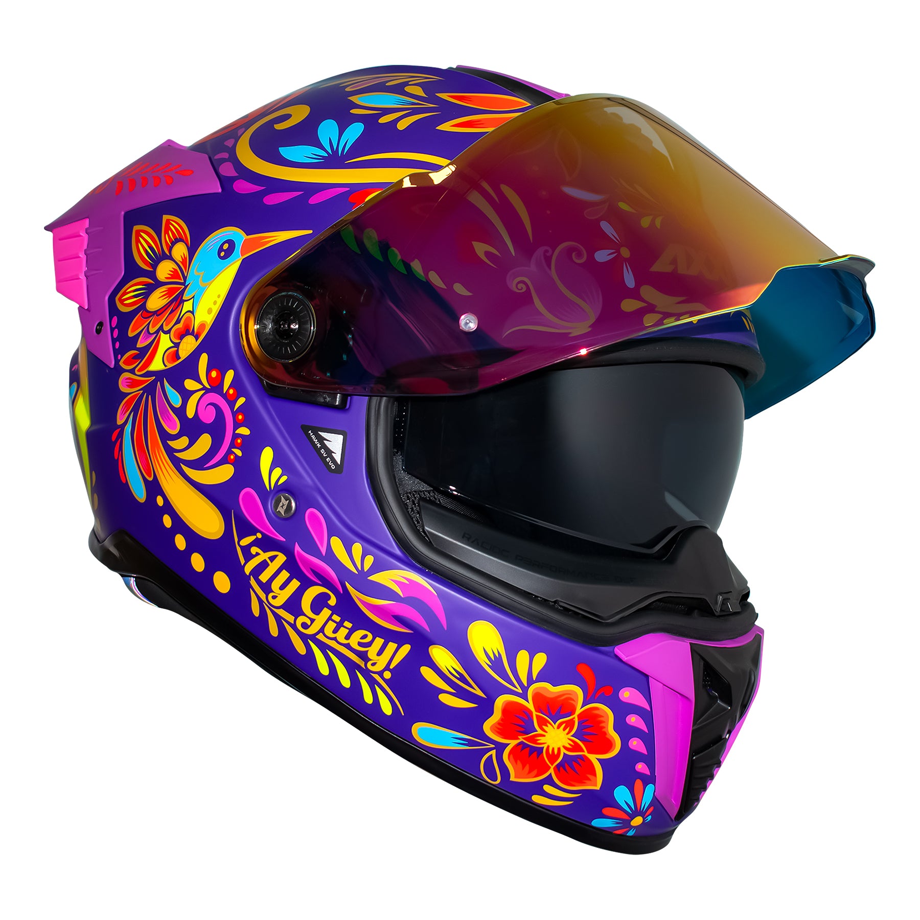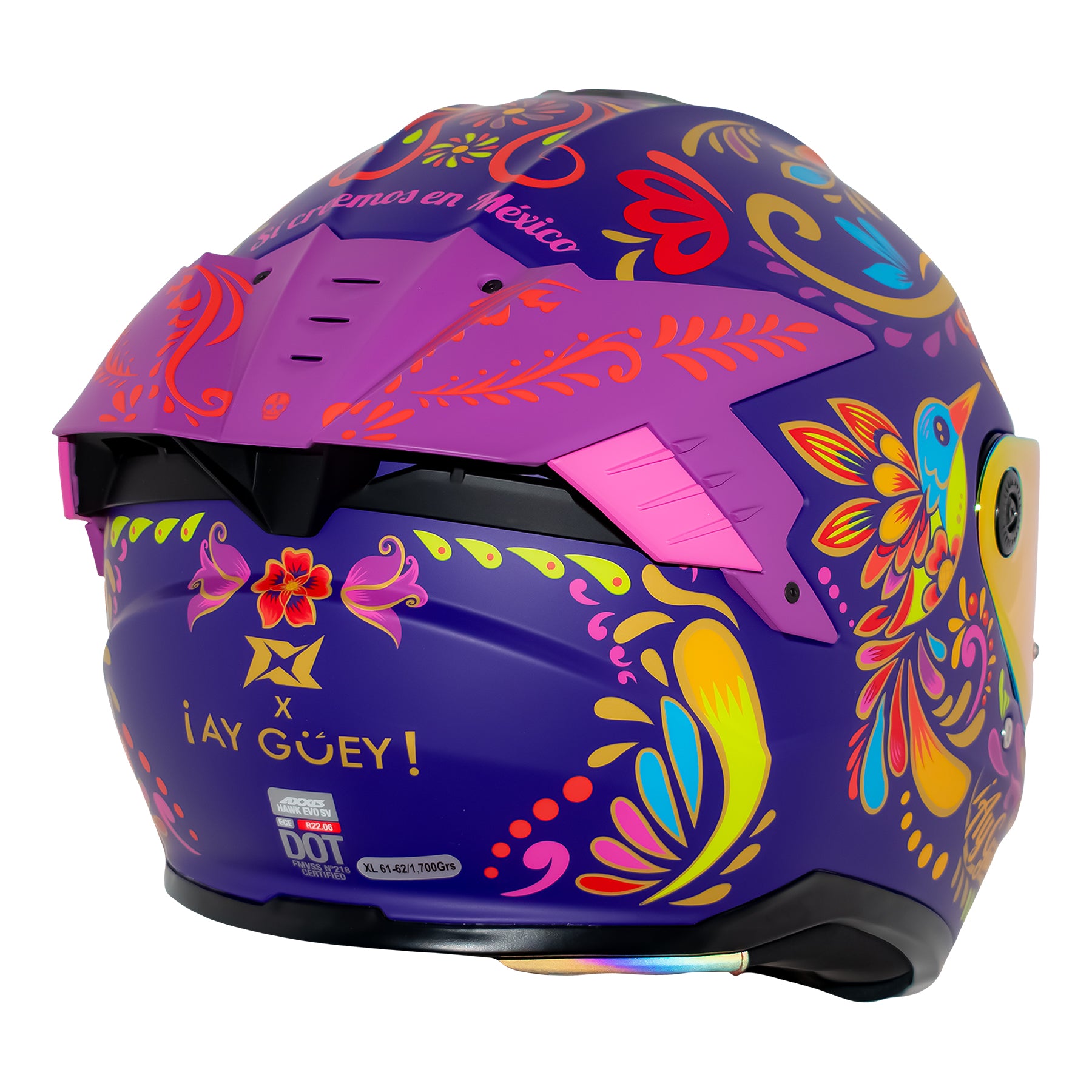 Este casco es una celebración de la rica tradición de Olinalá, plasmada en un diseño vibrante y lleno de vida. Los tonos morados profundos sirven de lienzo para coloridas flores que evocan la alegría y el folclor mexicano. En el centro de esta explosión de color, un colibrí majestuoso, símbolo de libertad y buena fortuna, se alza como el protagonista de esta obra de arte rodante.