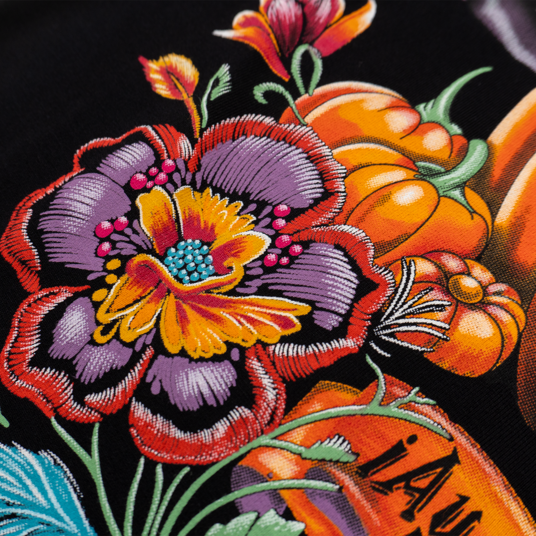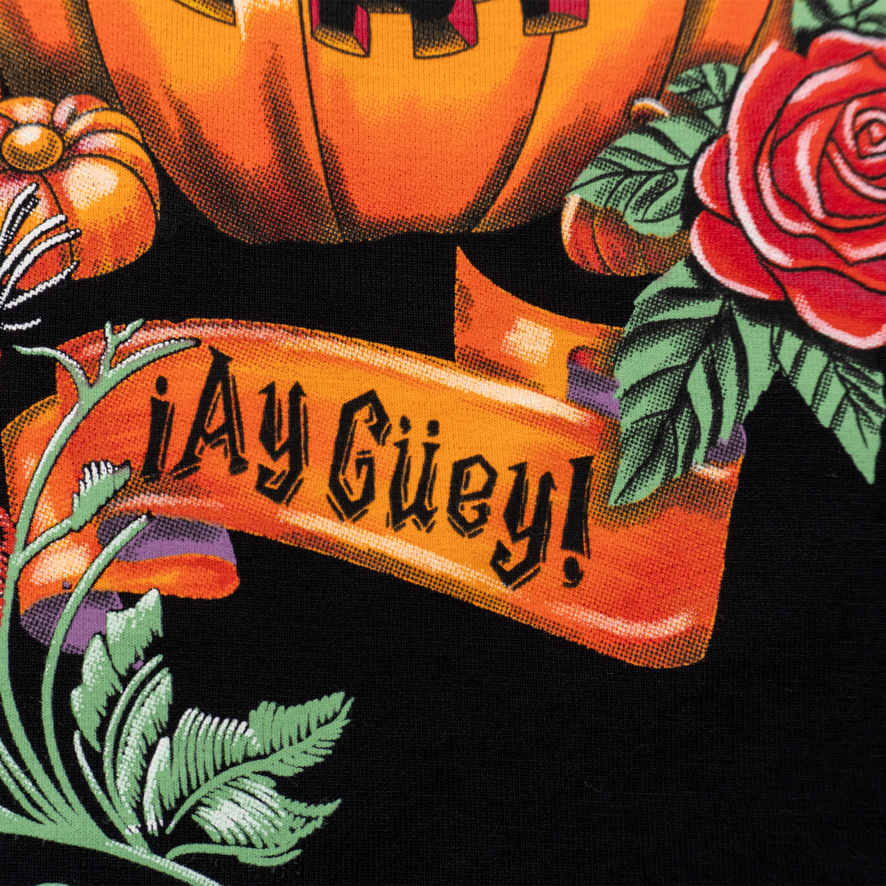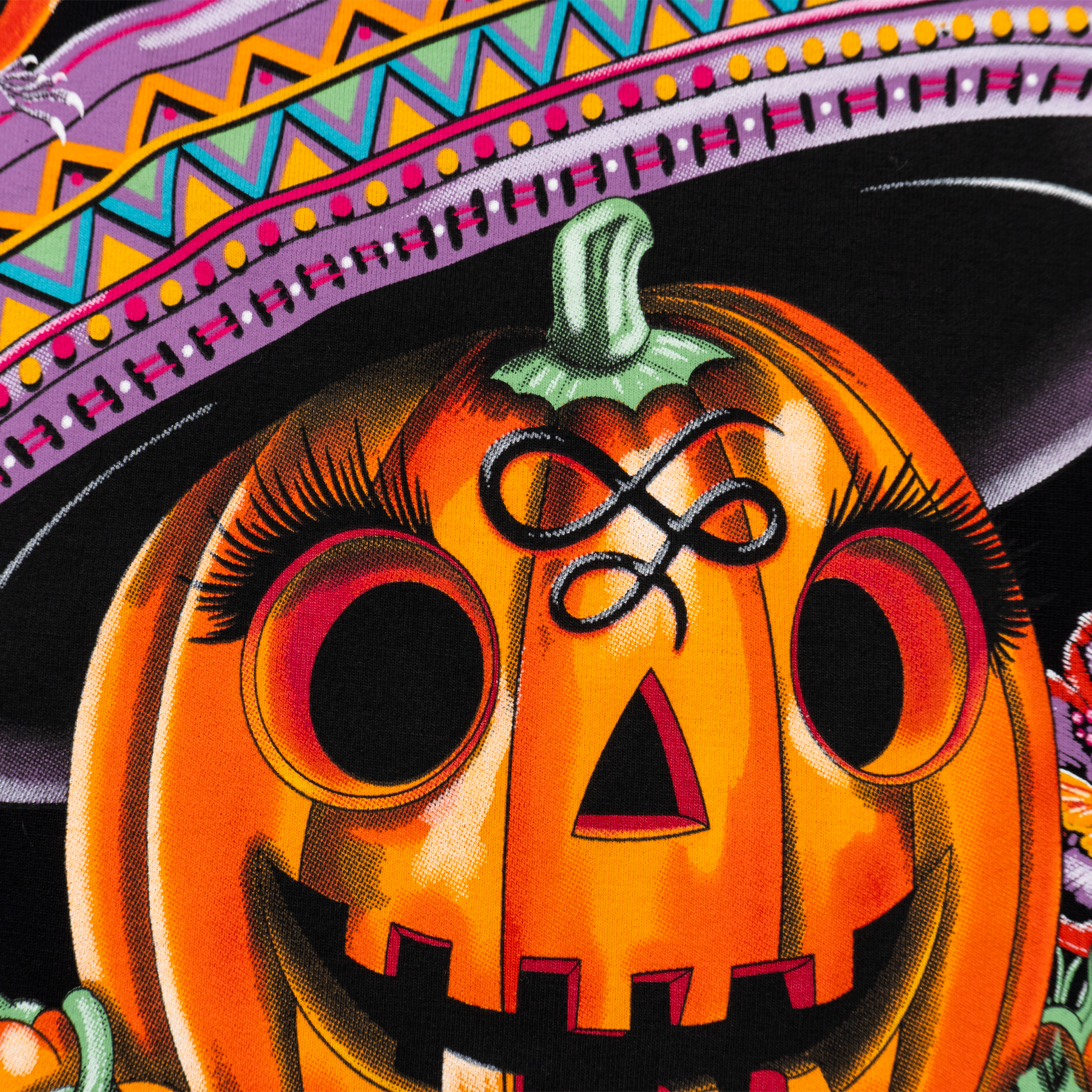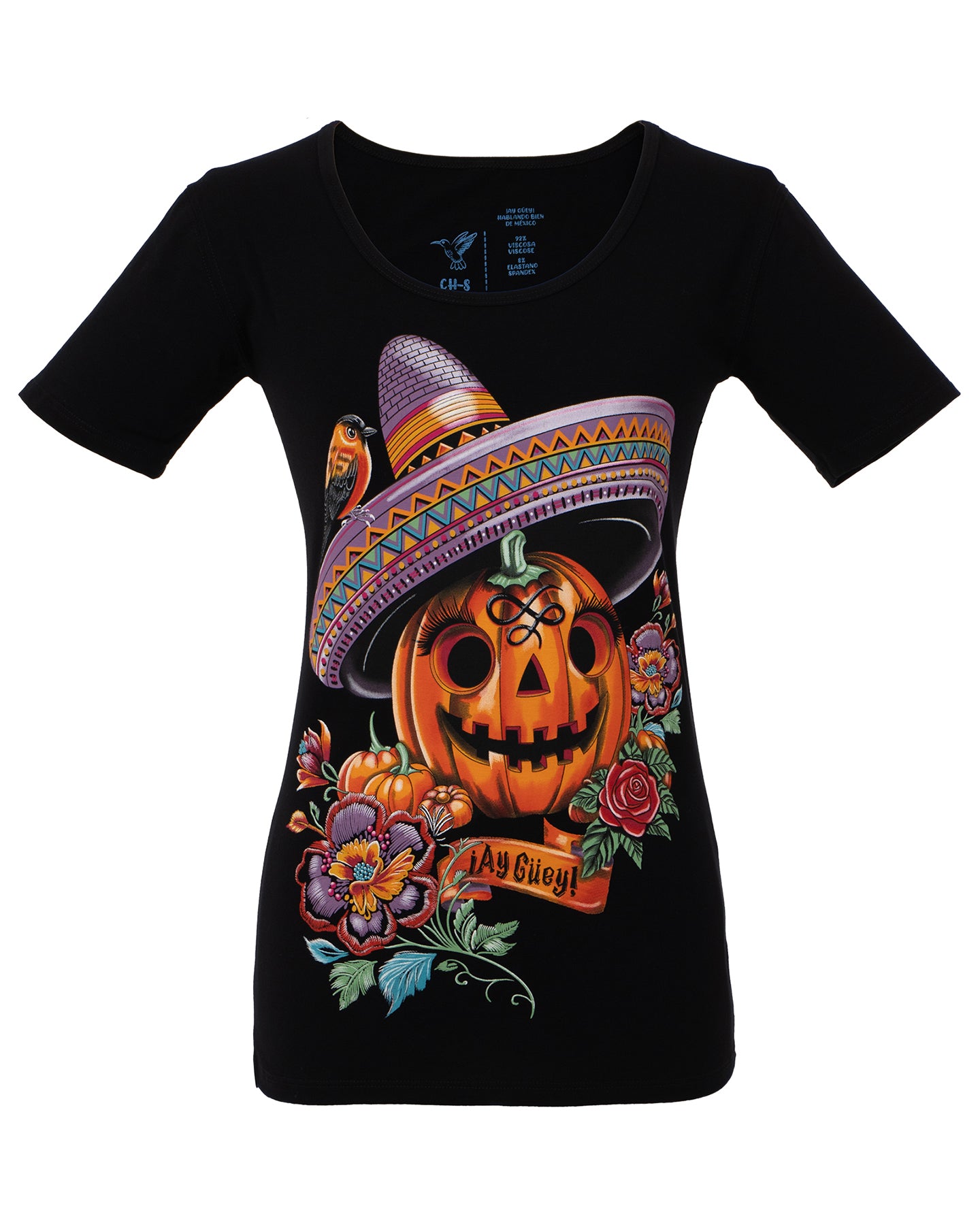 ¡Celebra dos tradiciones en una! Esta playera de mujer de manga corta combina el Día de Muertos en México y Halloween en el vecino país del norte. ¡Únete a la celebración con Calabaceando!