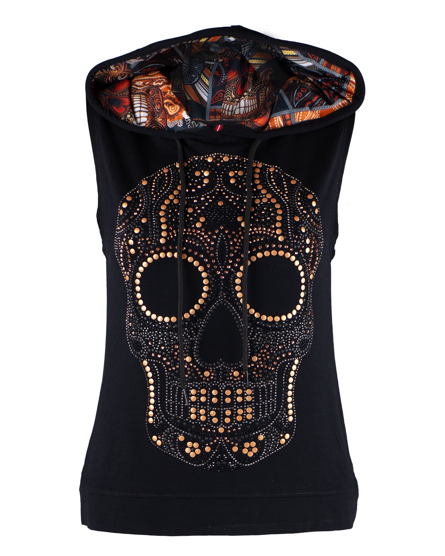 ♦️Playera con gorro y sin mangas con aplicación de estoperol dorado para mujer - Modelo ADORADA