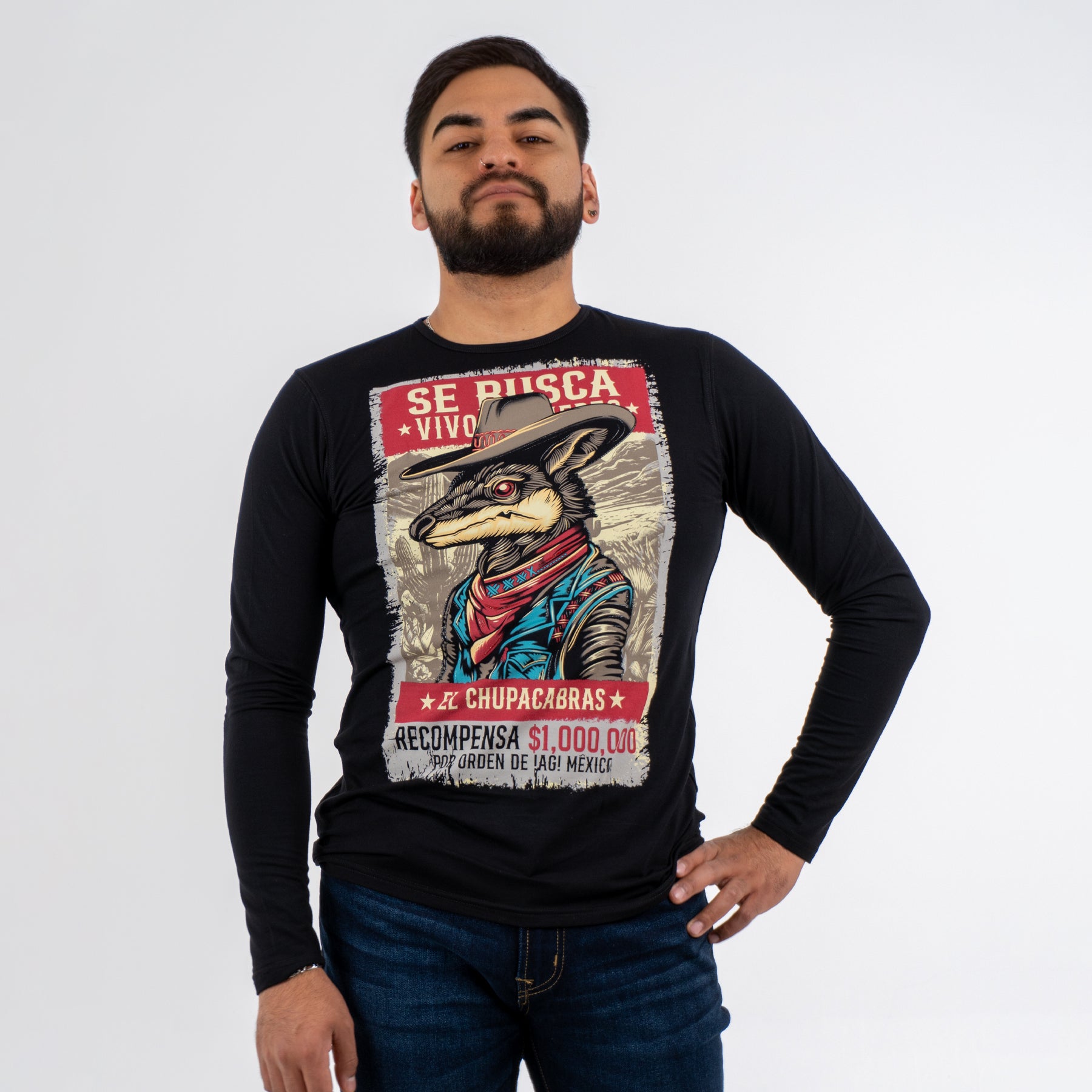 ♦️Playera manga larga estampada con aplicación de tinta gel HD para hombre - Modelo CHUPACABRAS