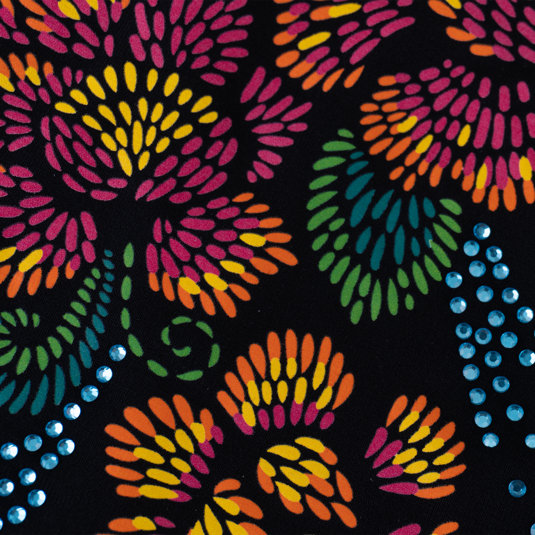 Playera básica de dama con cuello redondo. El estampado frontal tiene a un colibrí de pedrería con flores estampadas que emulan el bordado con hilo. Inspirada en el brillo del plumaje del colibrí, en la naturaleza y los bordados mexicanos.