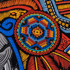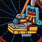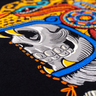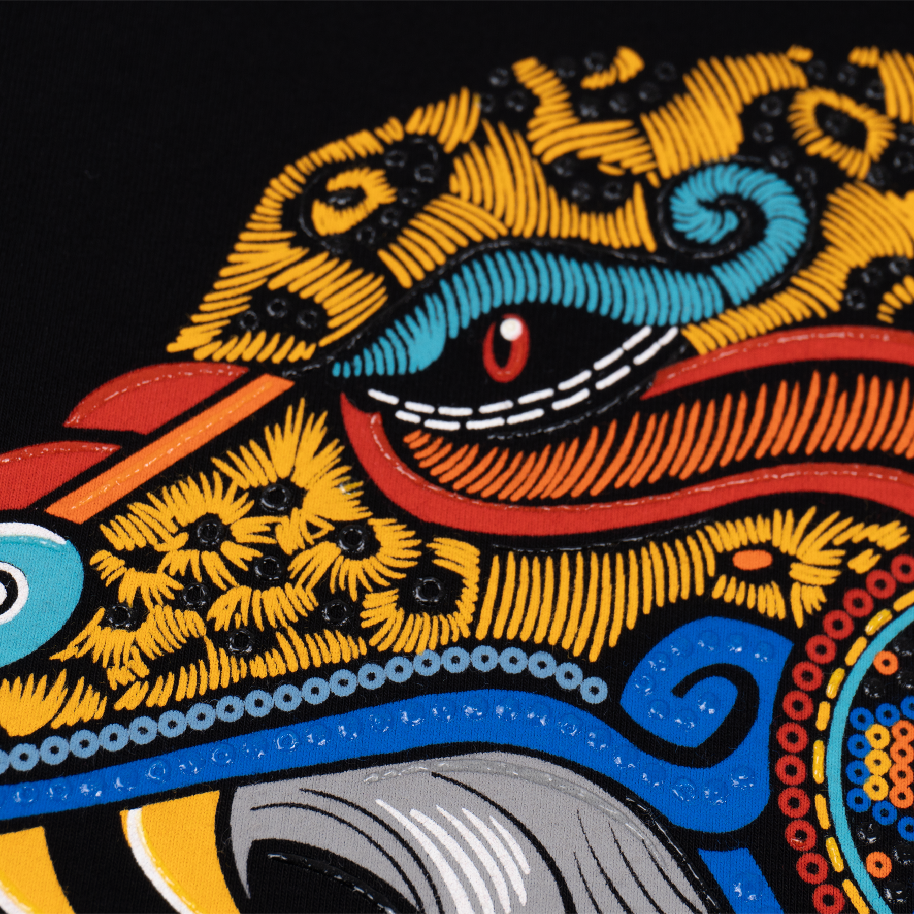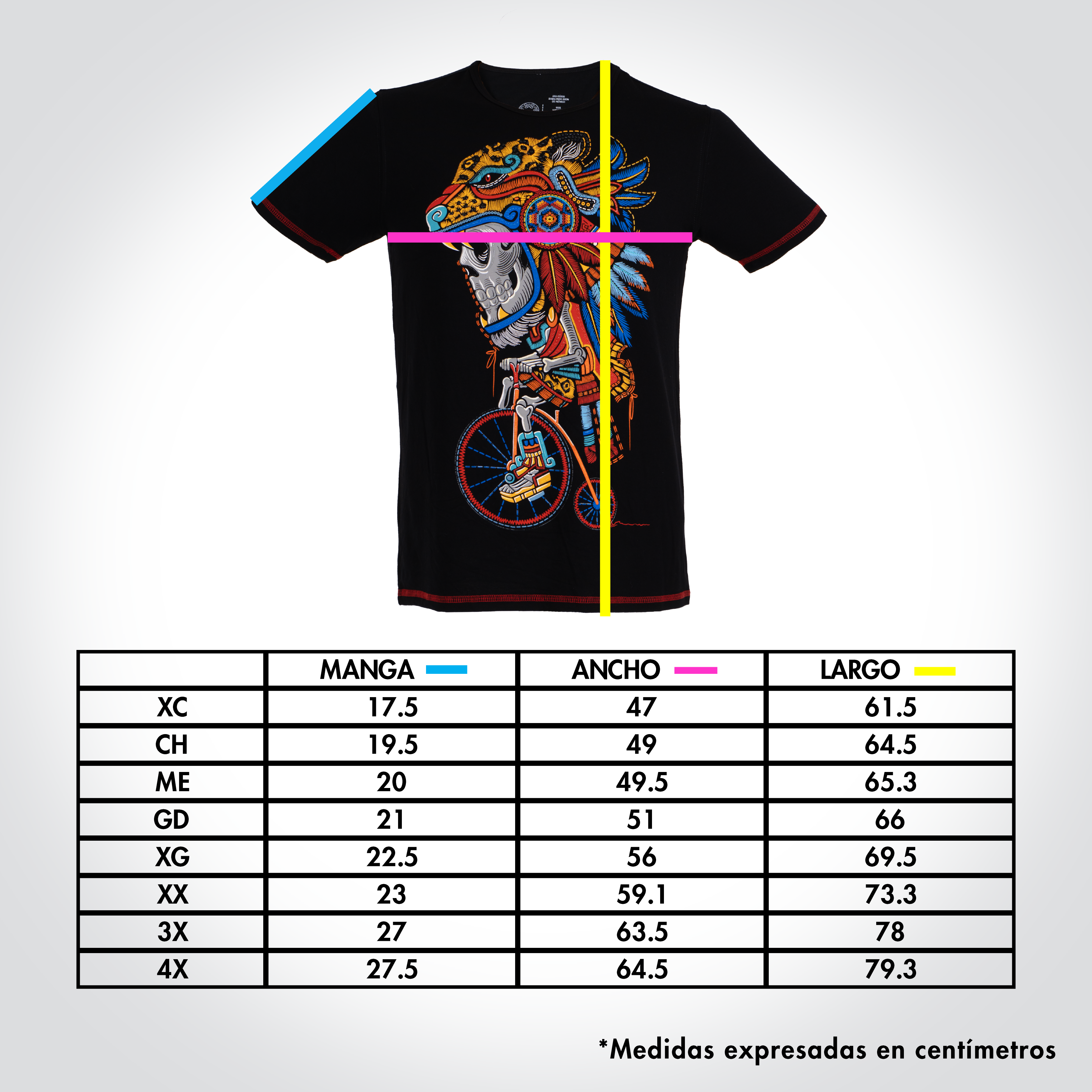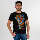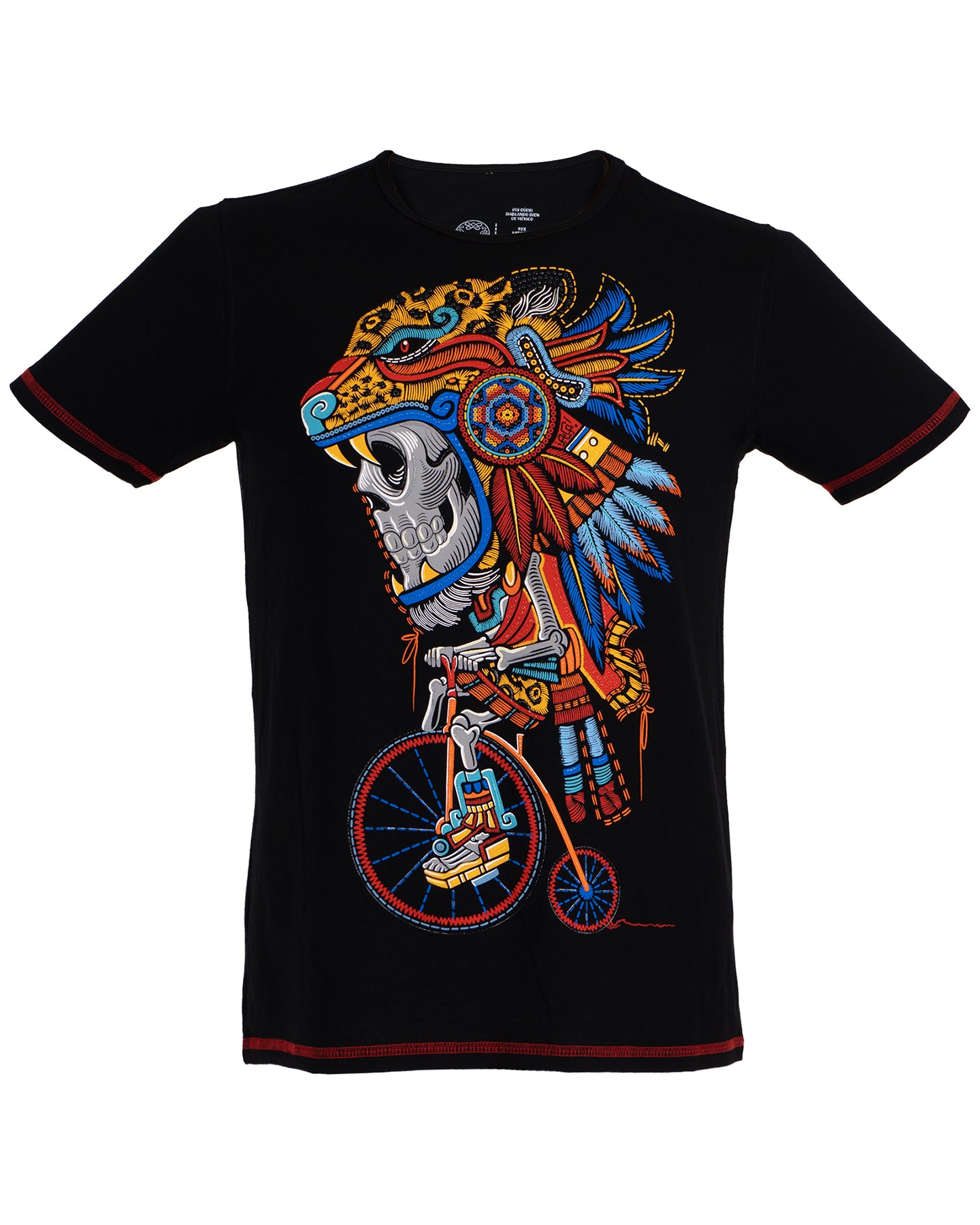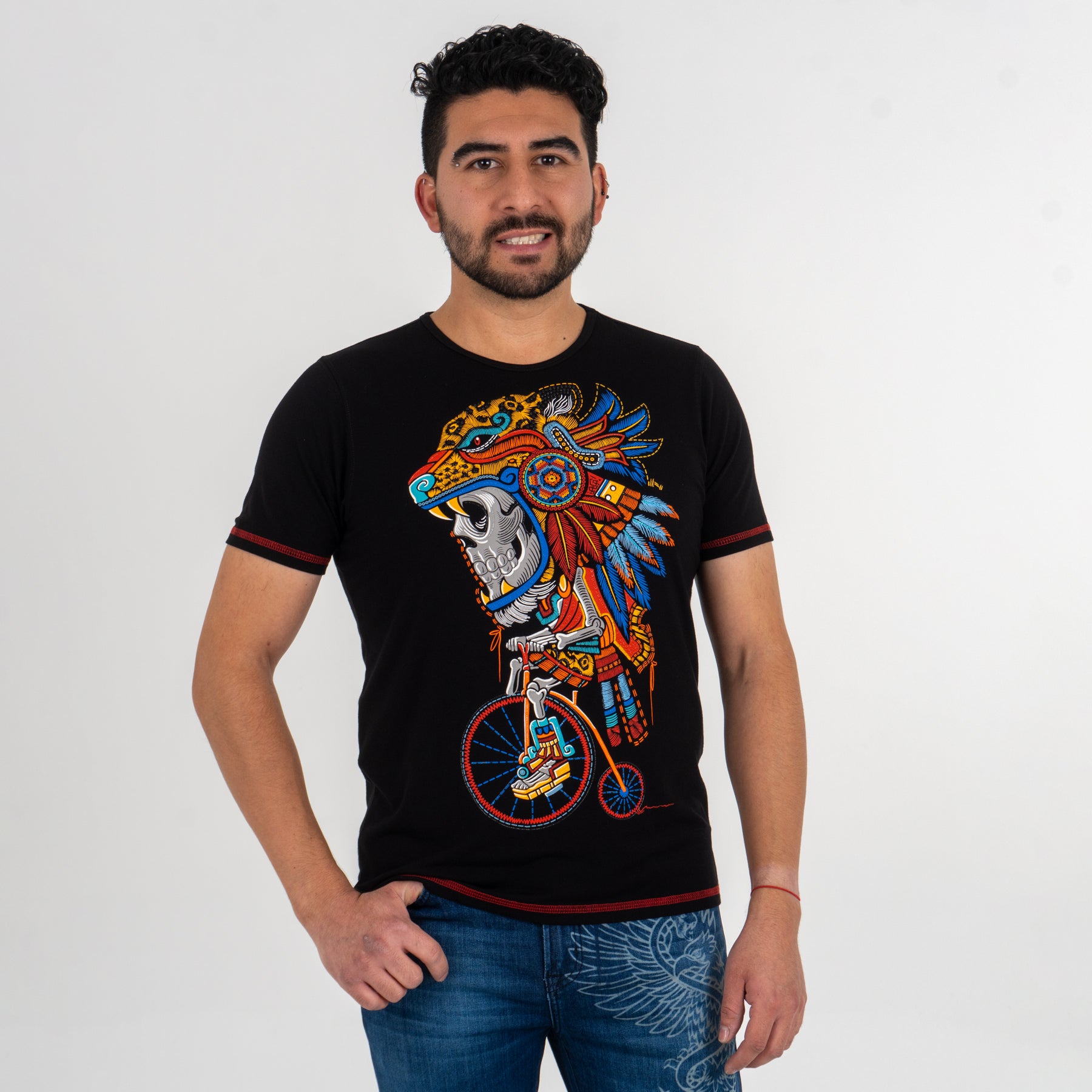 Playera de caballero en color negro. Este guerrero jaguar, pasea en bicicleta con una expresión juguetona y alegre. Todo el diseño tiene una energía divertida y vibrante, con un enfoque en la artesanía y el color.