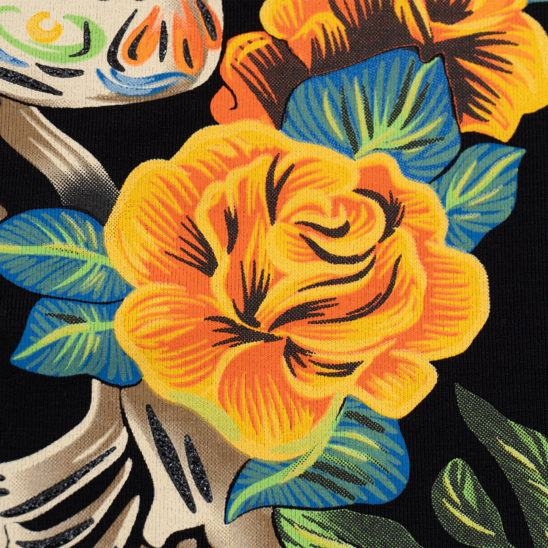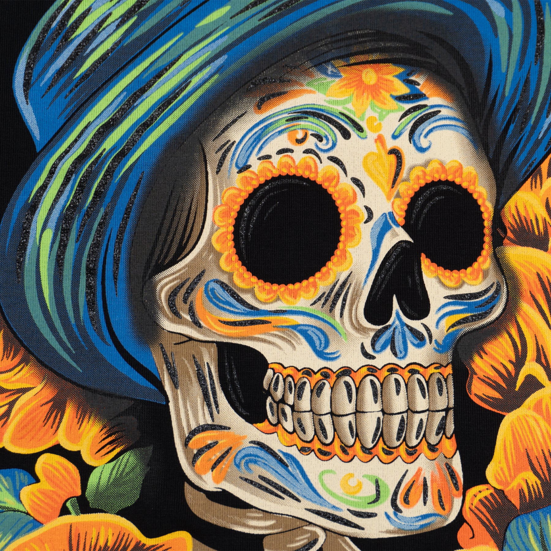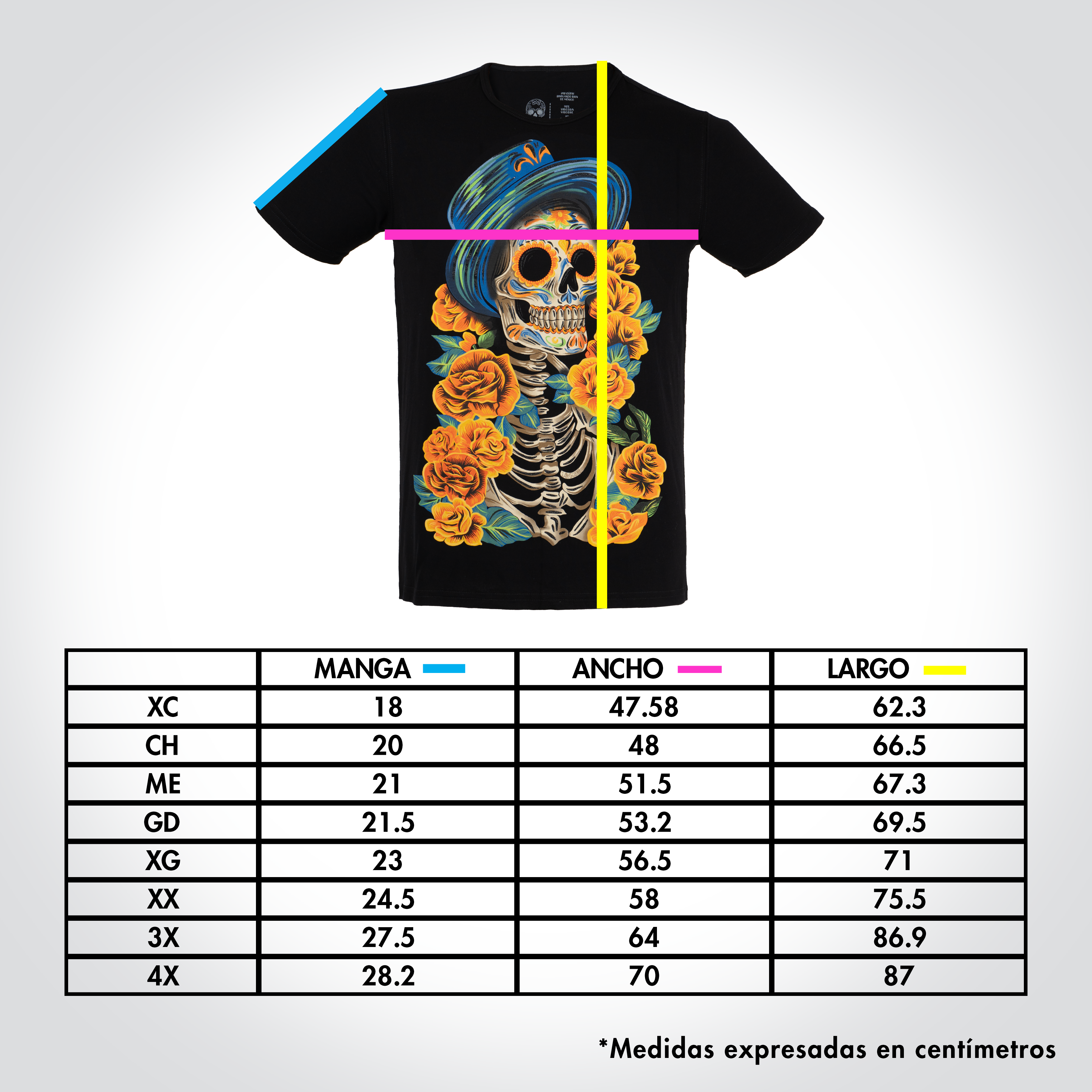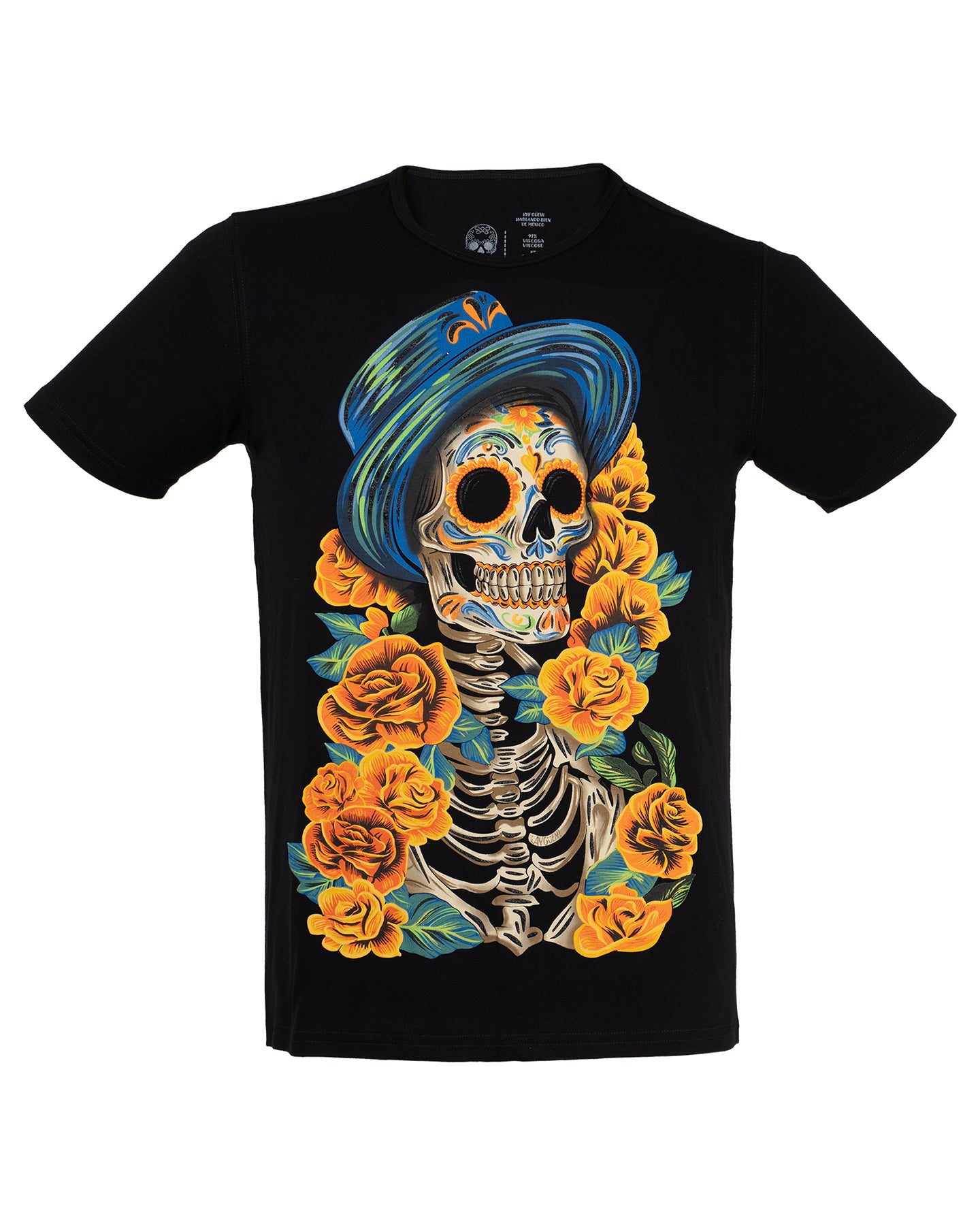 Playera de caballero en color negro con manga corta, estampada al frente. En uno de los diseños predilectos para el Día de Muertos, el elegante Catrín usa su peculiar sombrero azul, rodeado de Cempasúchil y sus pétalos, en su textura y color, brillan casi como si estuvieran vivos, reflejando la luz de un sol que parece lejano, pero eterno.