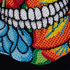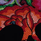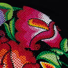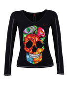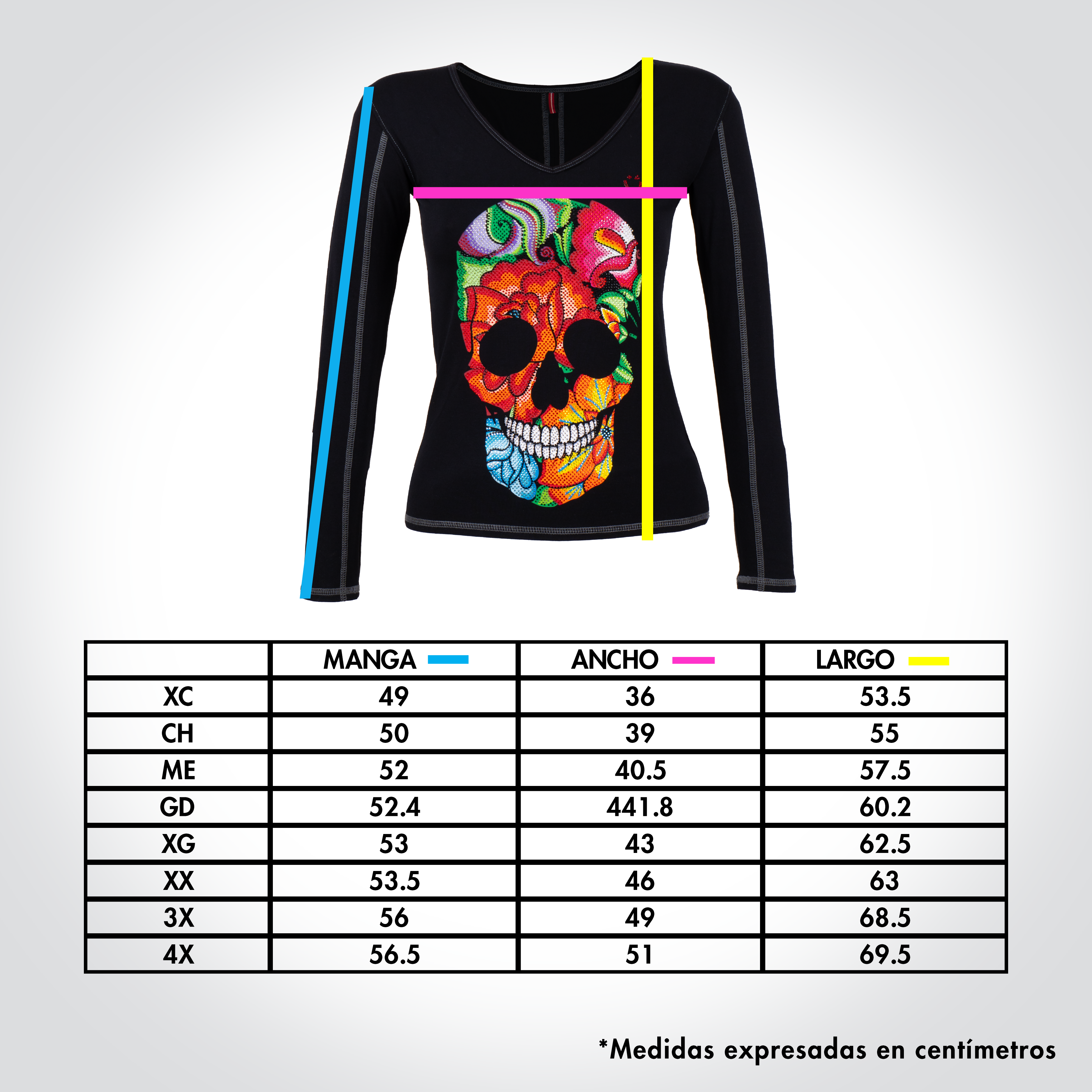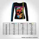Playera de dama manga larga y cuello amplio. lnspirado en las flores bordadas típicas del bordado lstmeño. En este diseño se forma la calavera de azúcar con las flores y se complementó con el diseño de pedrería para llevar el gráfico al máximo nivel de detalle.