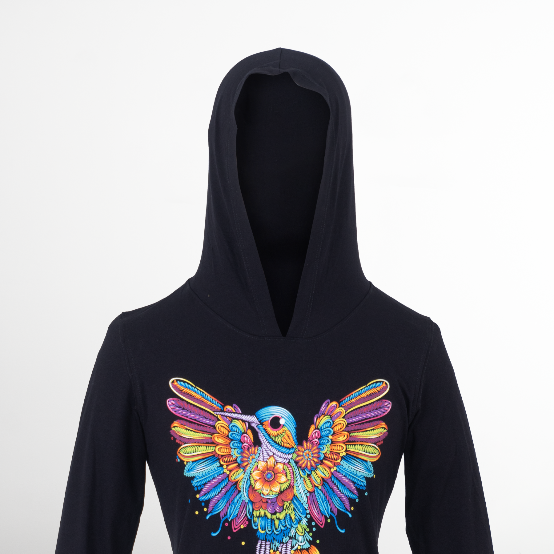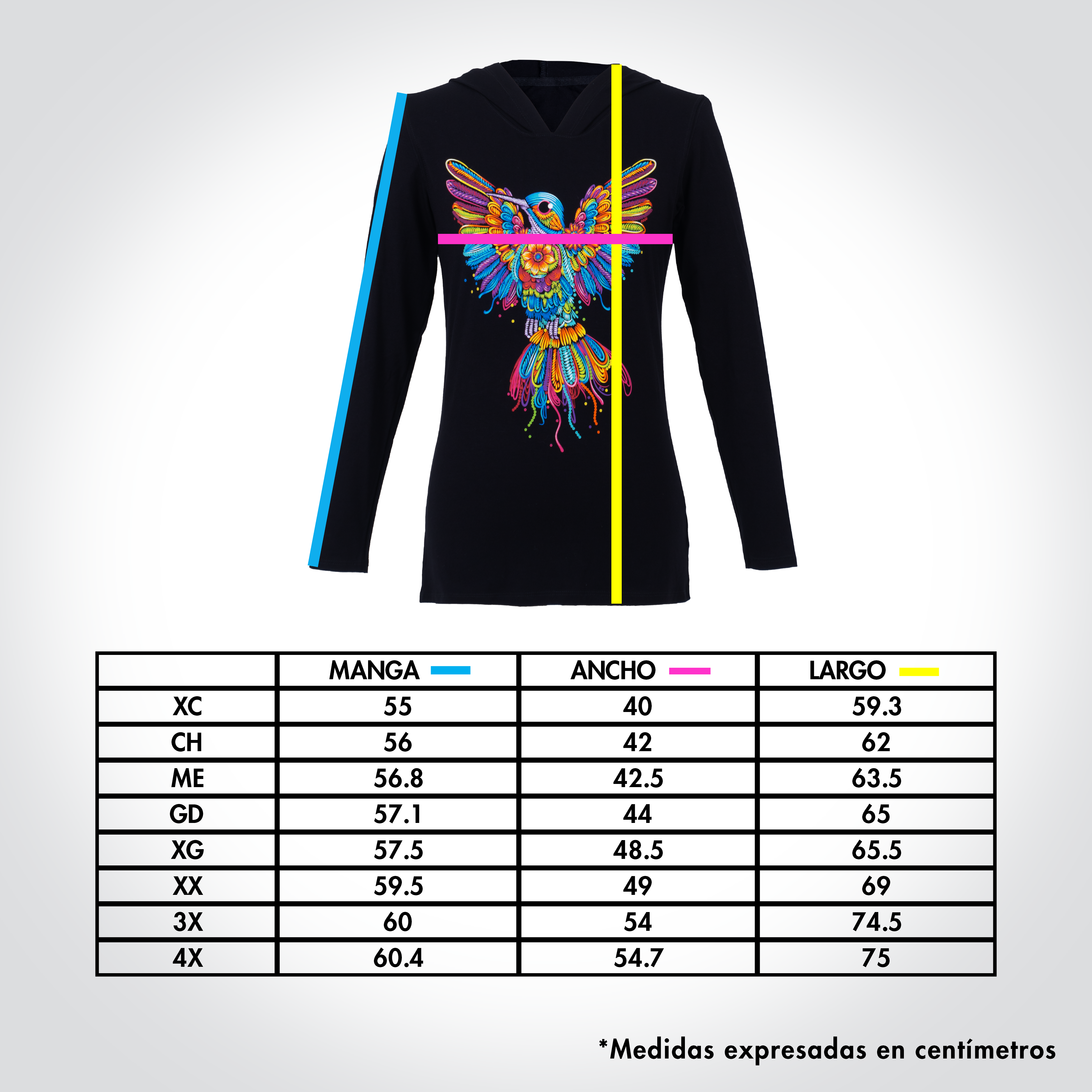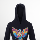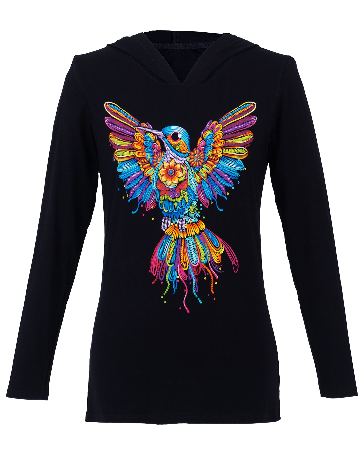Blusón de dama con capucha y manga larga. El diseño que acompaña este nuevo modelaje, representa al tradicional colibrí en el estilo de bordado artesanal que nos identifica. Sus colores vibrantes y las alas abiertas del ave hacen de esta prenda una pieza divertida y acogedora.