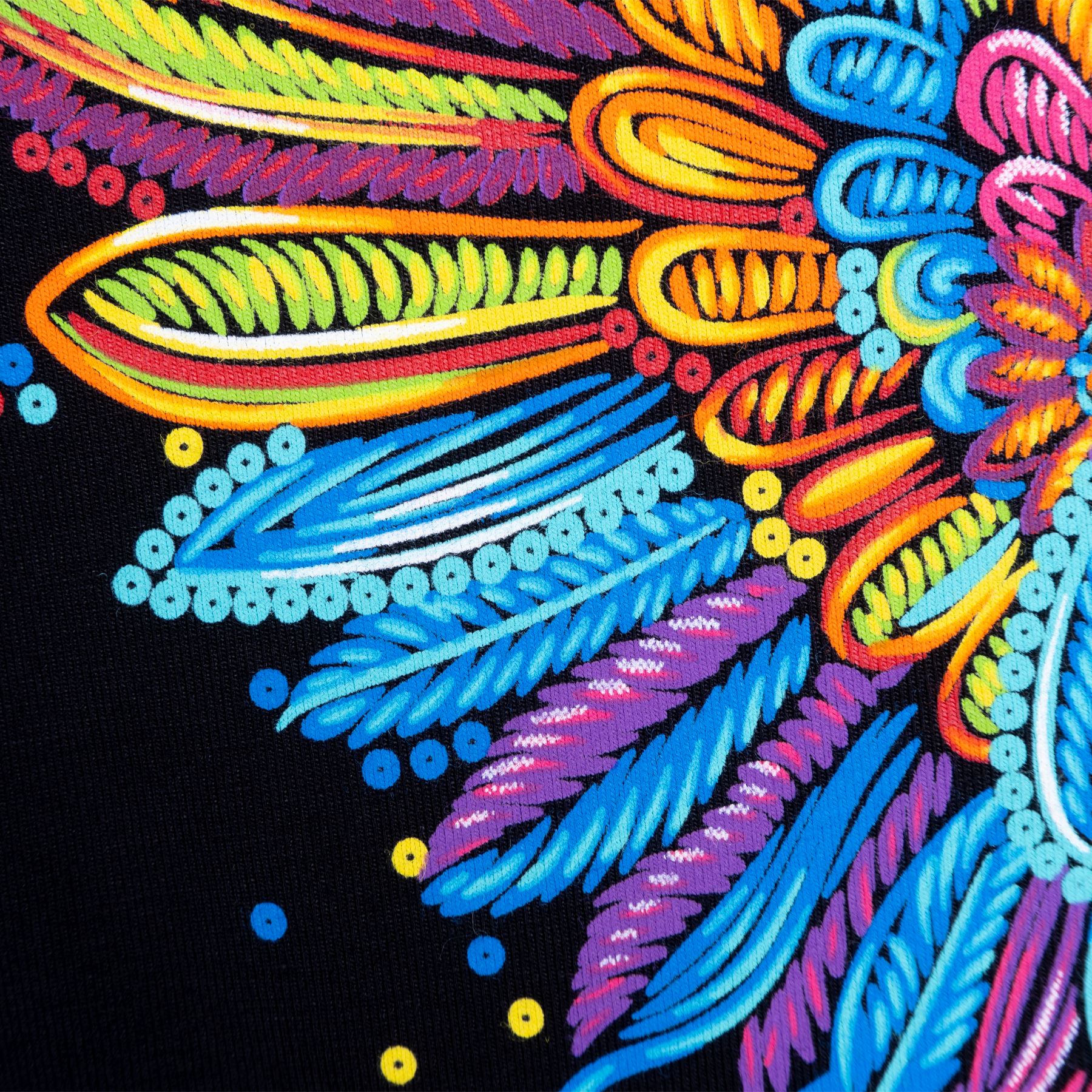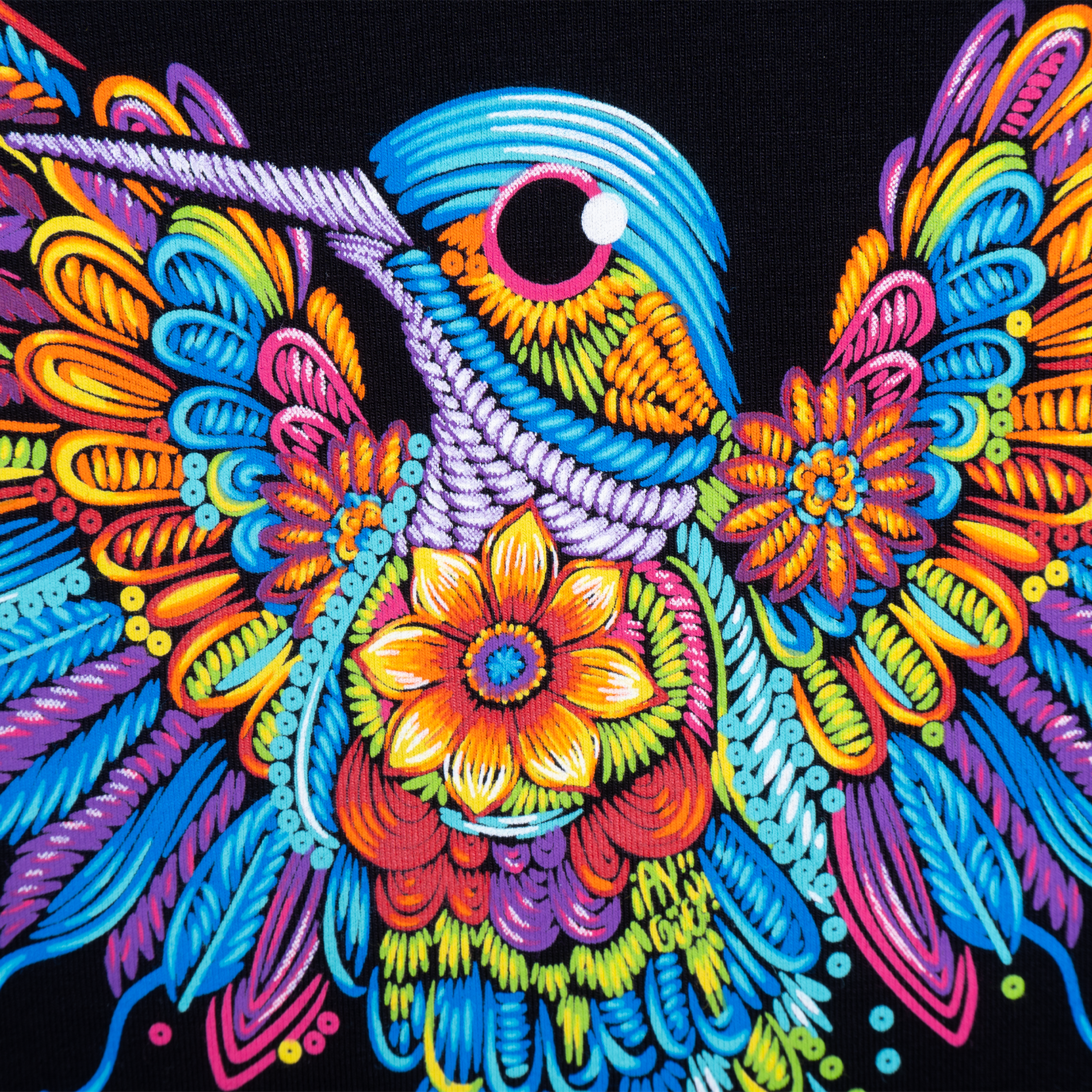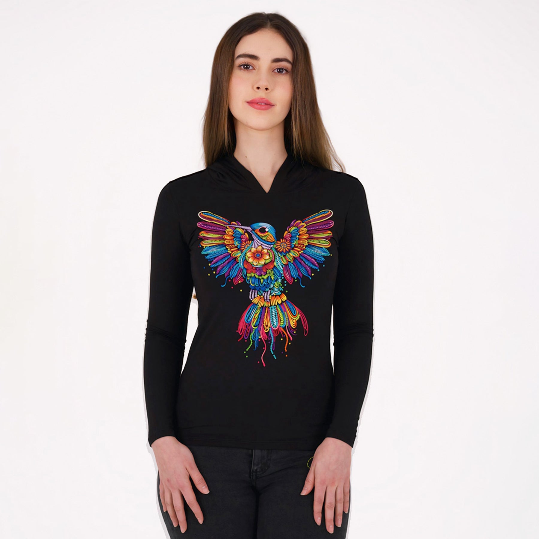 Blusón de dama con capucha y manga larga. El diseño que acompaña este nuevo modelaje, representa al tradicional colibrí en el estilo de bordado artesanal que nos identifica. Sus colores vibrantes y las alas abiertas del ave hacen de esta prenda una pieza divertida y acogedora.