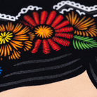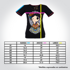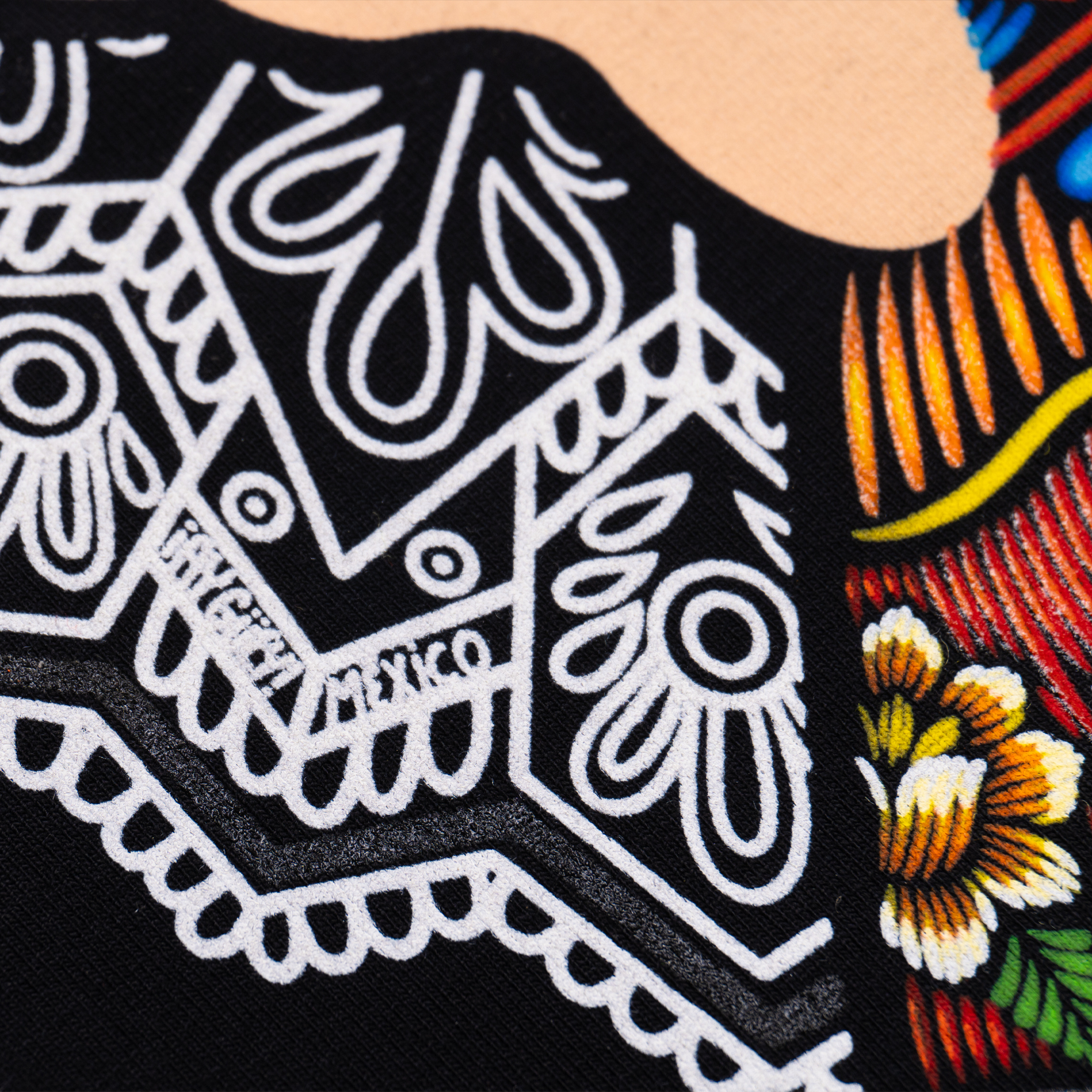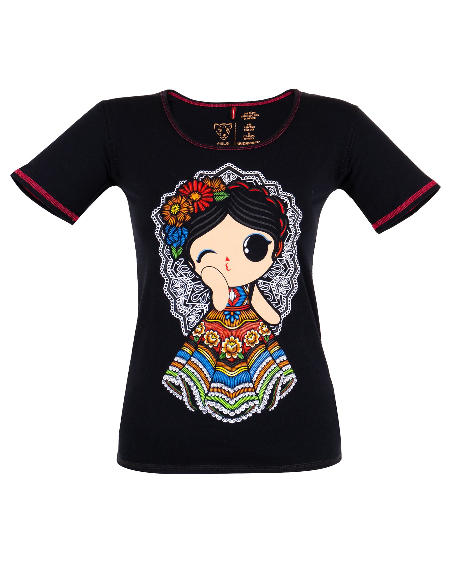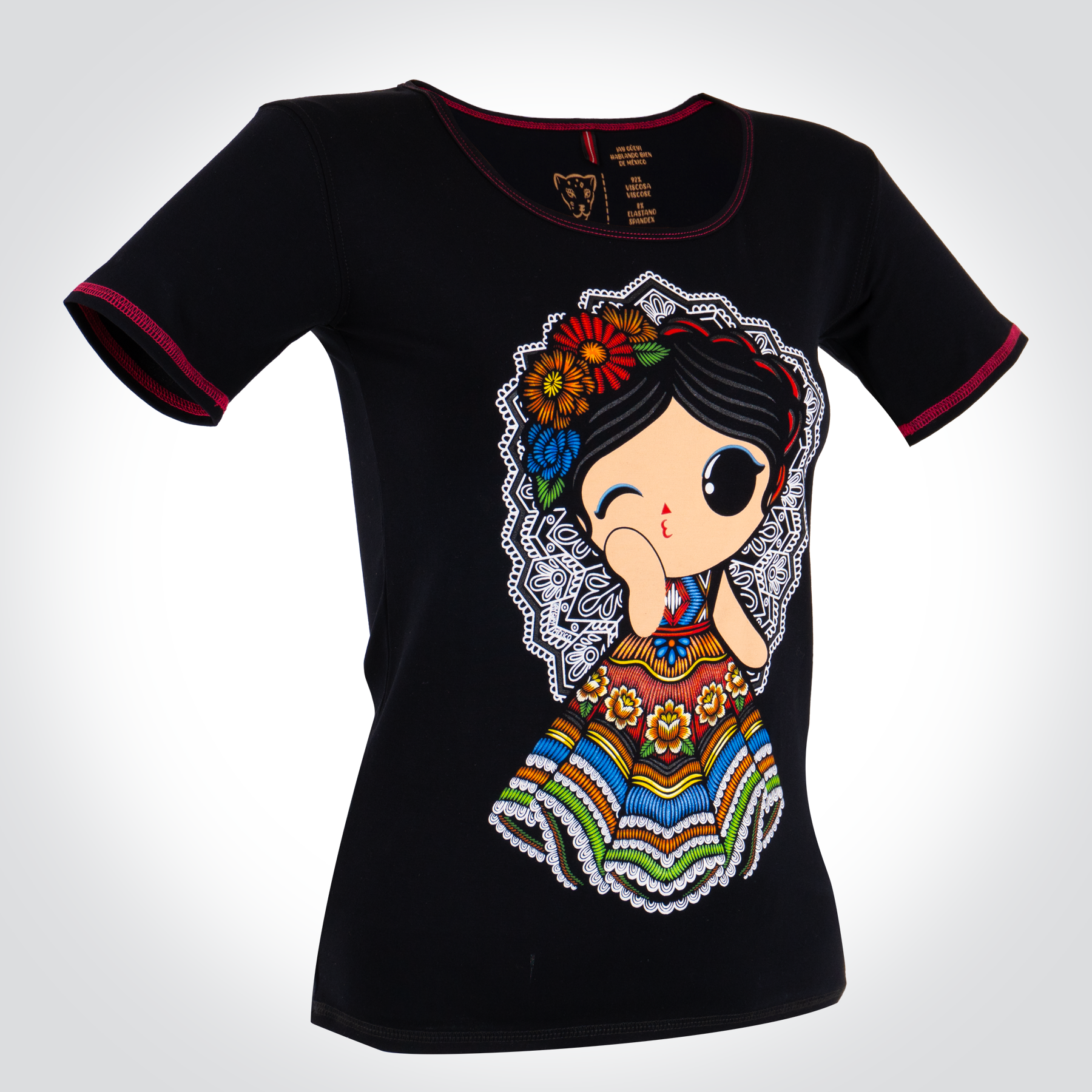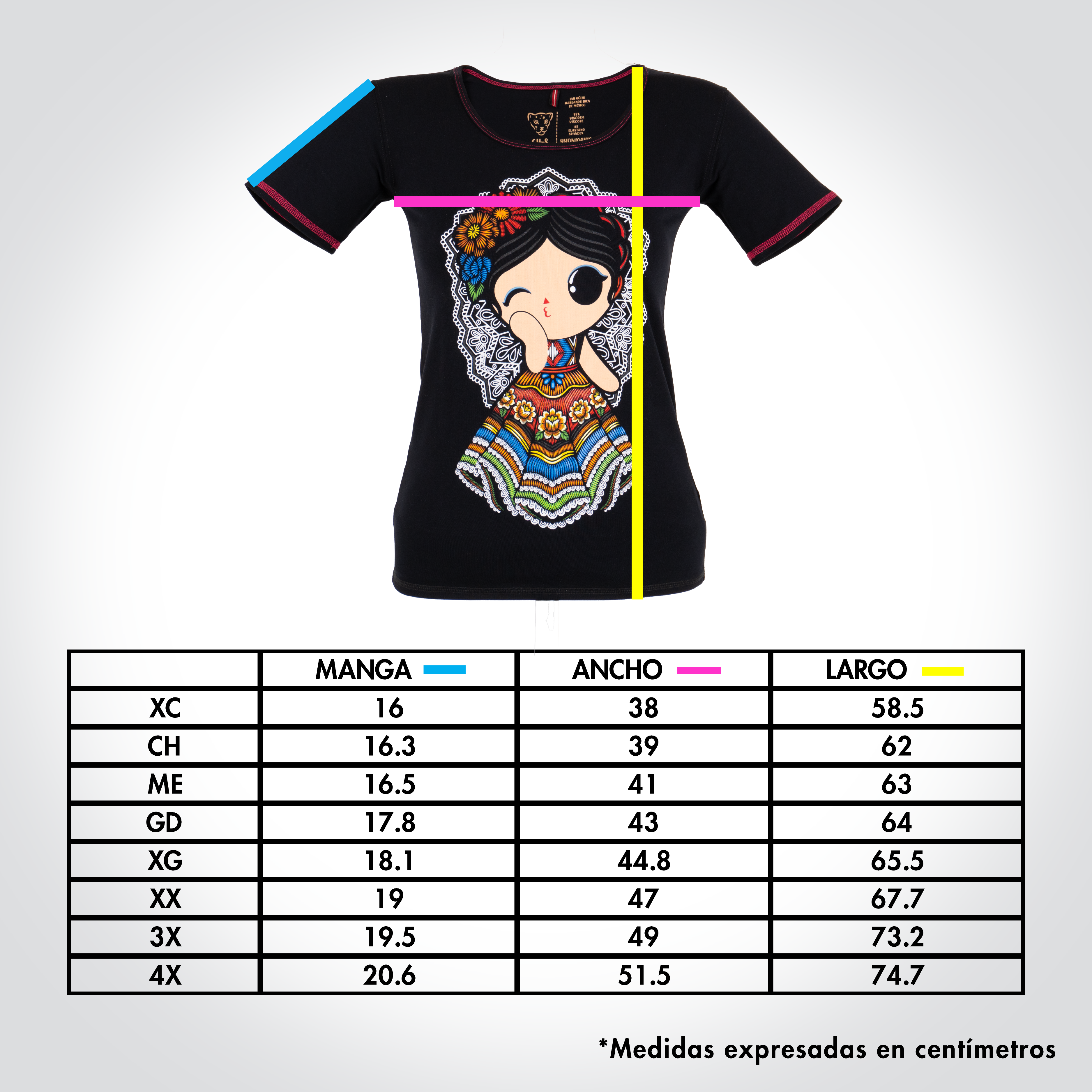 El estampado frontal tiene a Petrita, personaje inspirado en la muñecas mazahuas, esta ocasión Petrita porta el traje típico de tehuana originario de Oaxaca.