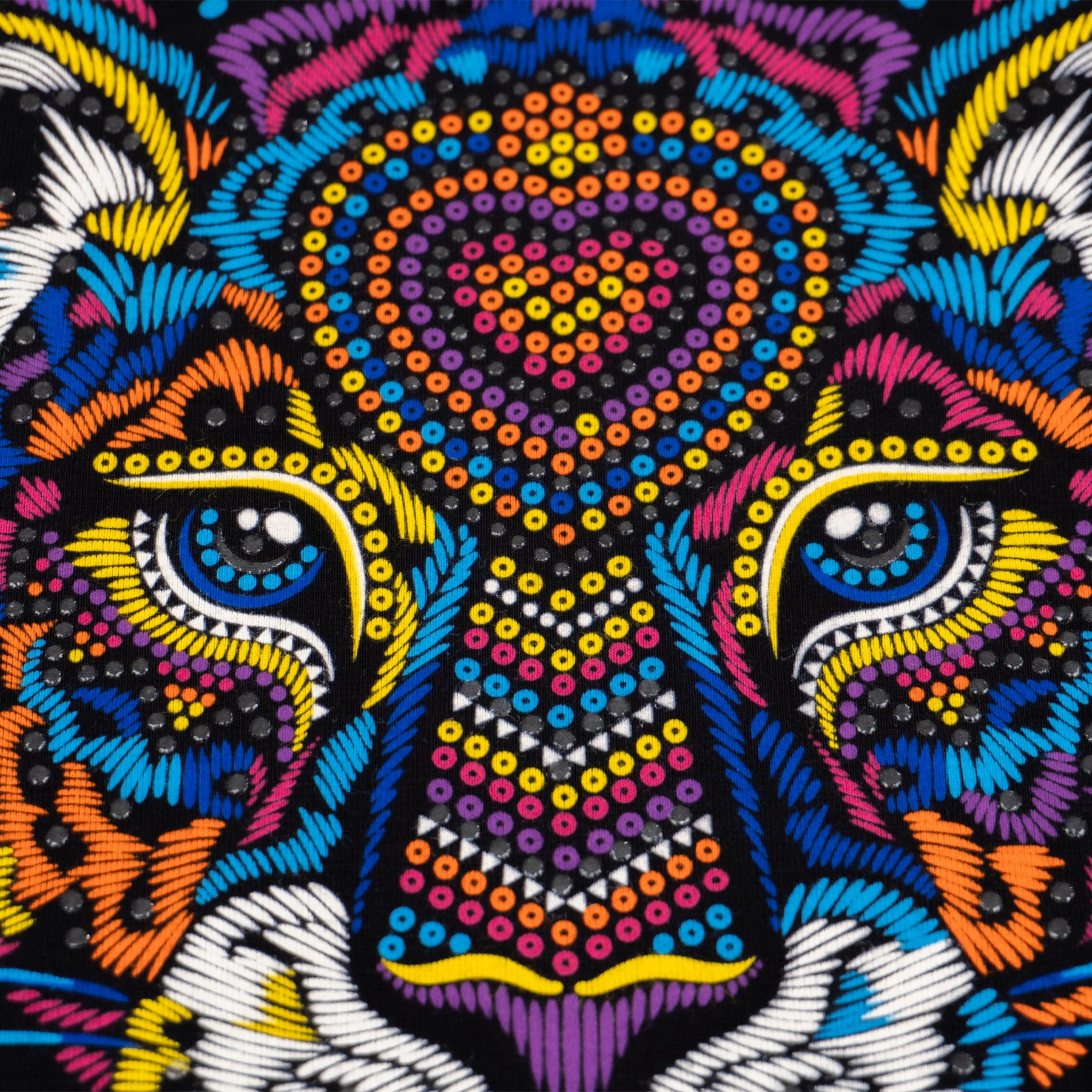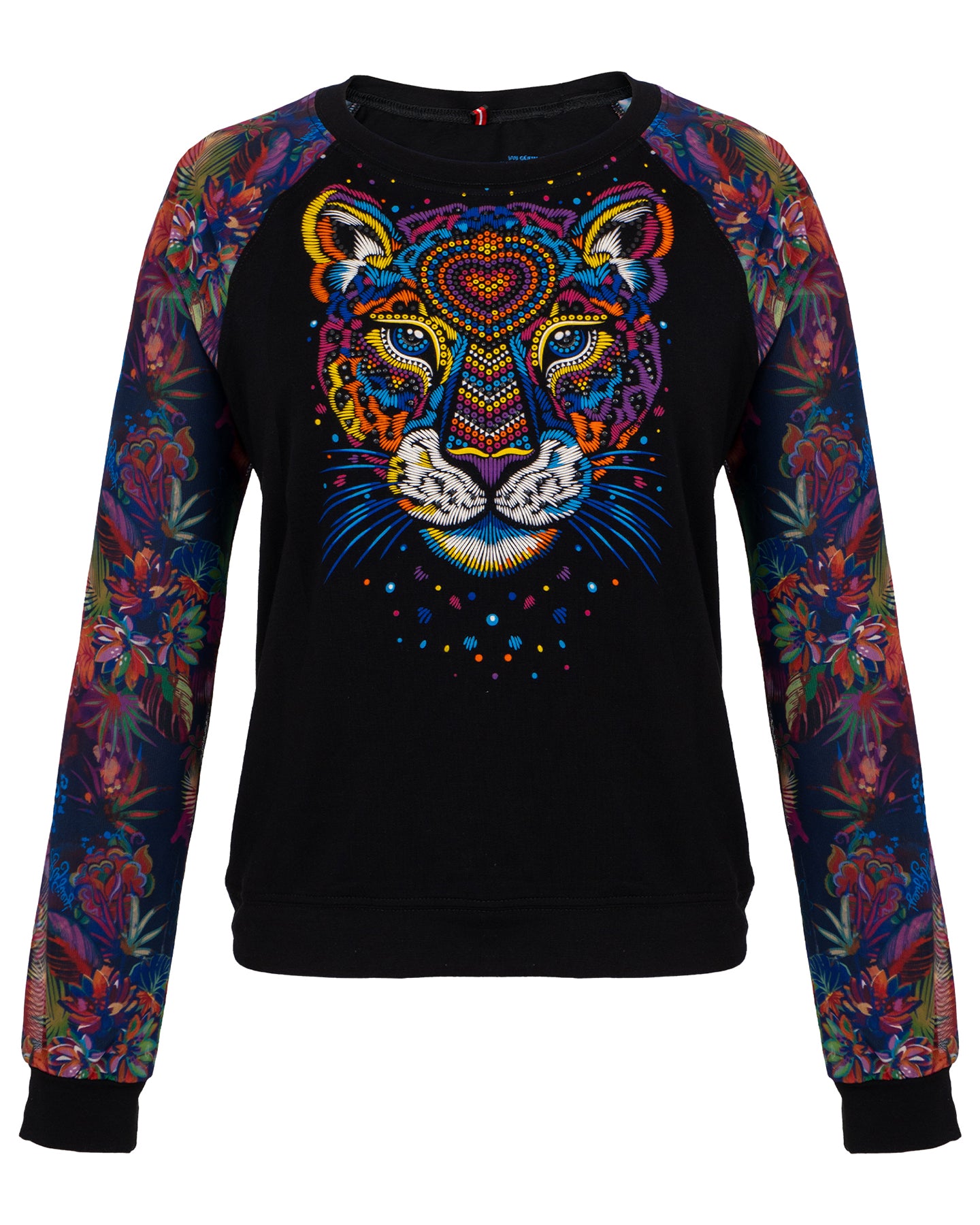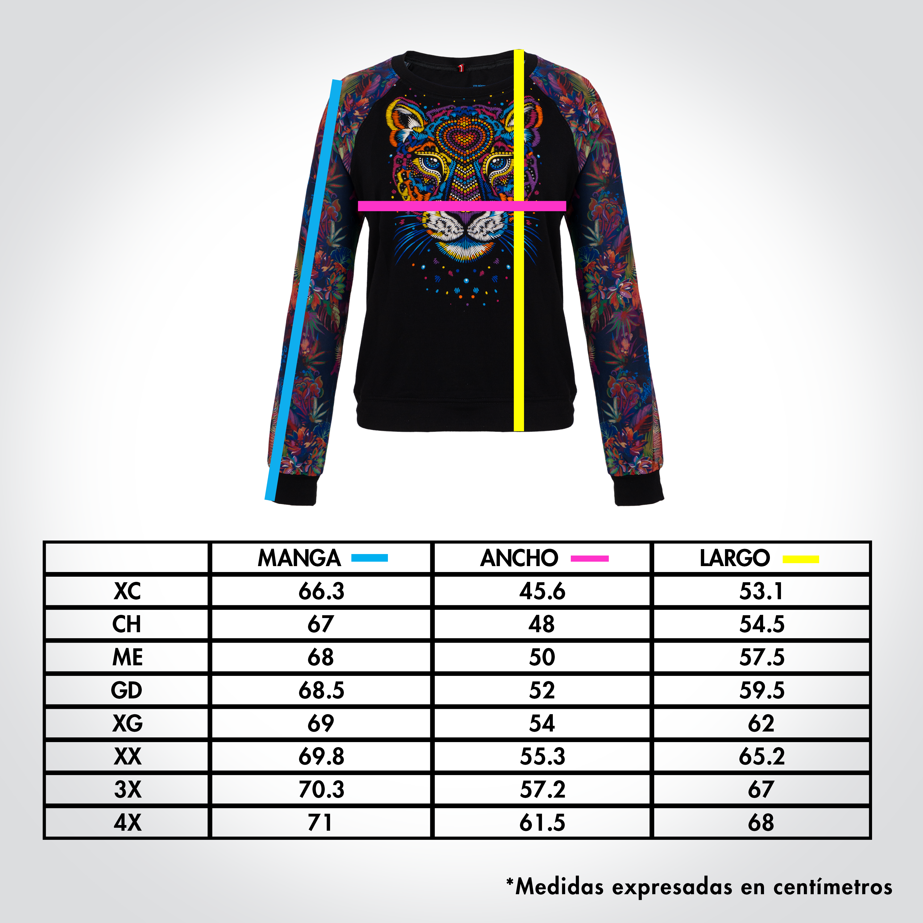 El jaguar, un felino majestuoso y enigmático, es uno de los tesoros más preciados de la biodiversidad mexicana. Este magnífico felino no solo es el protagonista de la selva, sino también un guardián de nuestras tradiciones y leyendas. En la frente del jaguar esta un corazón con estilo huichol lleno de la vibrante energía. La tela de las mangas esta inspirada en la selva y sus elegantes colores.