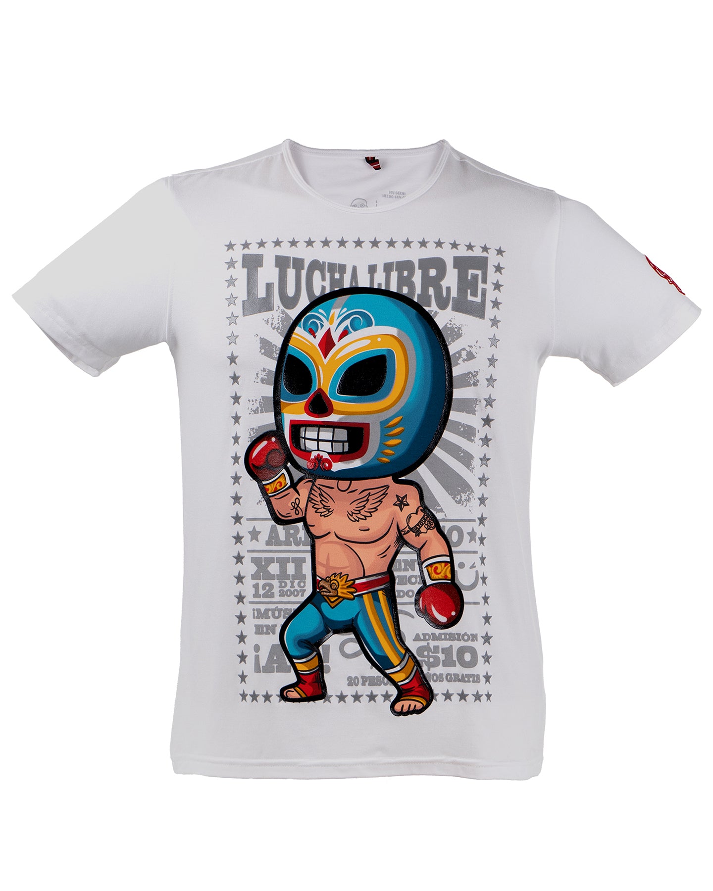 Playera de caballero en color blanco y corte básico. Este diseño presenta a un luchador mexicano en una pose dramática, listo para enfrentarse a su oponente, pero también presenta a un divertido personaje que se complementa en pareja de papá e hijo. Cuenta con aplicación de gel para texturizar y lo adornan detalles clásicos de la lucha libre mexicana.