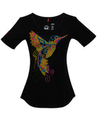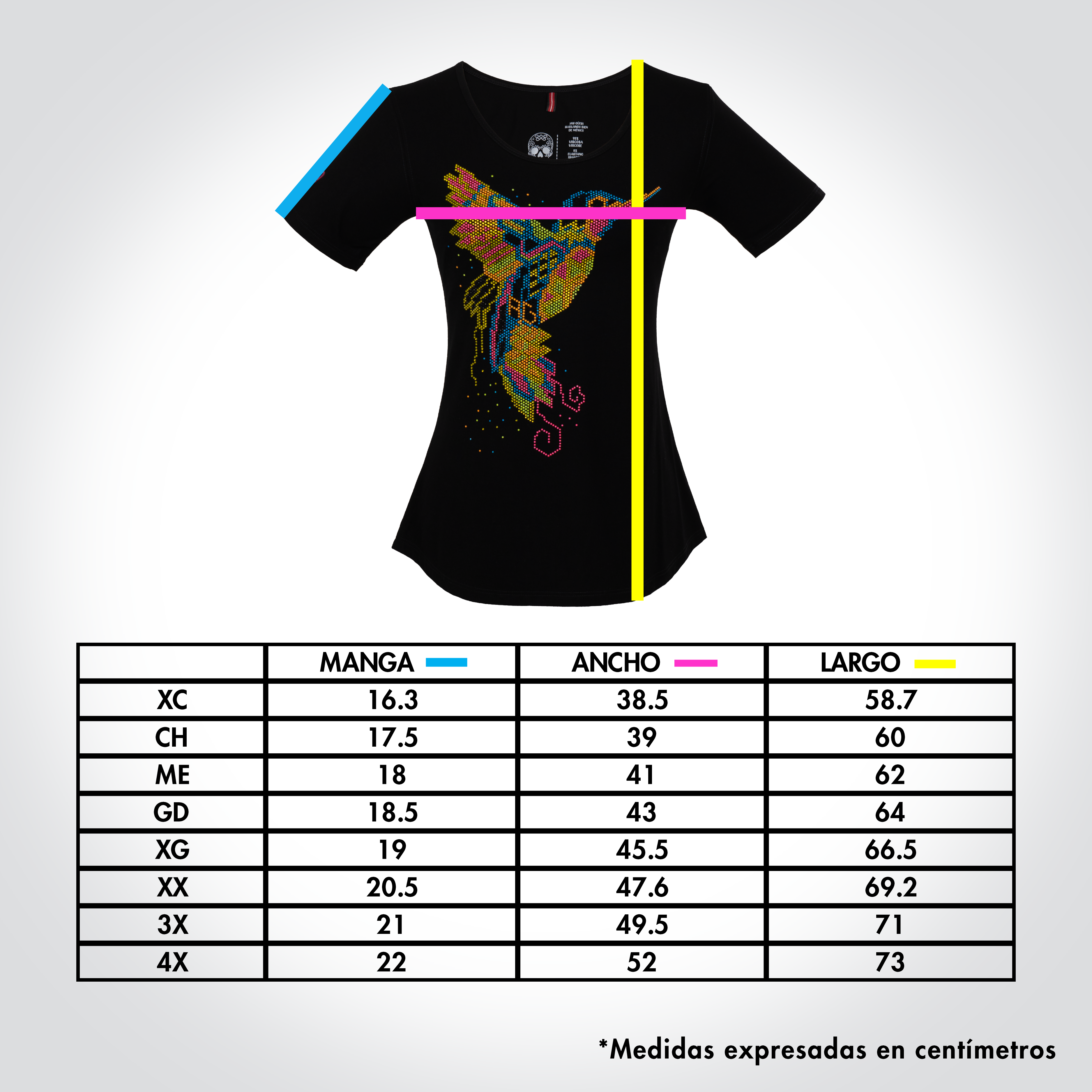 Pajaritos a volar, playera de dama  que es una explosión de color y alegría. Su base curva acentúa tu figura, mientras que las mangas cortas te brindan comodidad y frescura. Cada centímetro del estampado está adornado con pedrería de neón que brilla intensamente, convirtiéndote en el centro de atención.