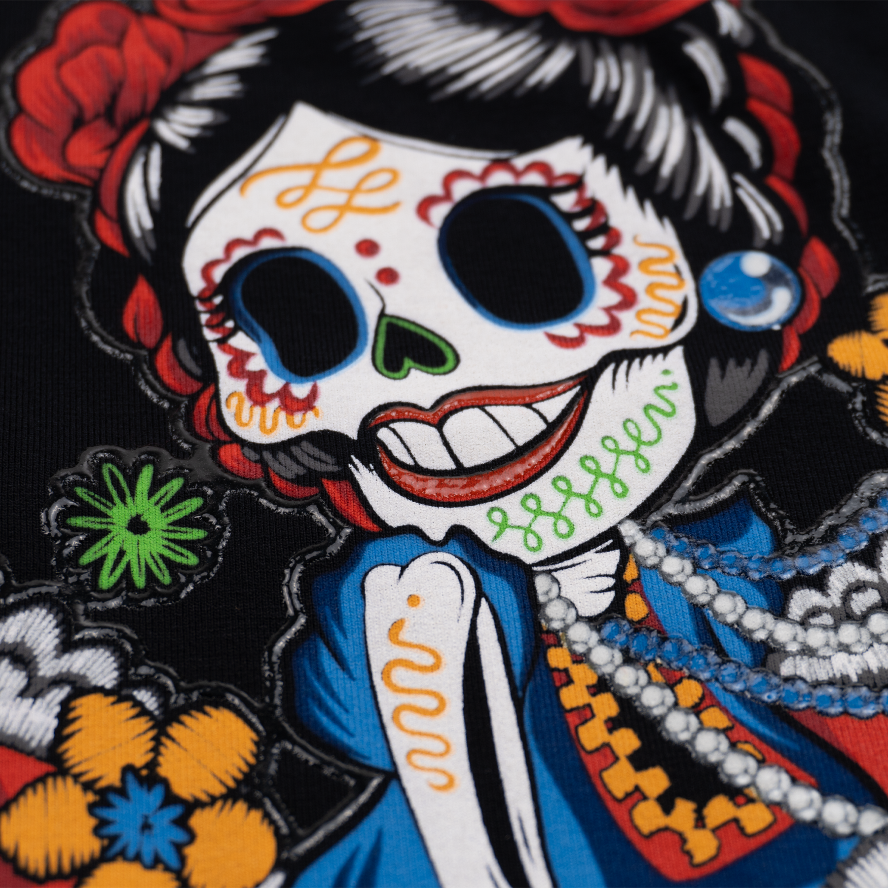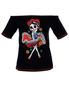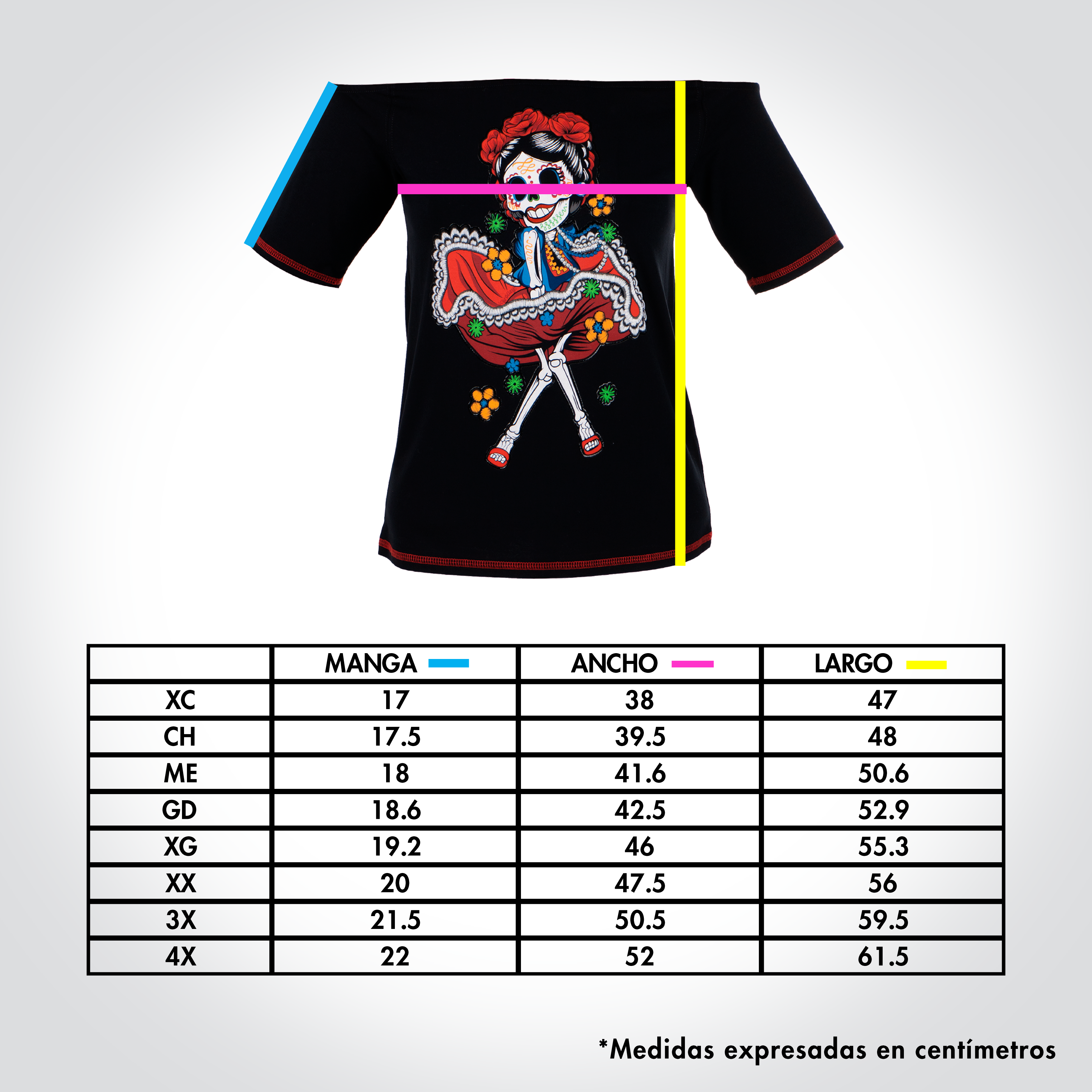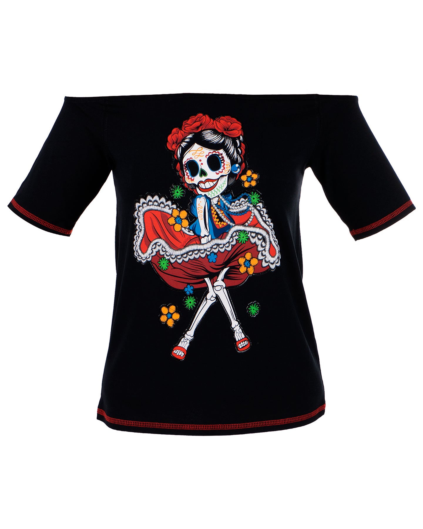 Esta playera de hombros descubiertos para dama, cuenta con un estampado inspirado en la icónica pose de Marilyn Monroe, pero con un toque de la cultura mexicana: una catrina. Añade estilo y originalidad a tu outfit con la playera Patzcuaro.
