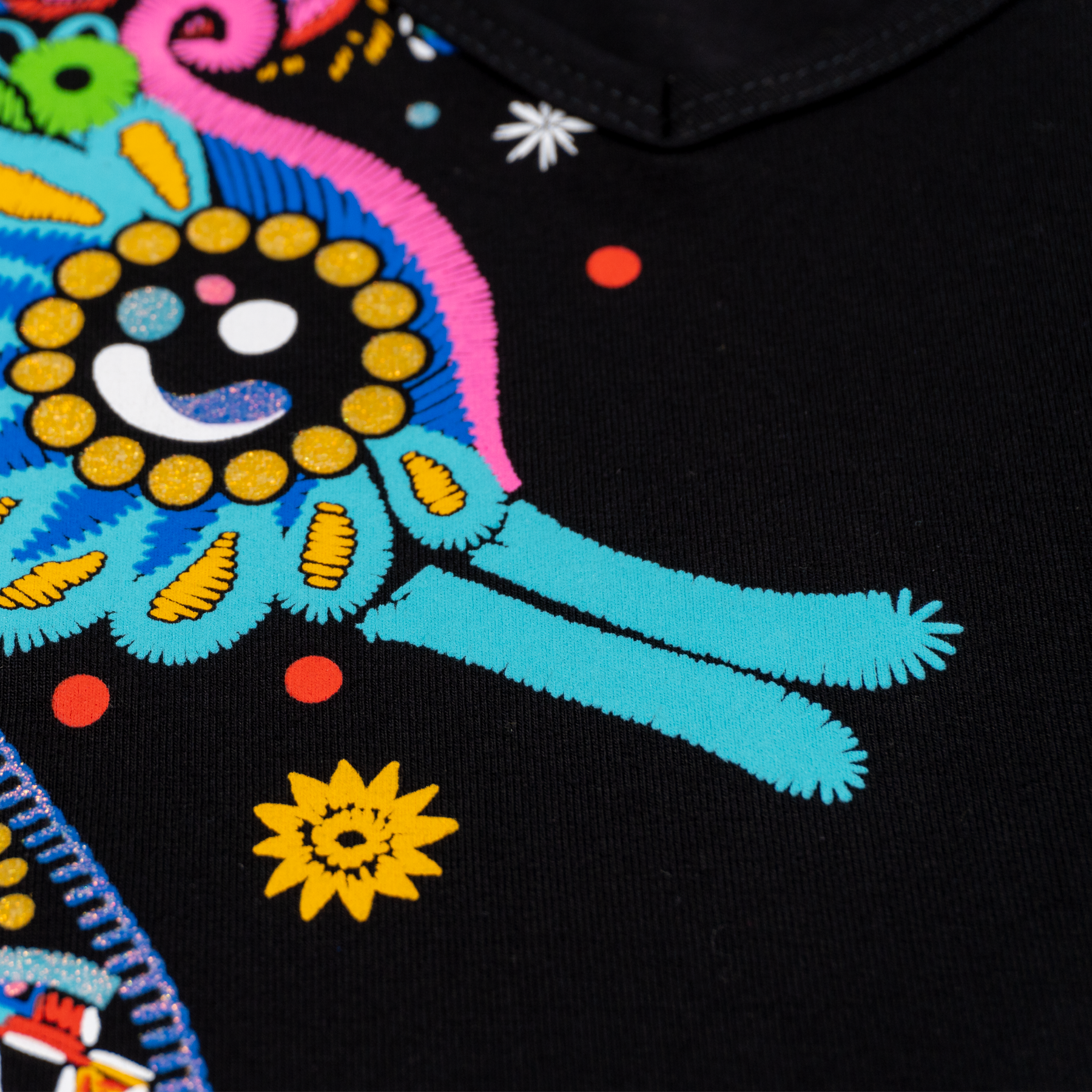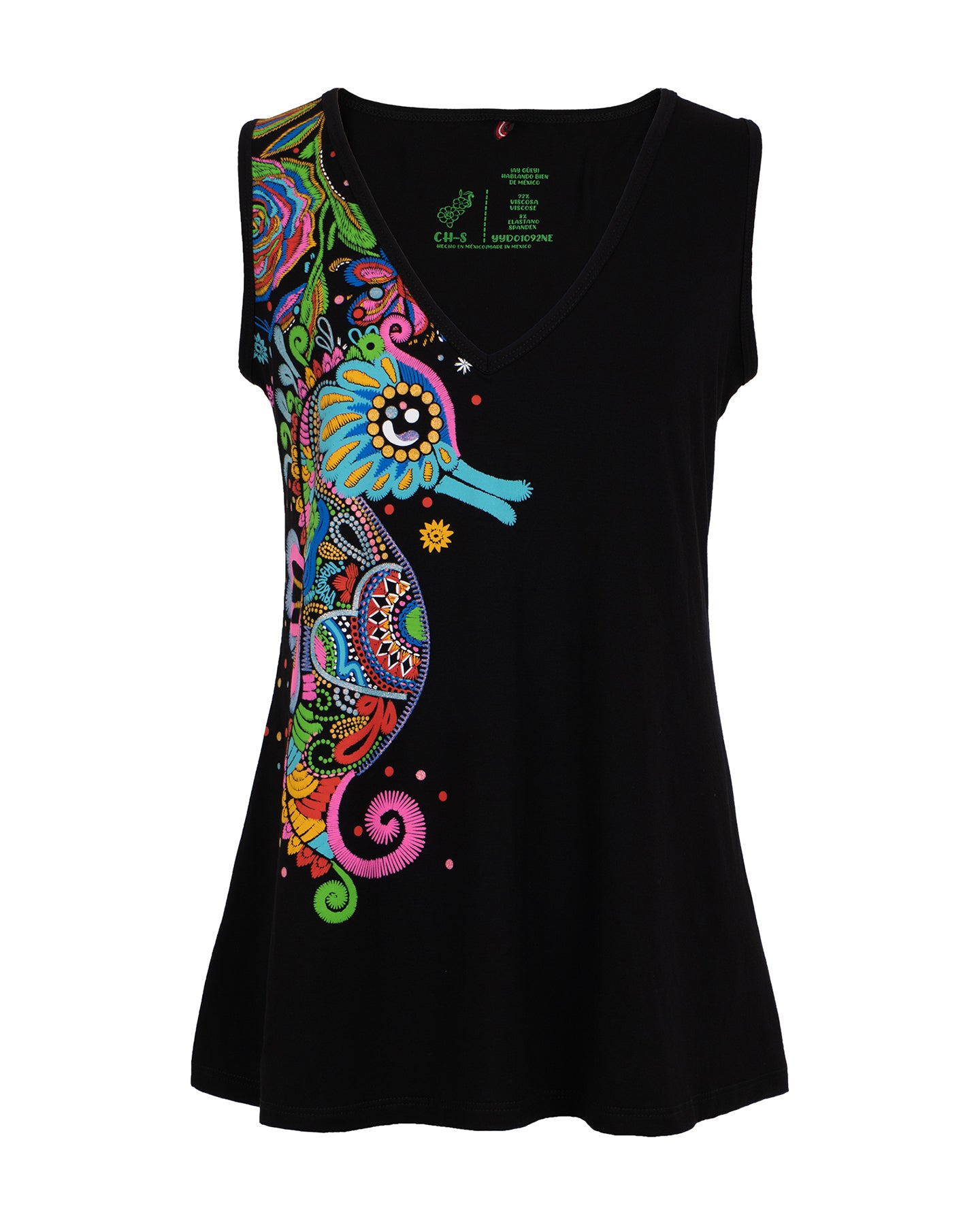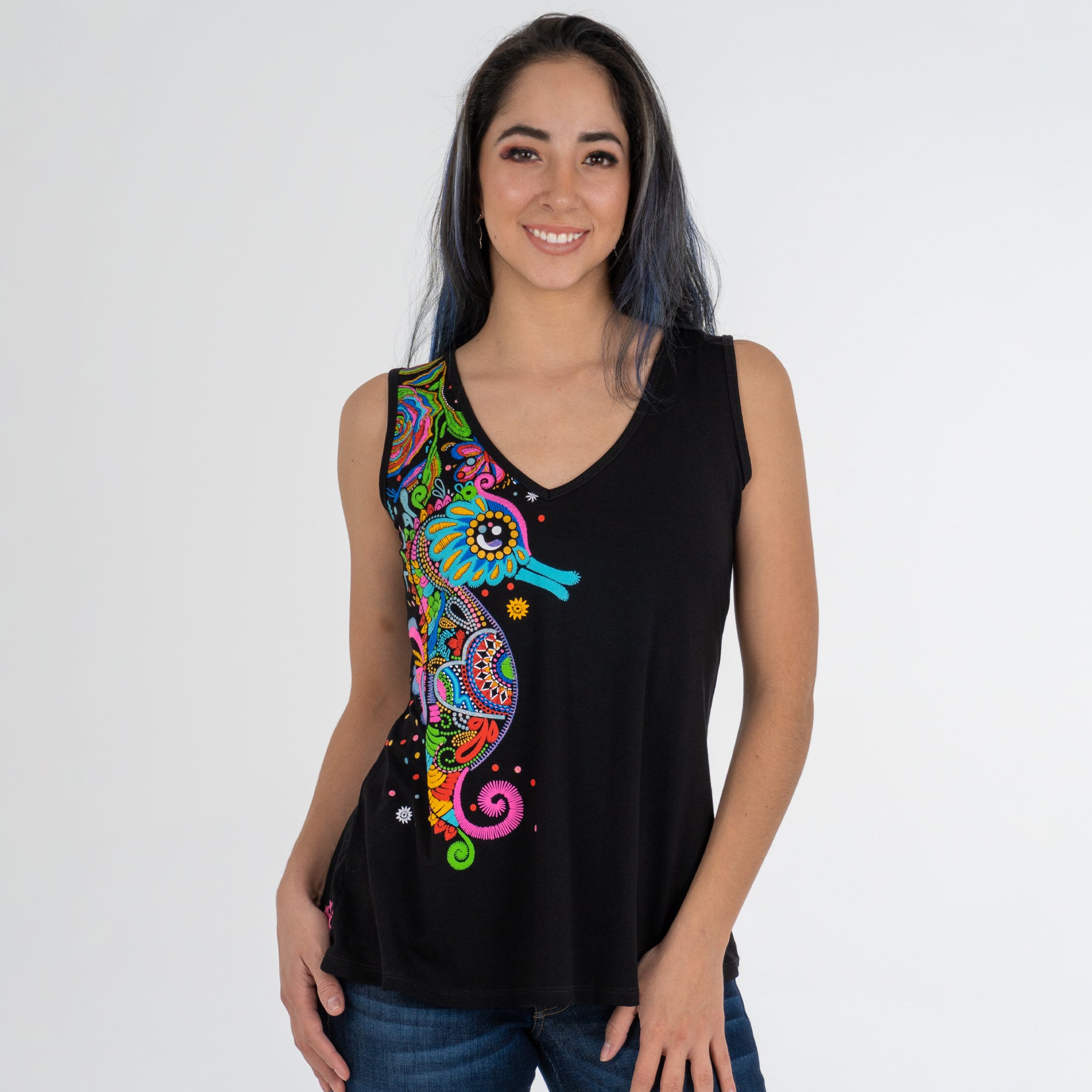 Blusón sin mangas, corte amplio, en color negro. Este fresco diseño de caballito de mar como bordado en colores vibrantes. Su cuerpo esta lleno de detalles intrincados con puntadas que crean patrones hermosos. Con una famosa escultura de un caballito de mar llamada El Caballito que adorna el malecón de Puerto Vallarta, y de ahí su nombre.