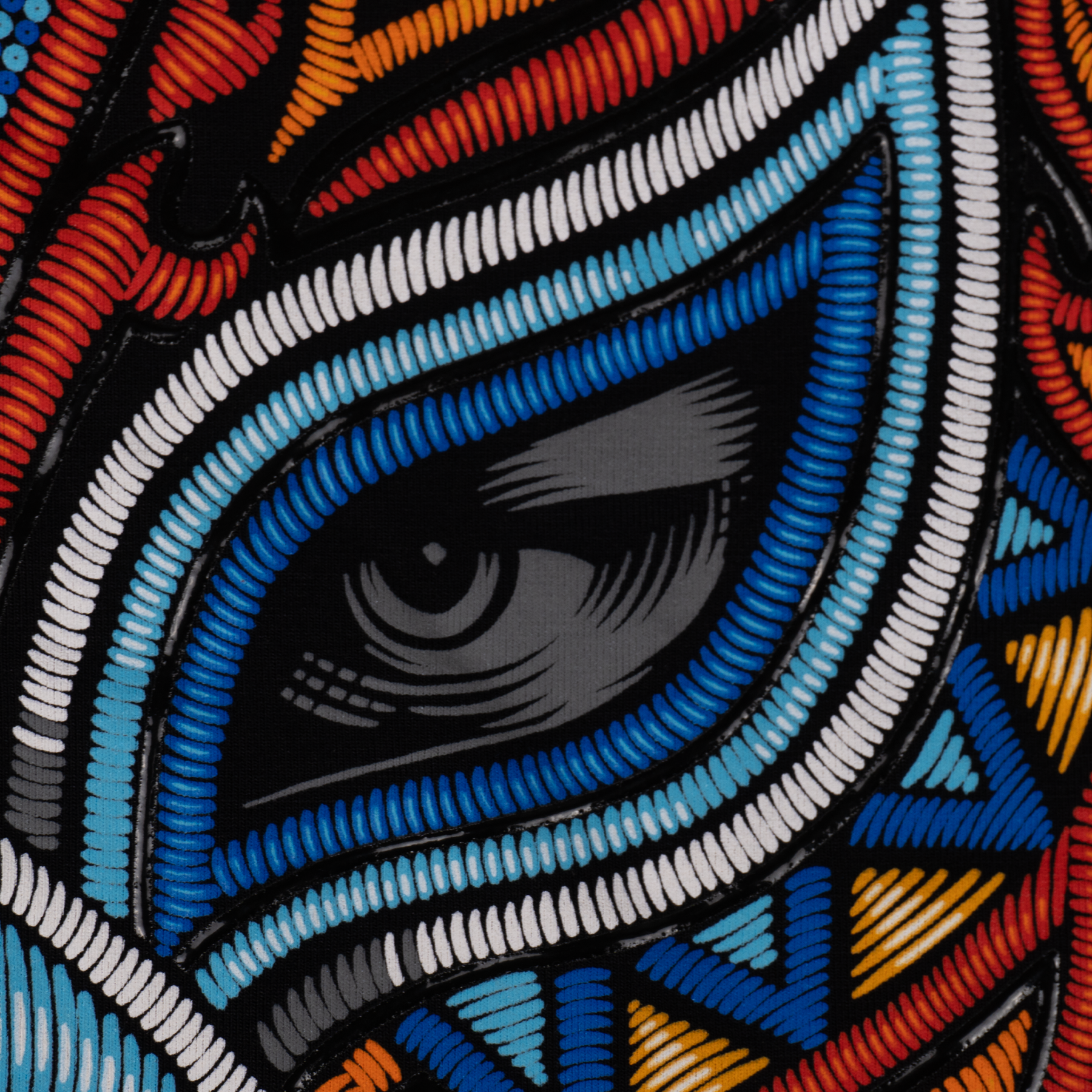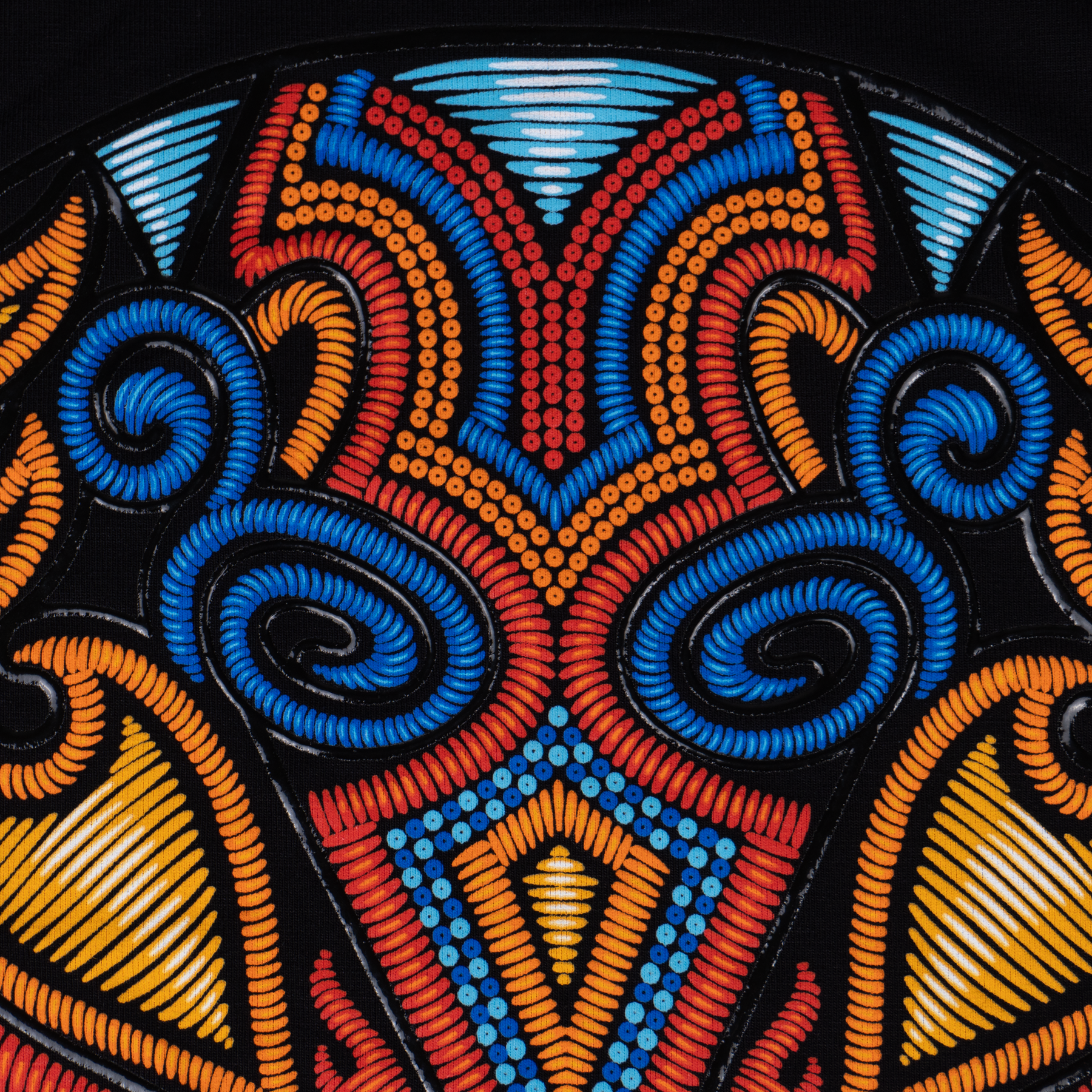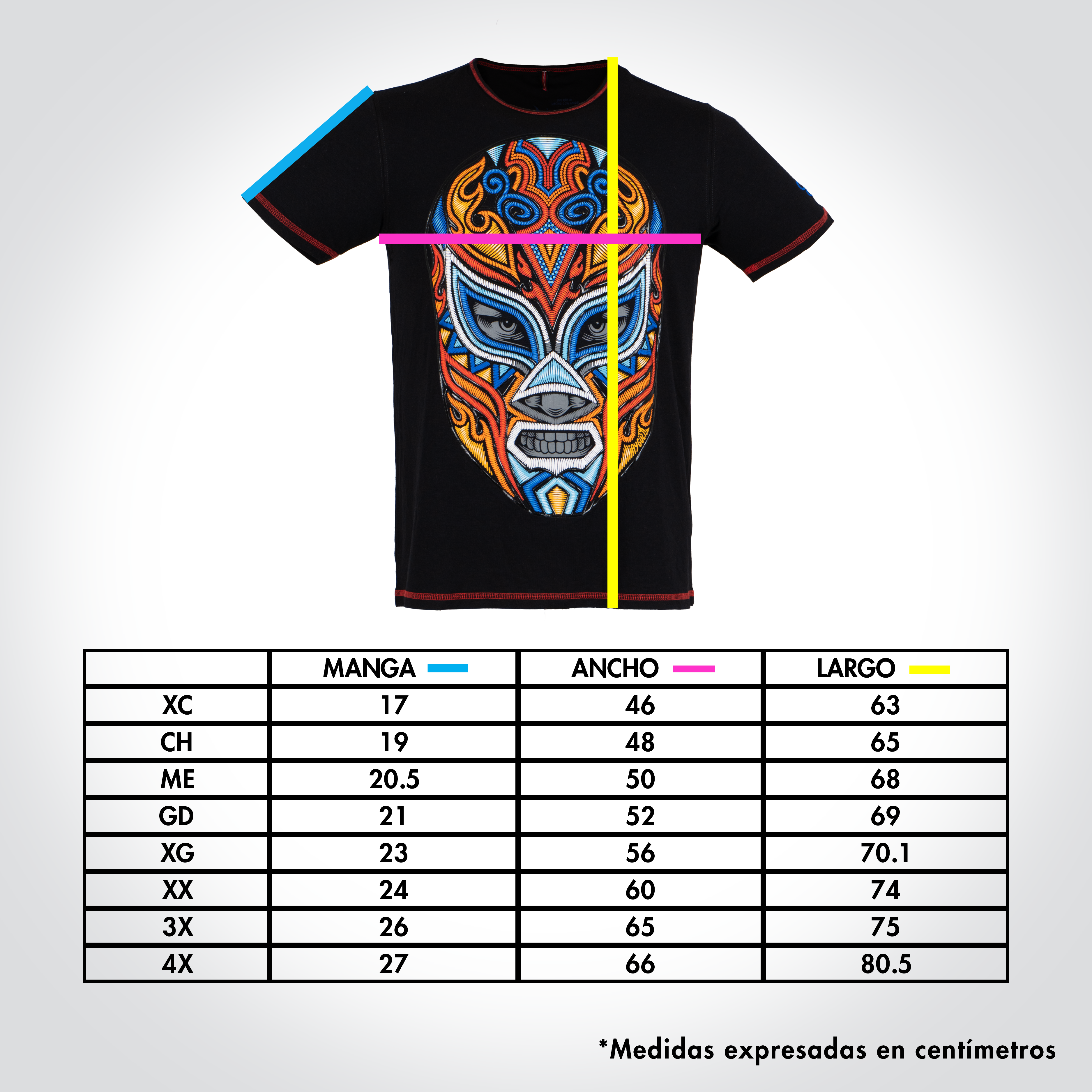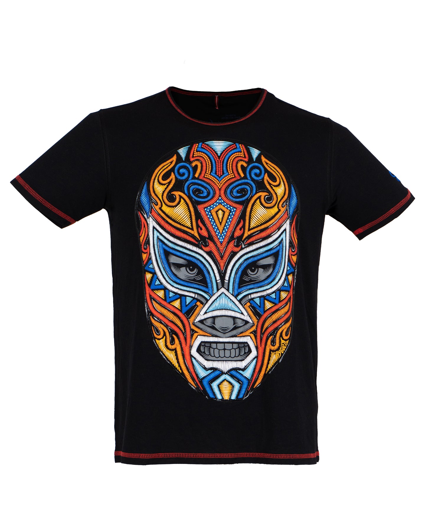 Playera de caballero en color negro inspirada en el pancracio mexicano combinado con los bordados mexicanos, ya que ambos representan la riqueza visual de México con sus colores y formas.