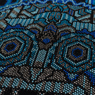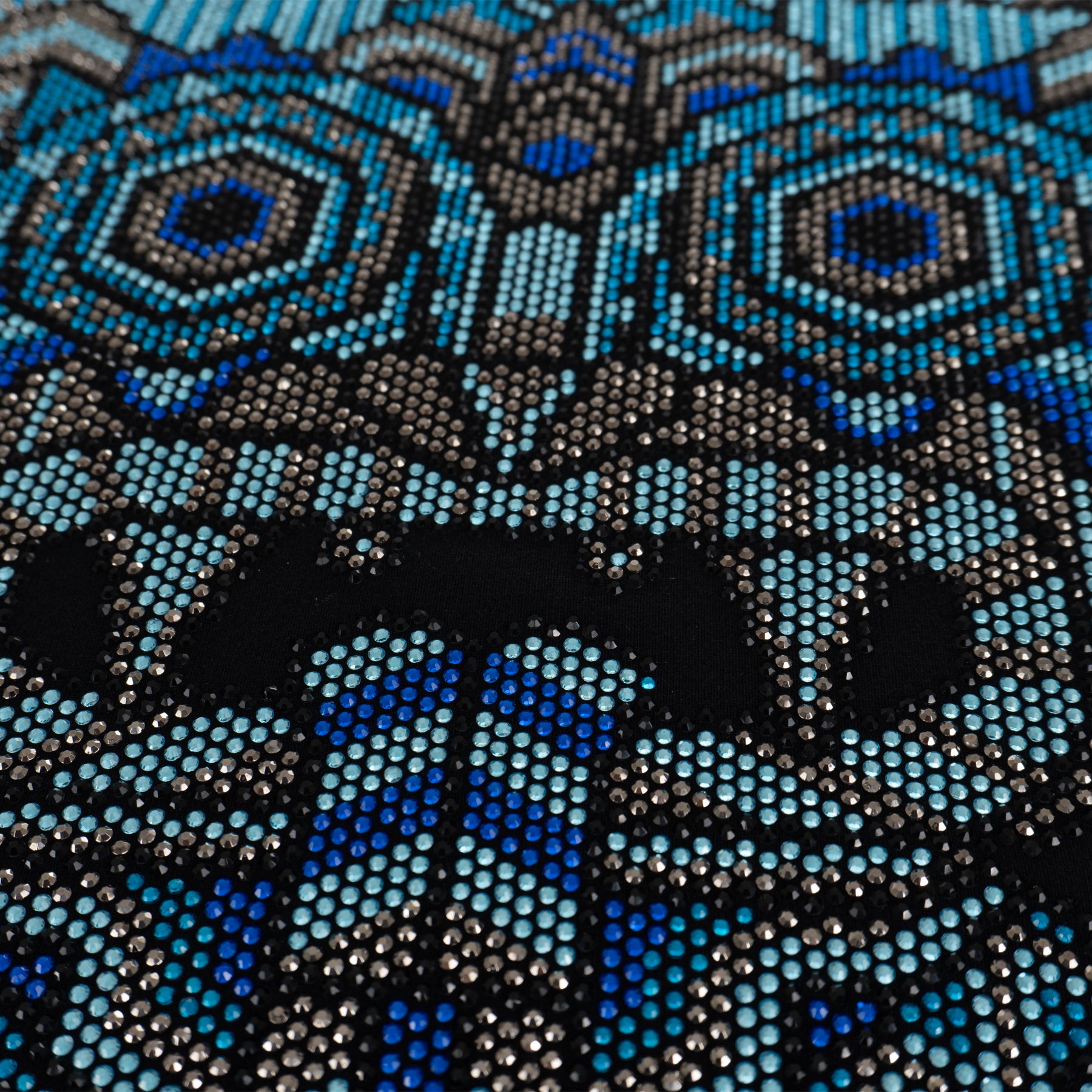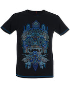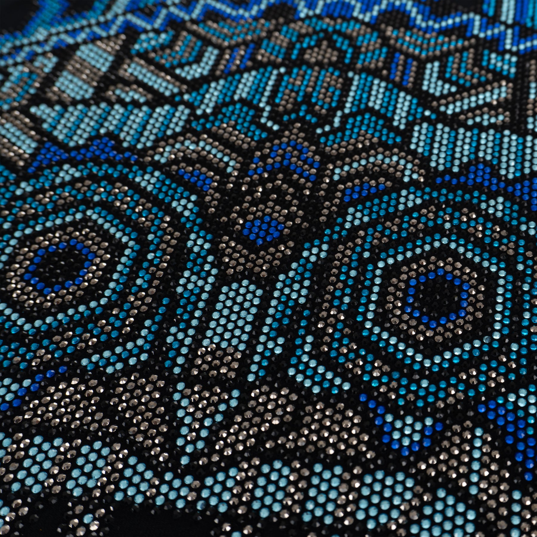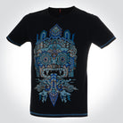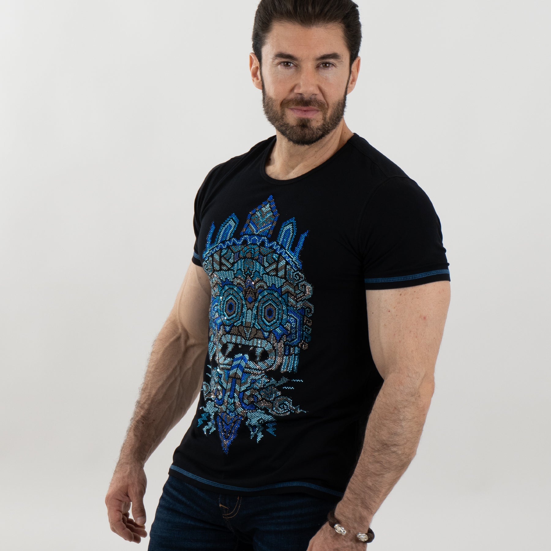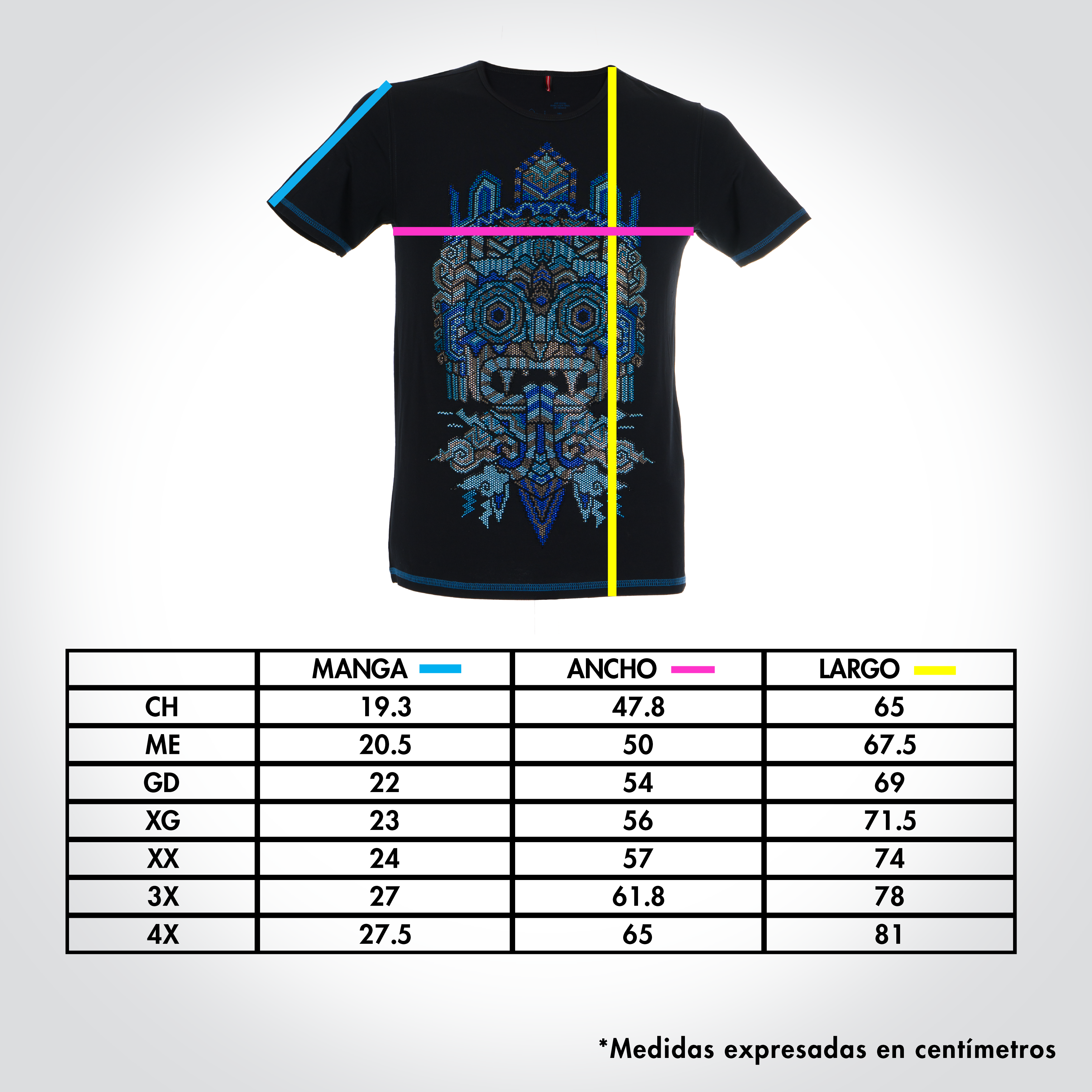 Playera de caballero de manga corta y cuello redondo, adornada con la icónica imagen de Tláloc, dios responsable de la lluvia y por ello esta hecho en piedras con diferentes tonos de azul evocando a su grandeza entre nubes y rayos.