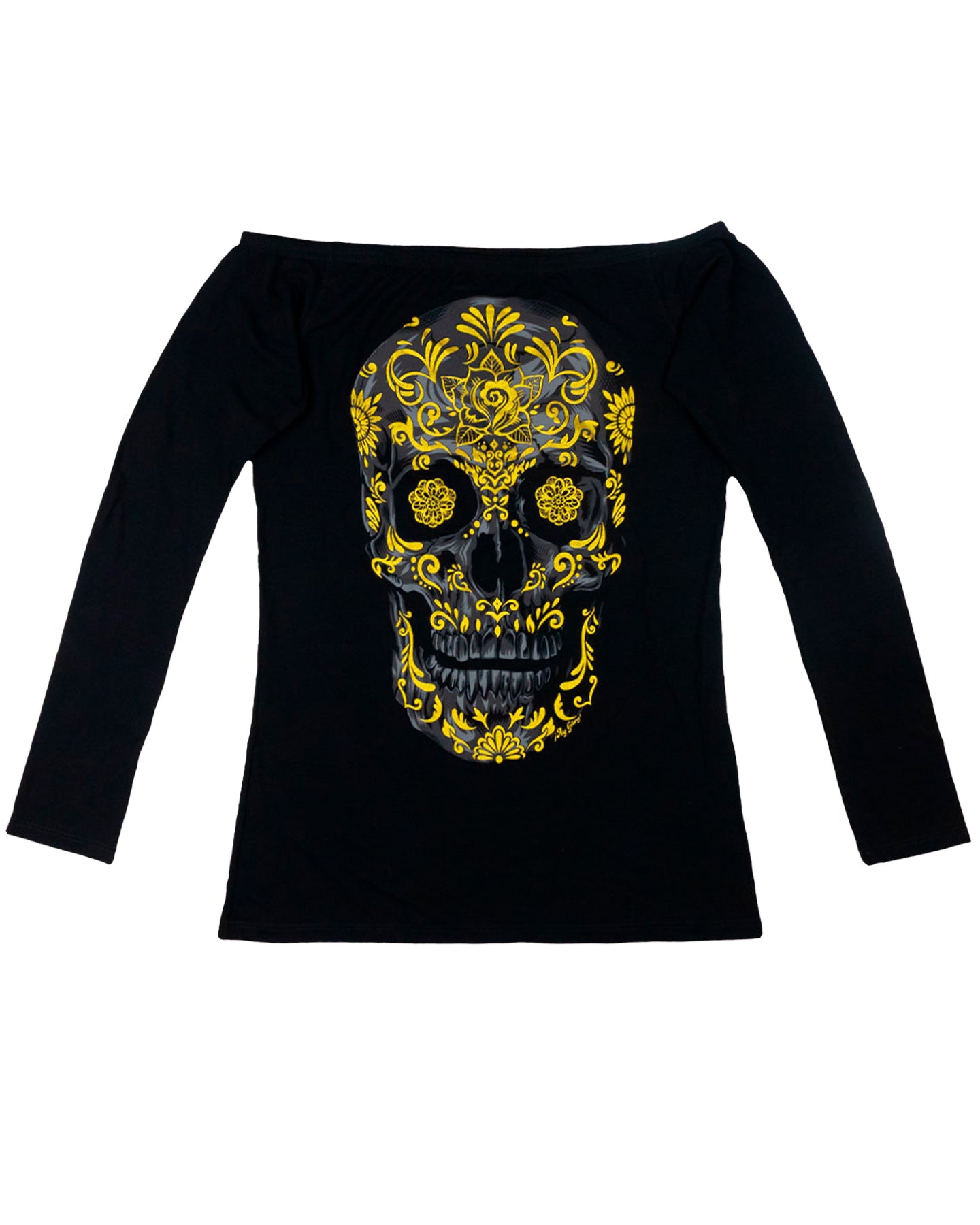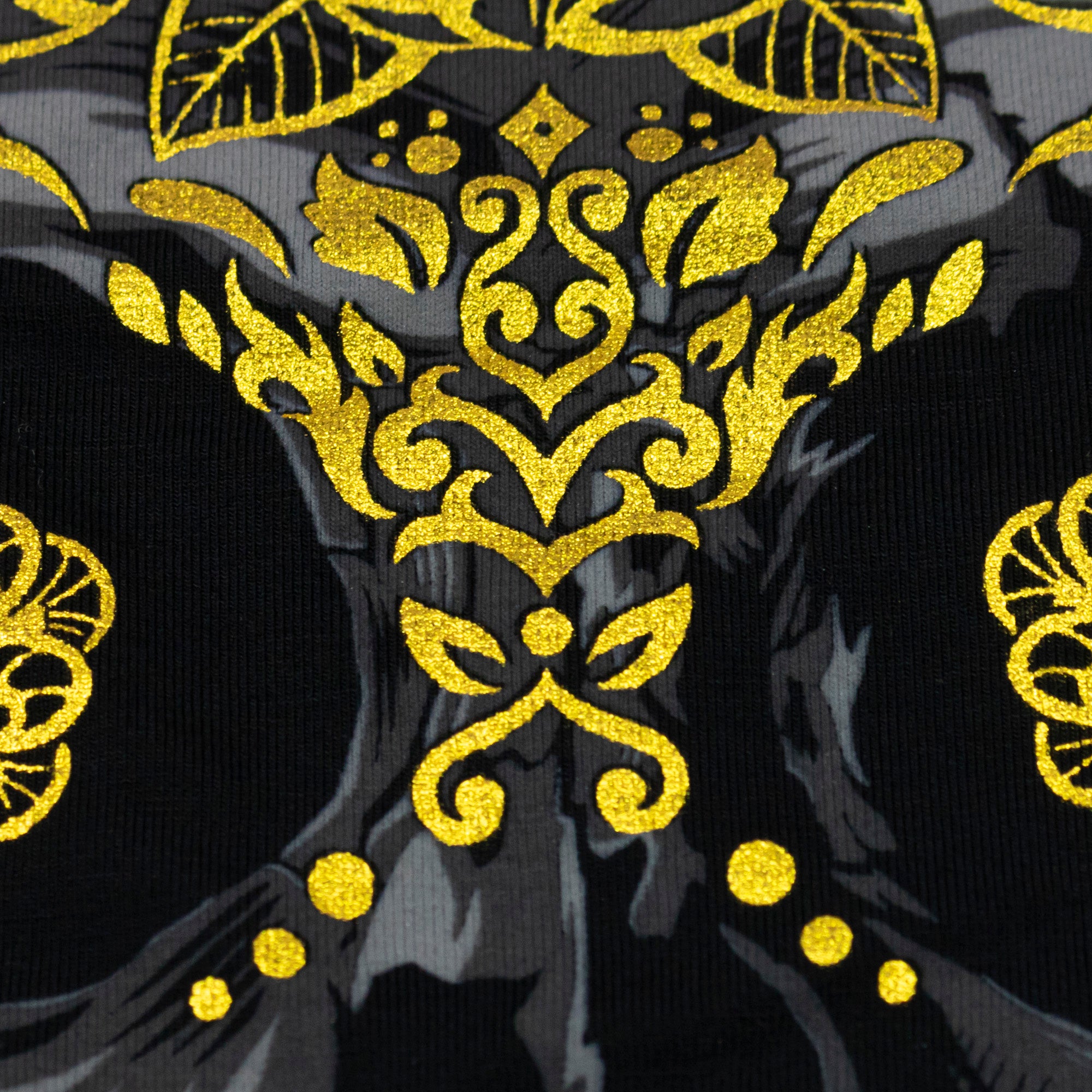 Diseño inspirado en las calaveras de azúcar y en la artesania adornada con hoja de oro.