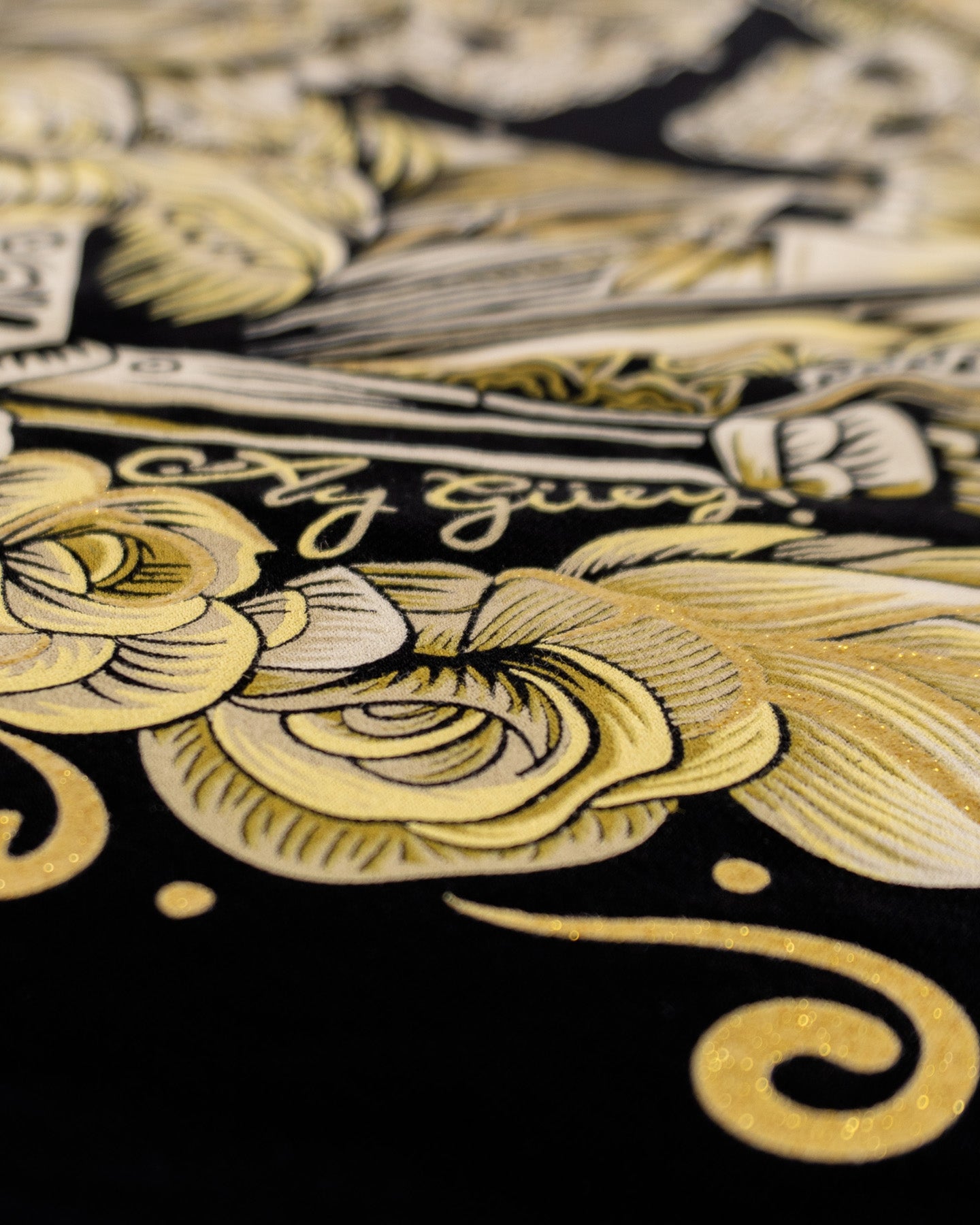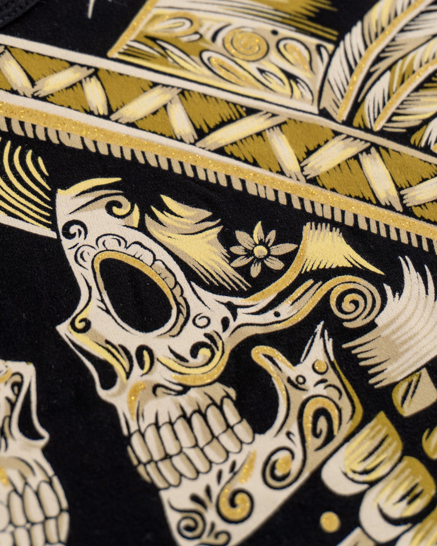 Este diseño captura a dos calaveras elegantemente vestidas que se miran con una tierna complicidad. Sumérgete en un estilo ornamental detallado, donde los tonos dorados intensos evocan el brillo sagrado de las ofrendas y la inigualable riqueza del arte mexicano.