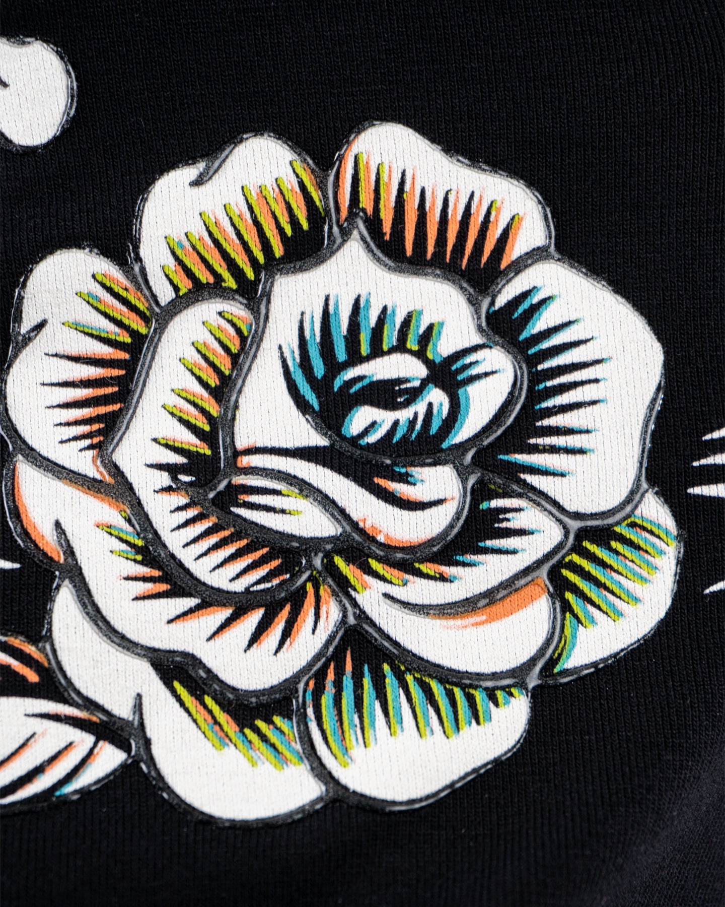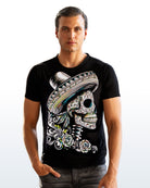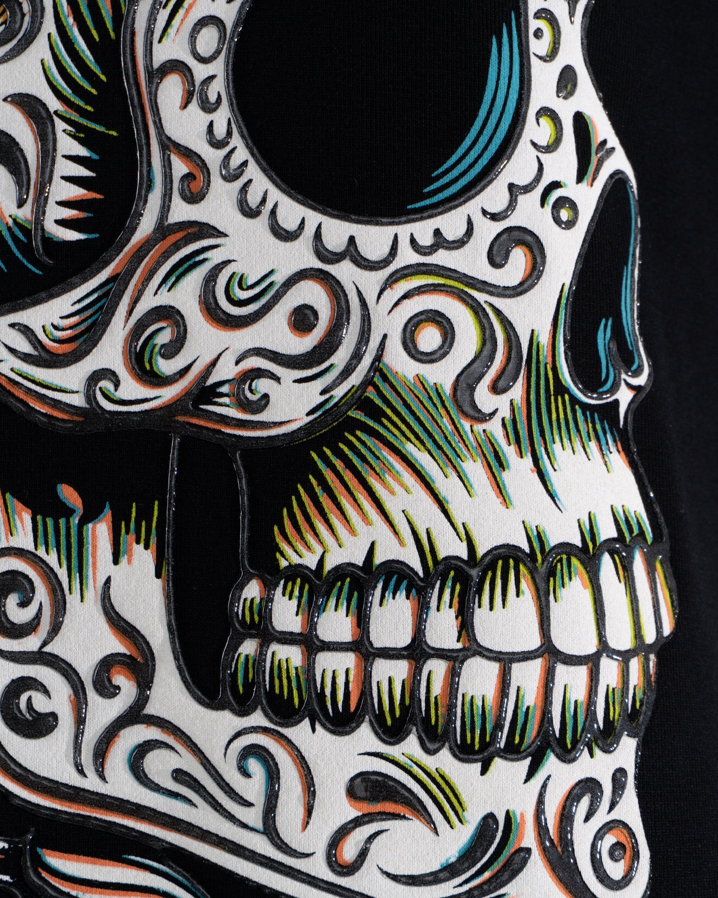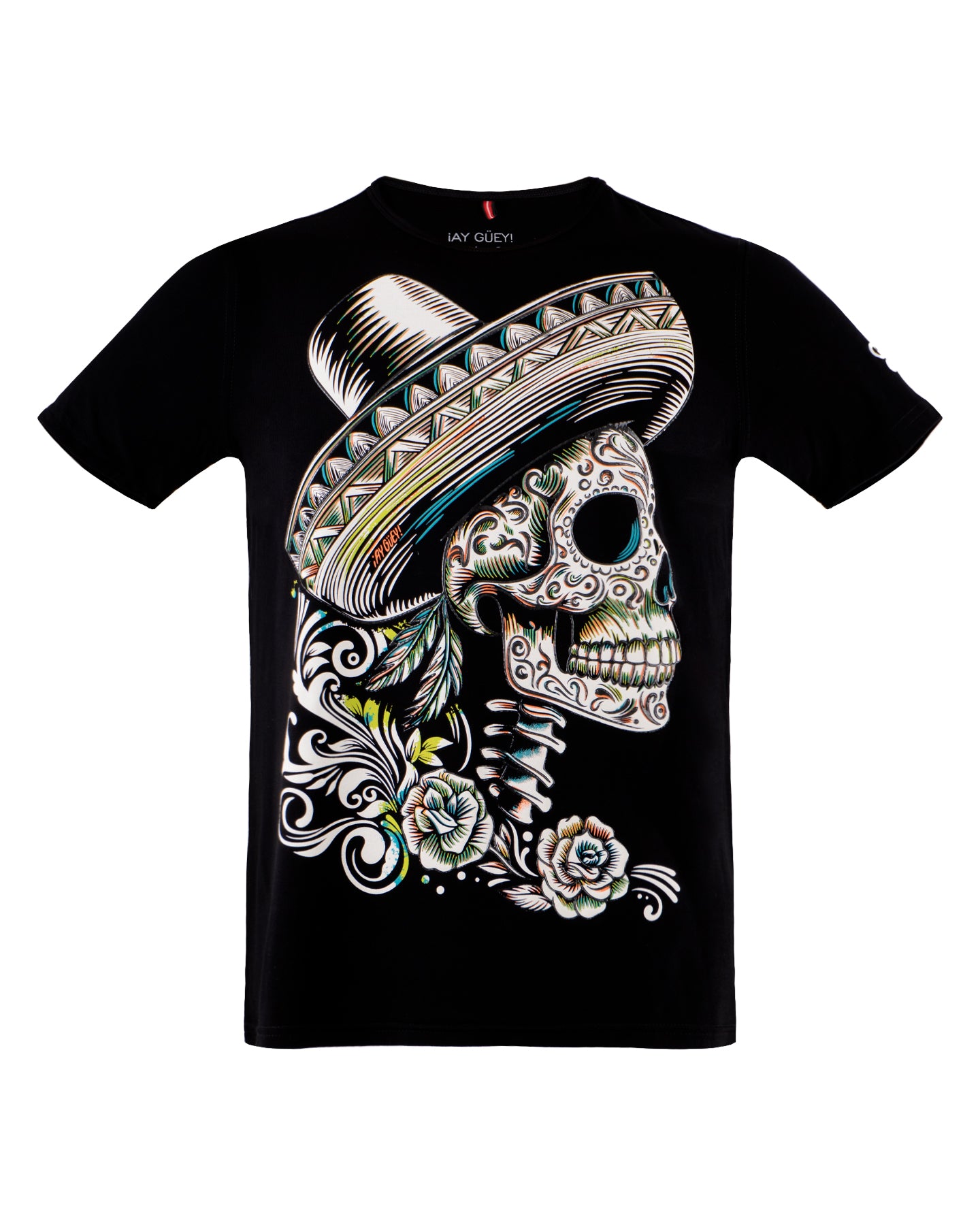 Un tributo al Día de Muertos y a la identidad mexicana, donde la calavera se engalana con flores y un sombrero charro, símbolos de orgullo y tradición. Los detalles ornamentales recuerdan el arte del papel picado y la filigrana, mientras los tonos contrastantes aportan fuerza y modernidad, celebrando la vida a través del color y la memoria.