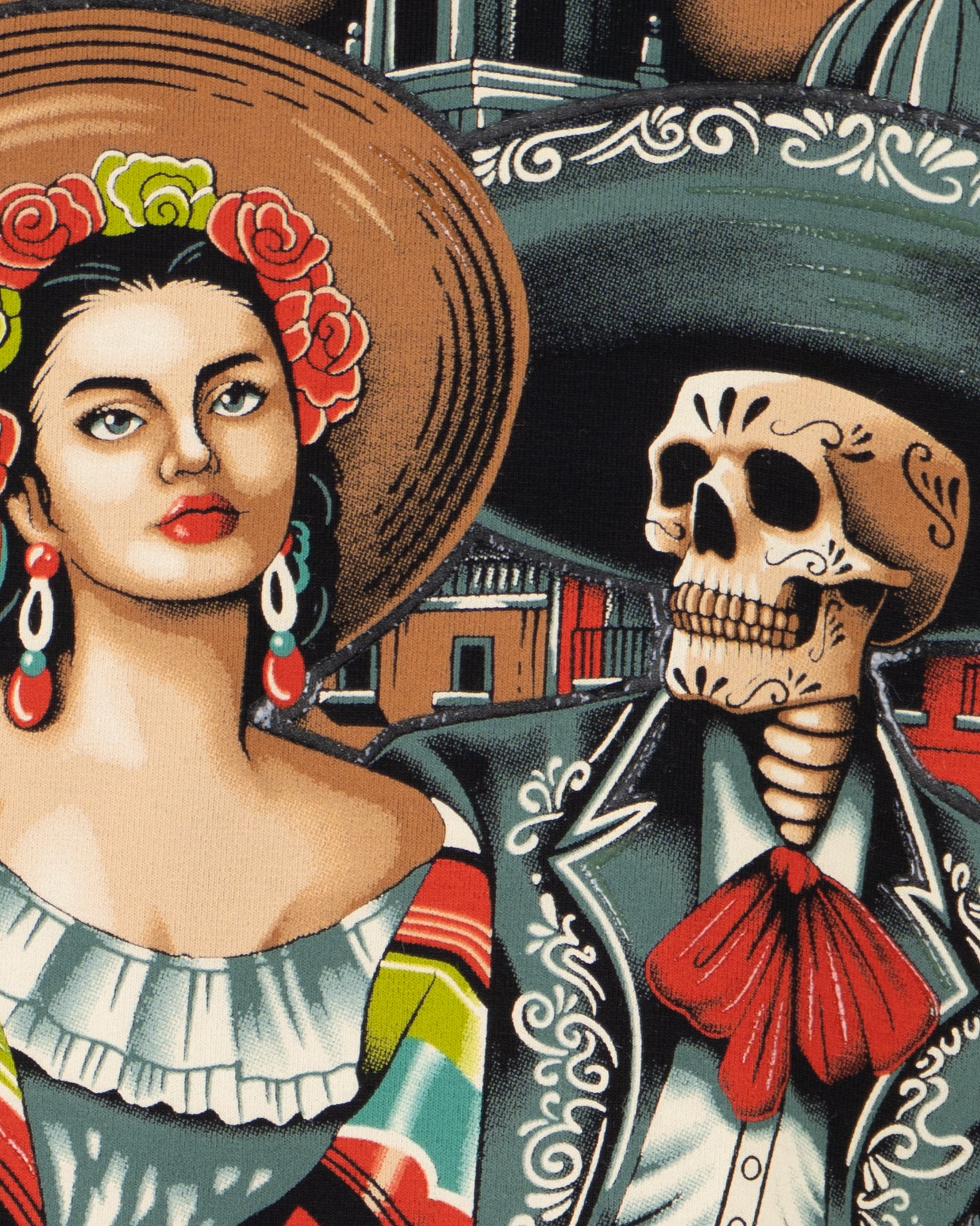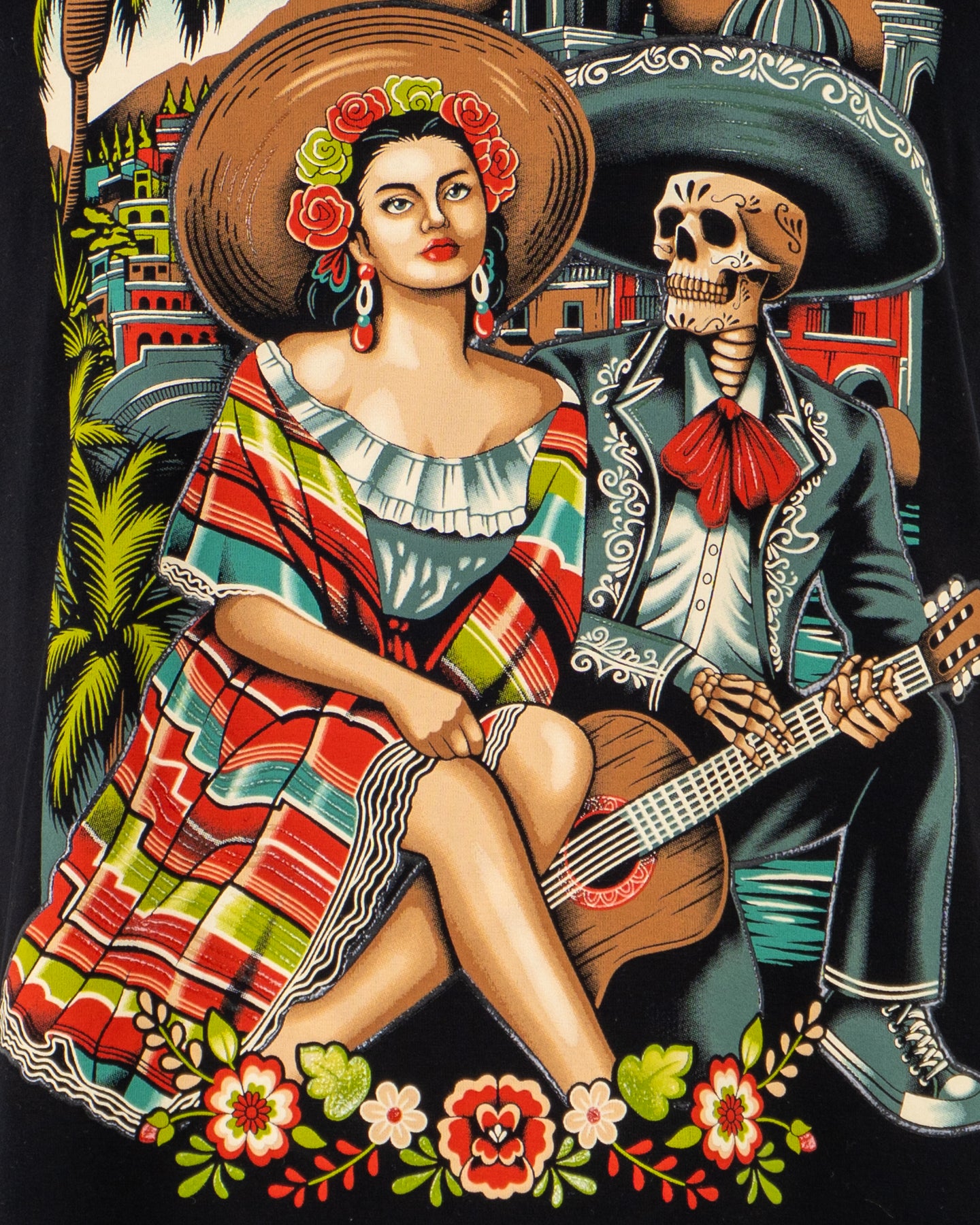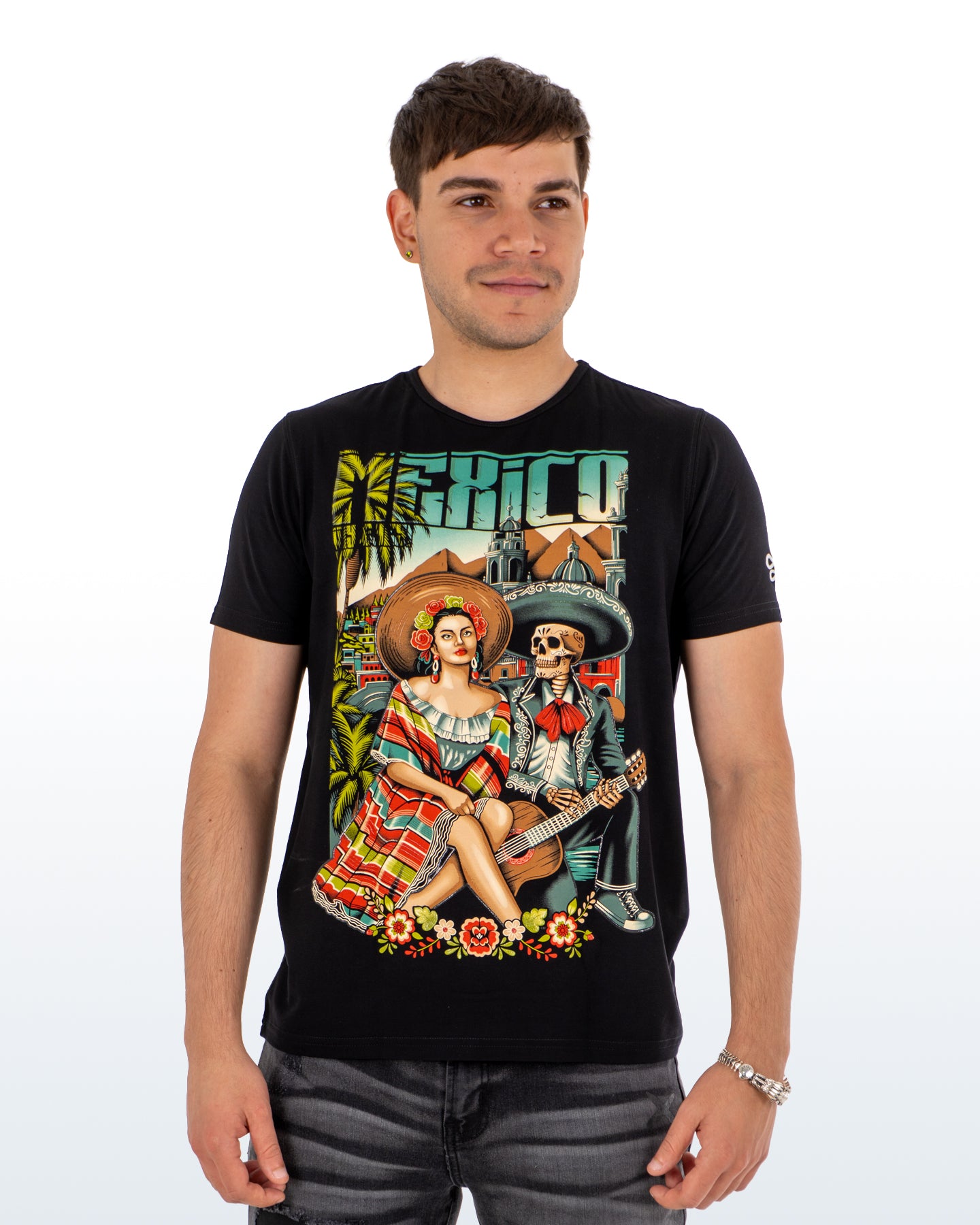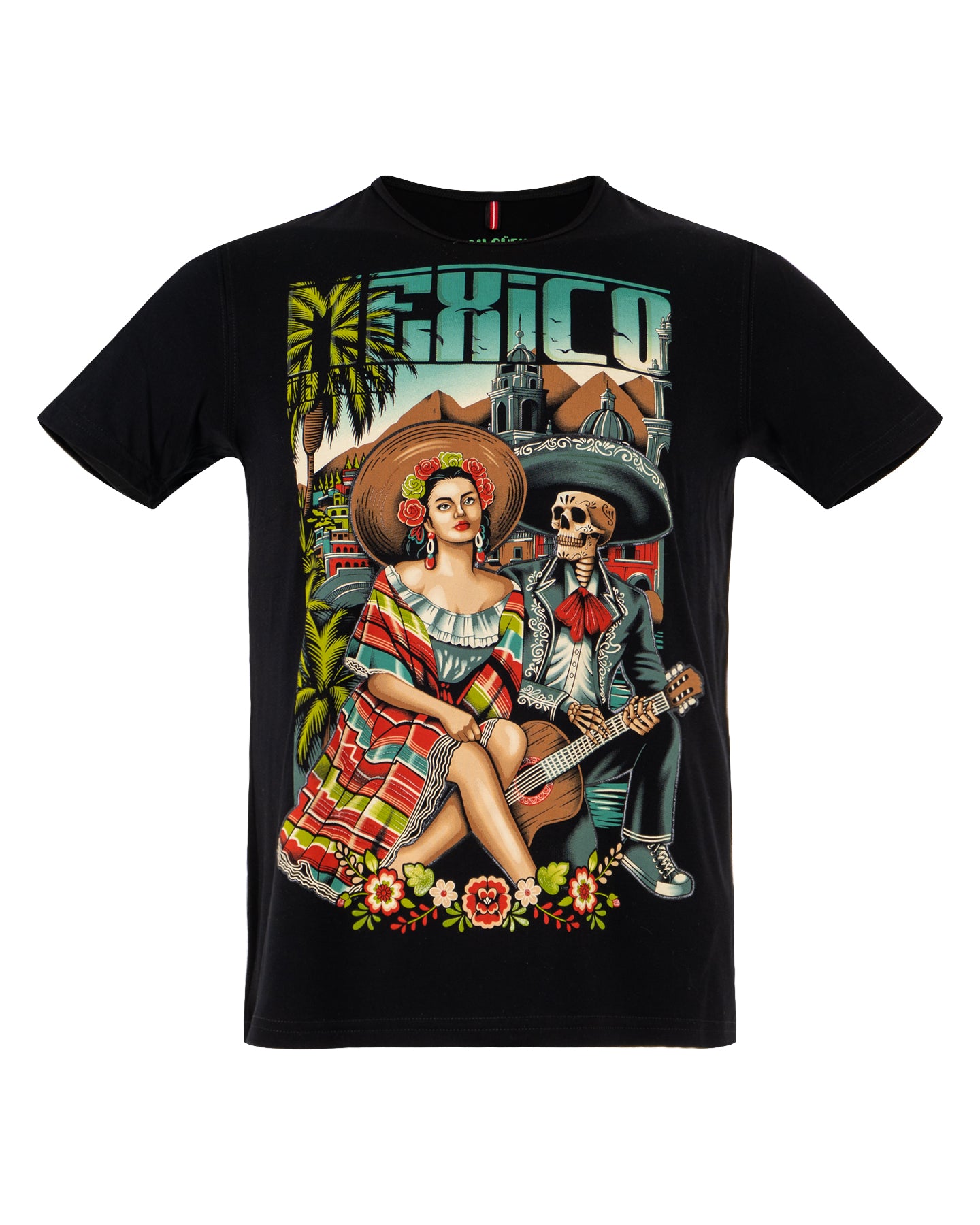 Inspirada en el mestizaje cultural, esta playera fusiona la vida y la muerte. Una mujer en atuendo folclórico y un esqueleto mariachi coexisten, simbolizando la riqueza de las tradiciones mexicanas, desde la celebración del Día de Muertos hasta la música popular. La obra evoca la herencia y el folclore del país.
