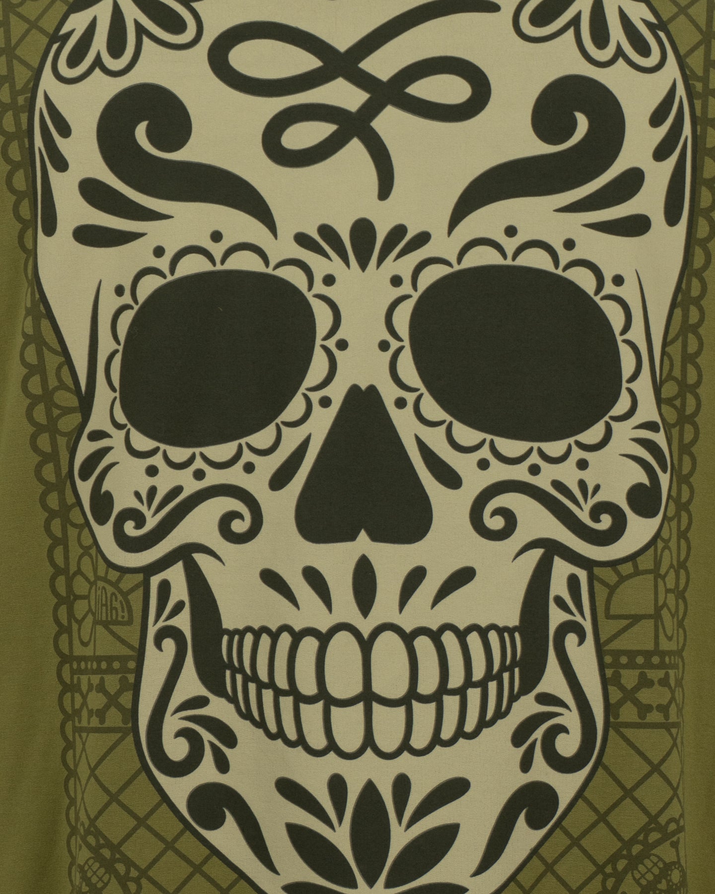 • Espalda Emblemática: Una majestuosa calavera de azúcar (Catrina/Calavera Mexicana) domina la espalda, elaborada con intrincados detalles florales y filigranas, un ícono de la cultura mexicana.