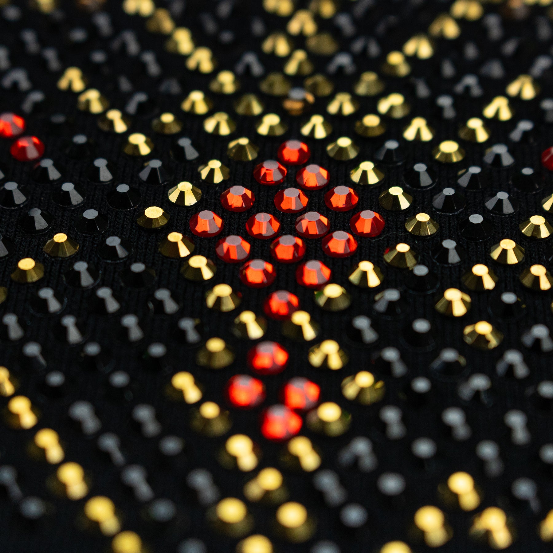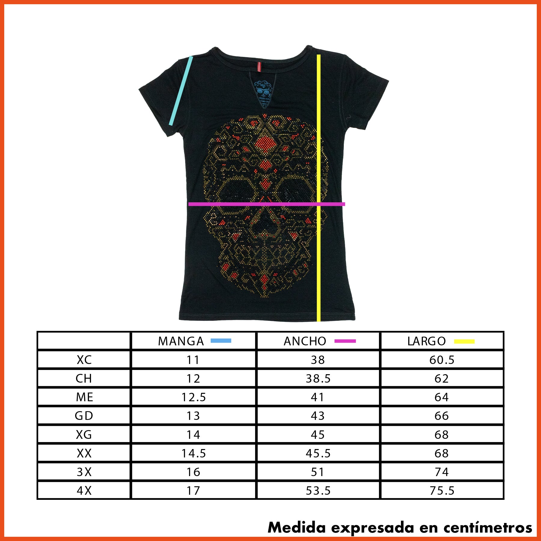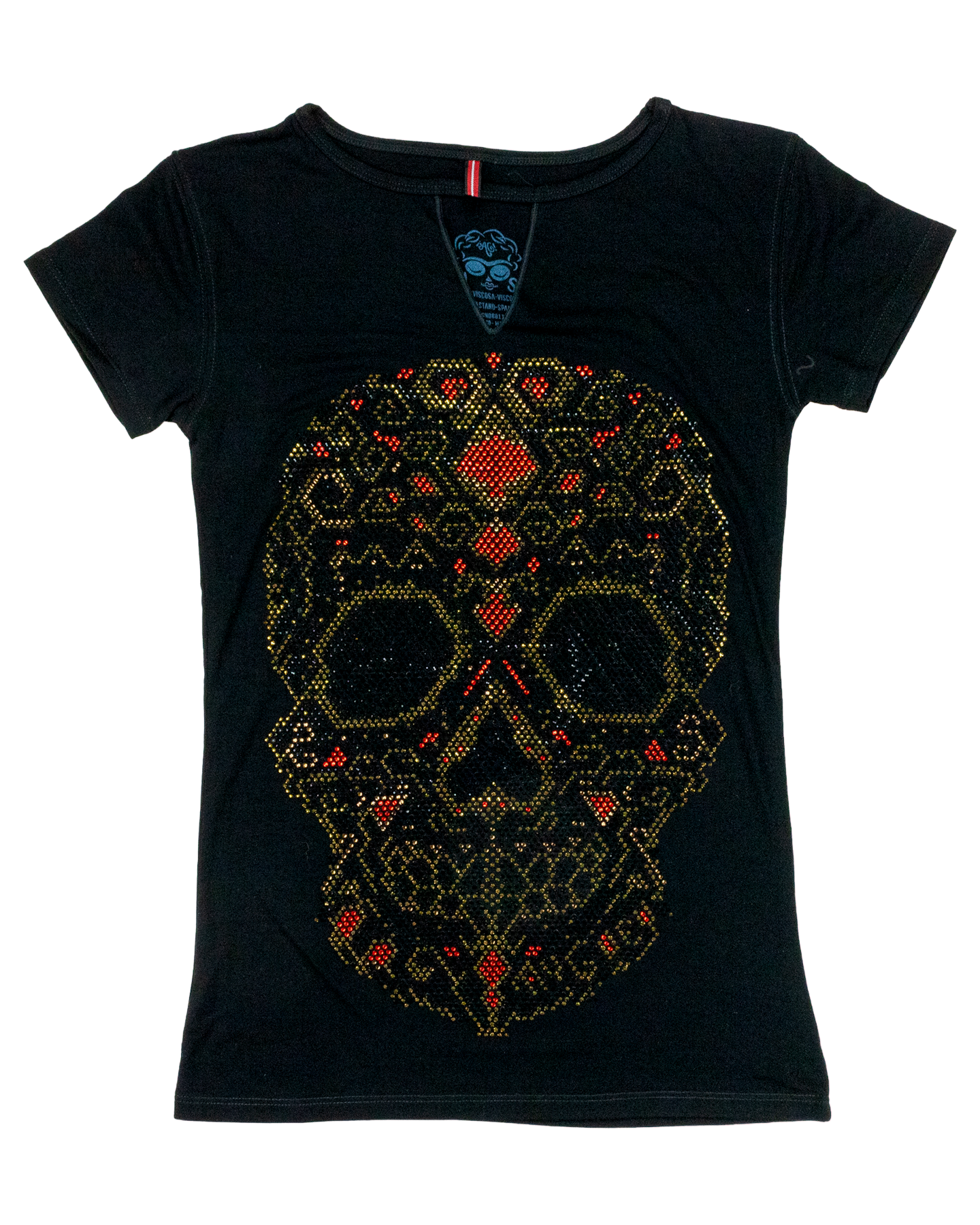 Playera de manga corta con cuello doble negra, con calavera hecha en full pedrería tipo cristal superbrillante.