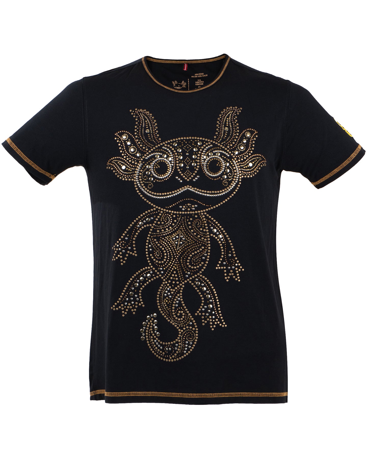 Playera de caballero, cuello redondo, con diseño de ajolote de estoperoles dorados. esta playera es perfecta para unir a la familia en un look único y elegante. Costuras color oro que le dan un toque aún más especial.